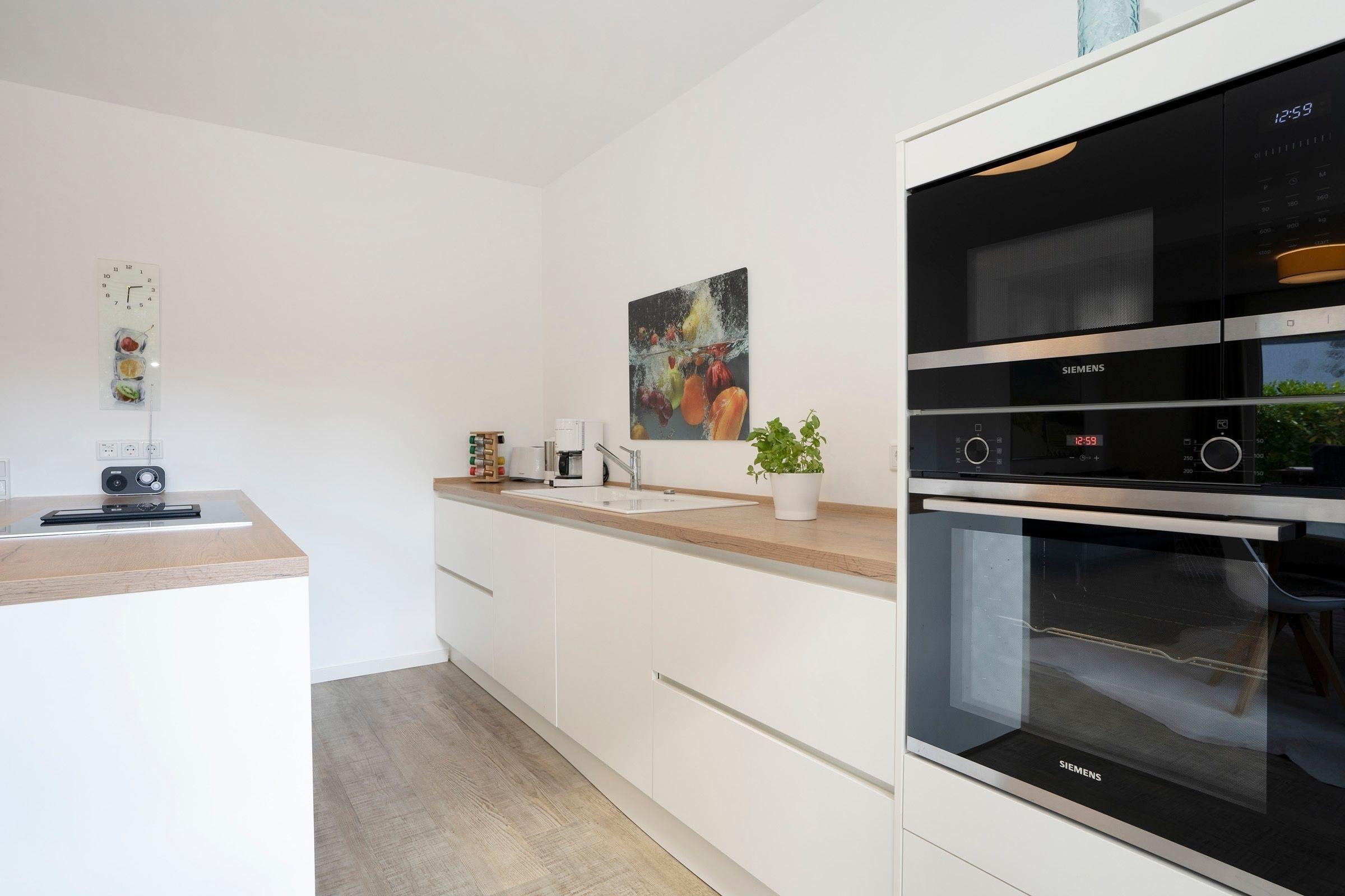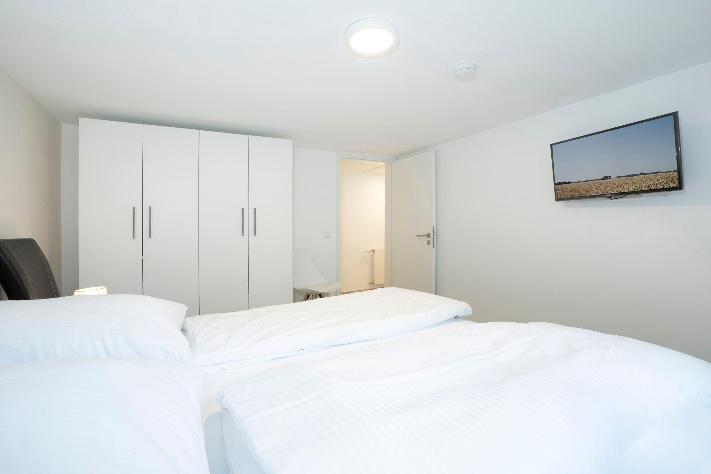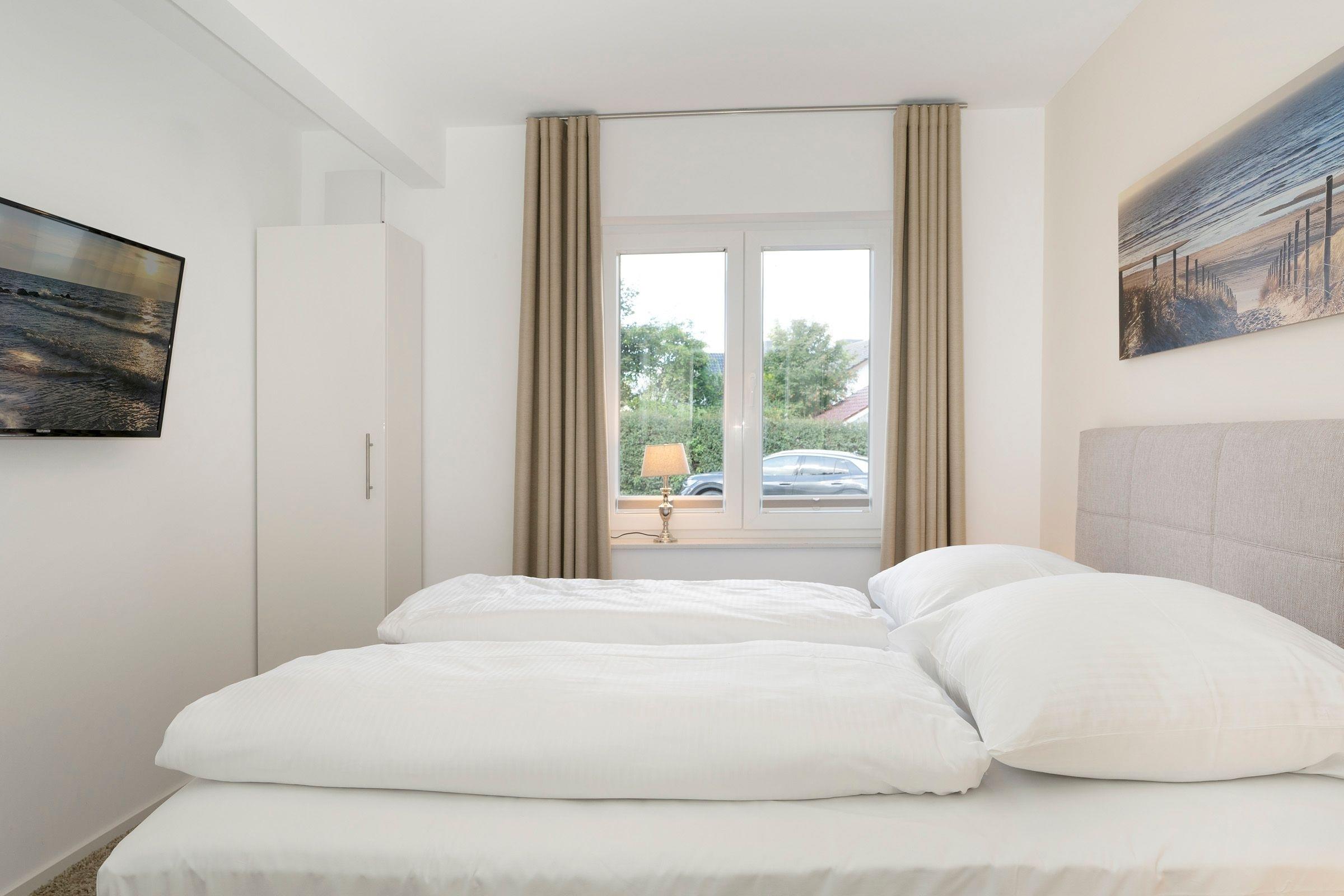 Die Wohnung empfängt Sie im Erdgeschoss mit einem gemütlichen Wohnzimmer sowie angrenzender offener Küche. Hier bereiten Sie Kaffeespezialitäten mit der Nespresso-Kapselmaschine zu, die Sie anschließend an der frischen Ostseeluft auf der Terrasse unter einem Sonnenschirm genießen können. Im Erdgeschoss befindet sich das erste Schlafzimmer mit gemütlichem Boxspring-Doppelbett (180x200 cm) und ein voll ausgestattetes Badezimmer mit bodengleicher Walk-In-Dusche und angenehmer Fußbodenheizung. Über eine Treppe gelangen Sie in die untere Etage mit eigener Sauna für kalte Winterabende. Hier gibt es außerdem ein zweites Bad mit Badewanne und bodengleicher Dusche sowie ein weiteres Schlafzimmer - ebenso mit einem Boxspring-Doppelbett (180x200 cm) ausgestattet. Der WLAN-Anschluss ist inklusive.