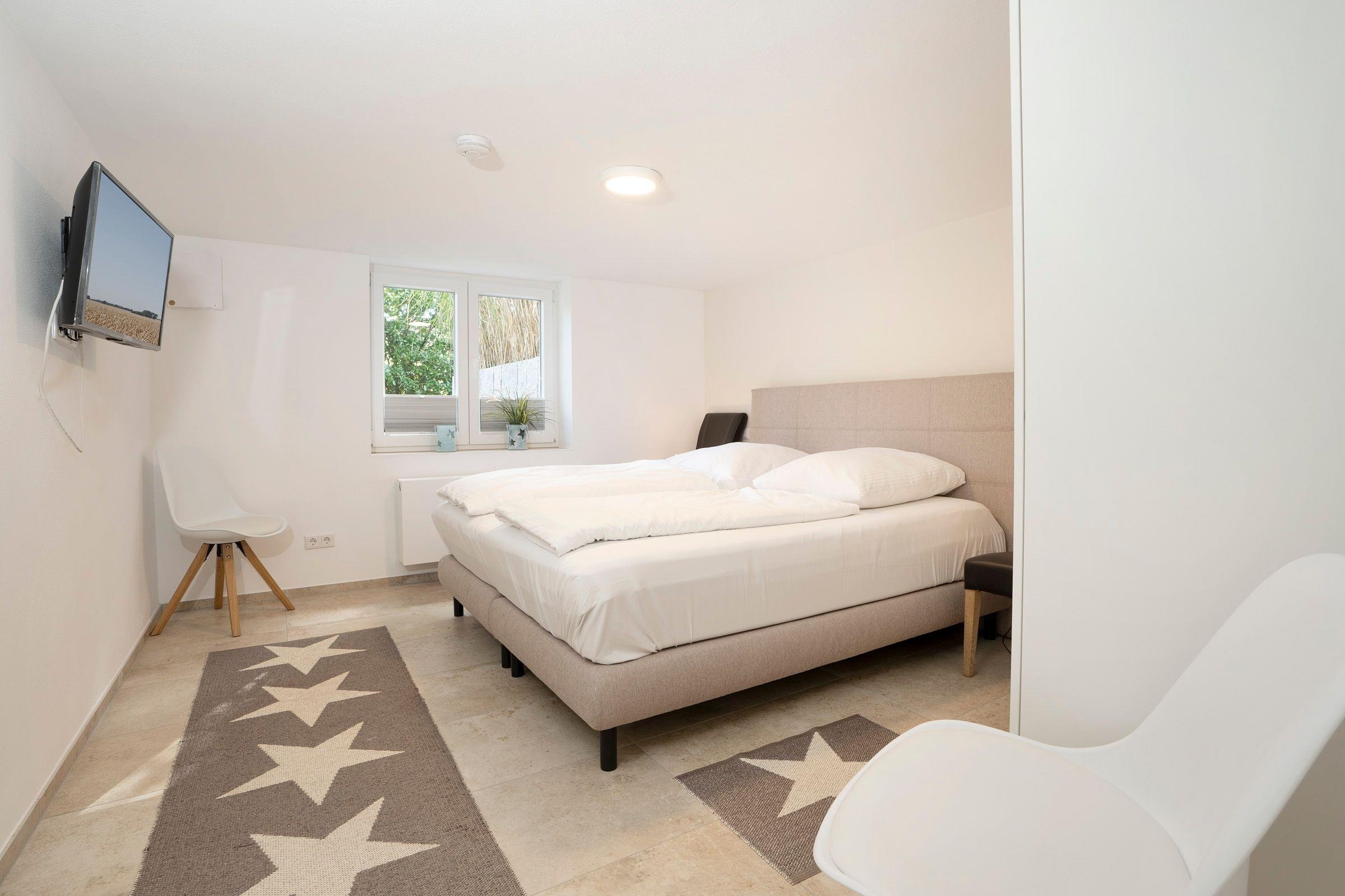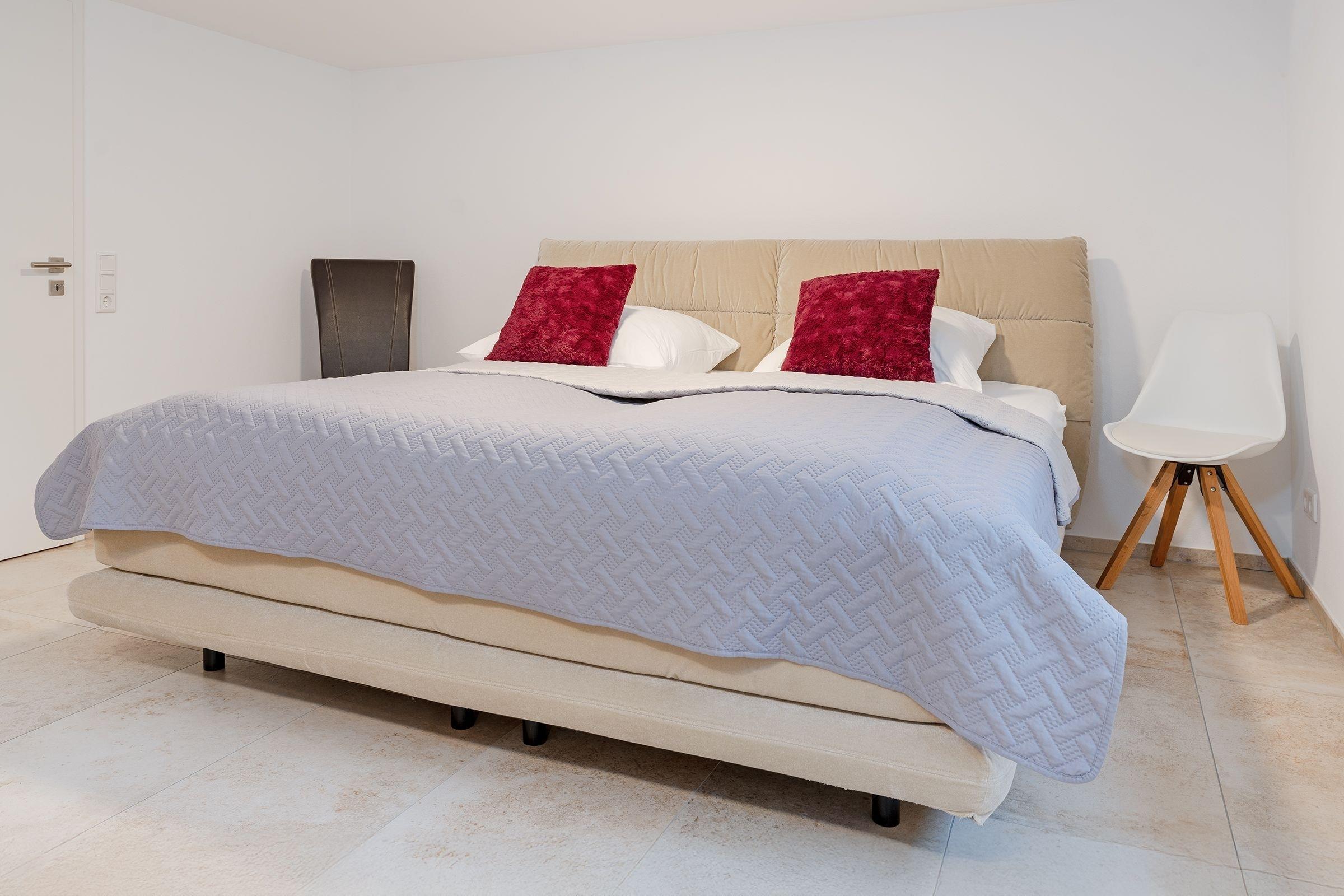 Schlafzimmer 2: Boxspringdoppelbett (180x200 cm, durchgehender Topper), Kleiderschrank, keine Verdunkelung, kein Platz für Kinderreisebett