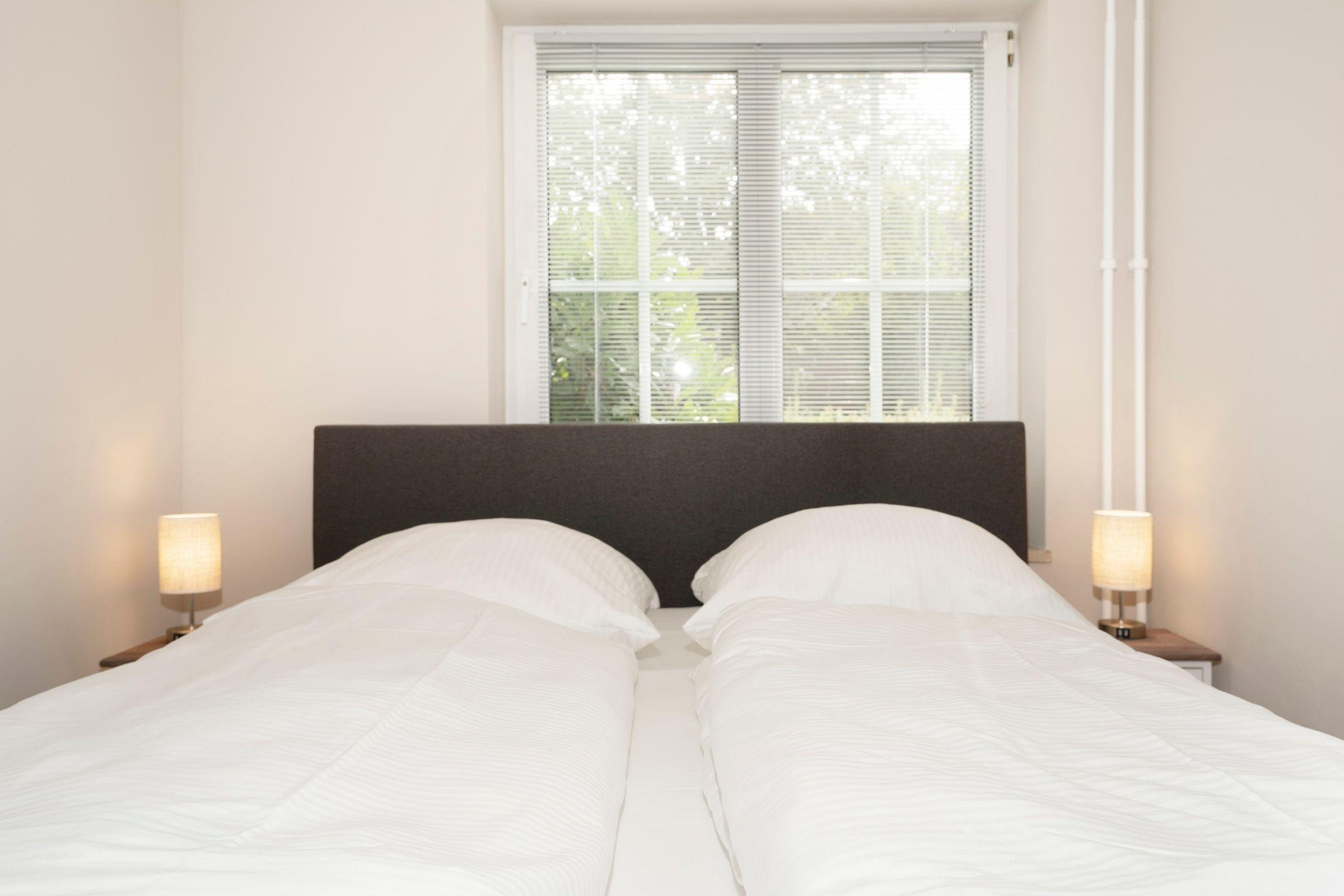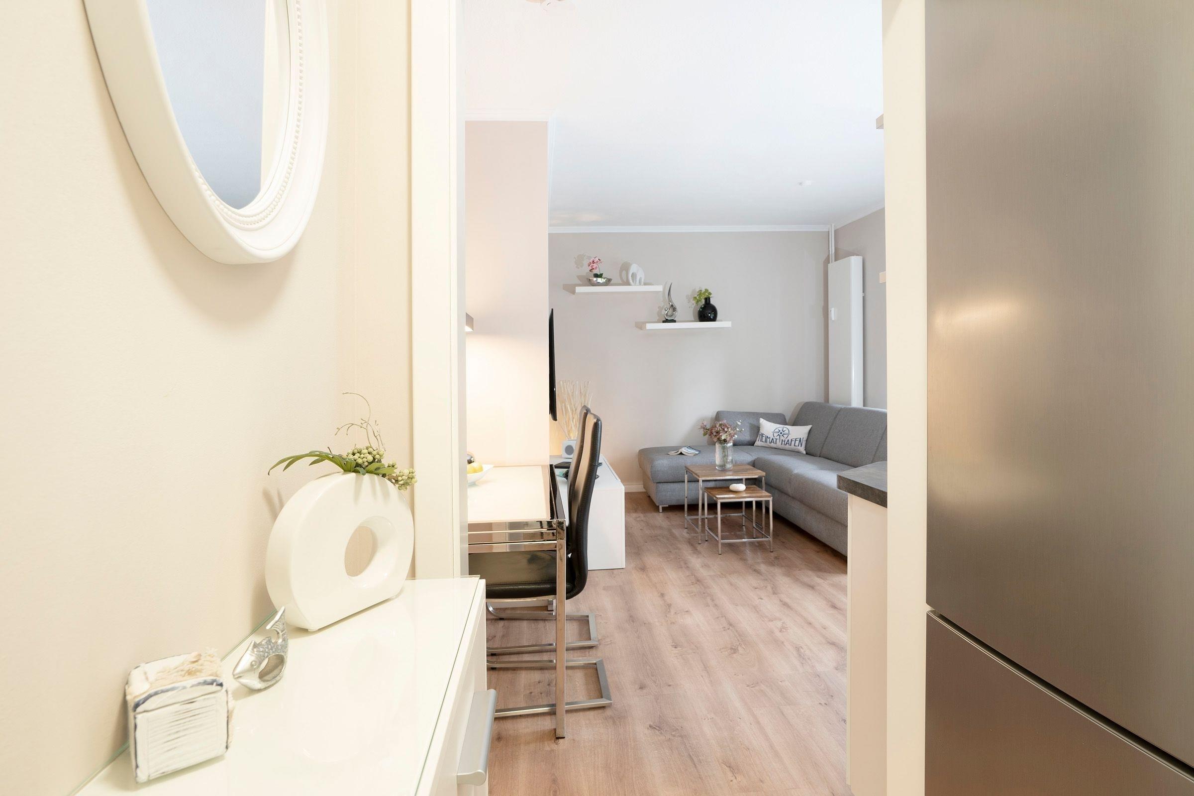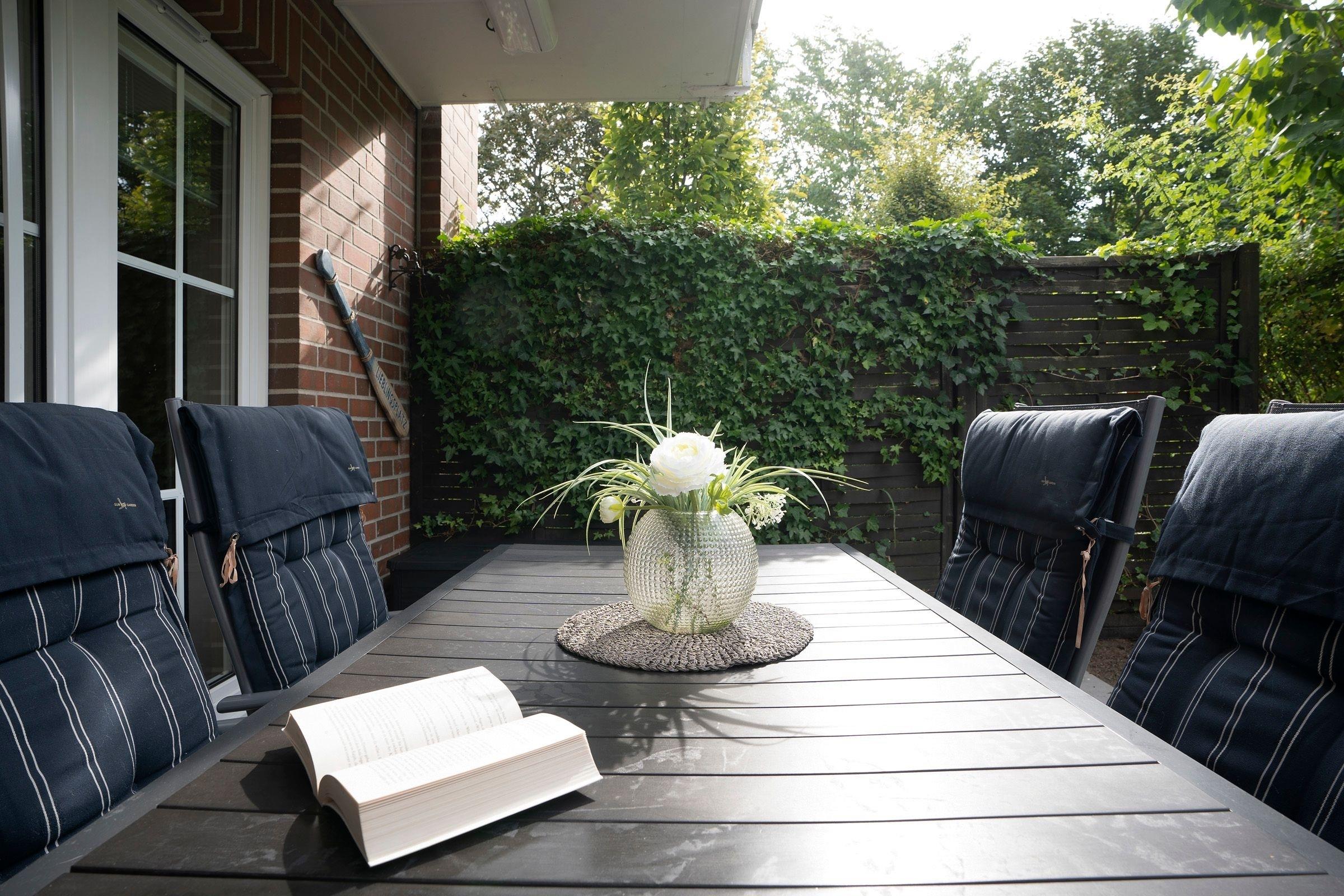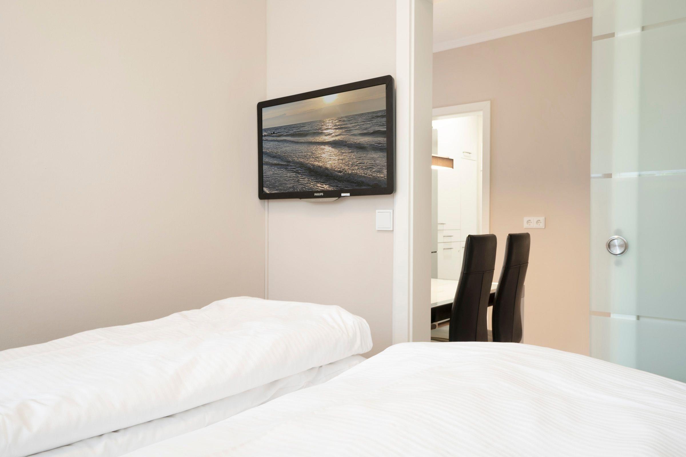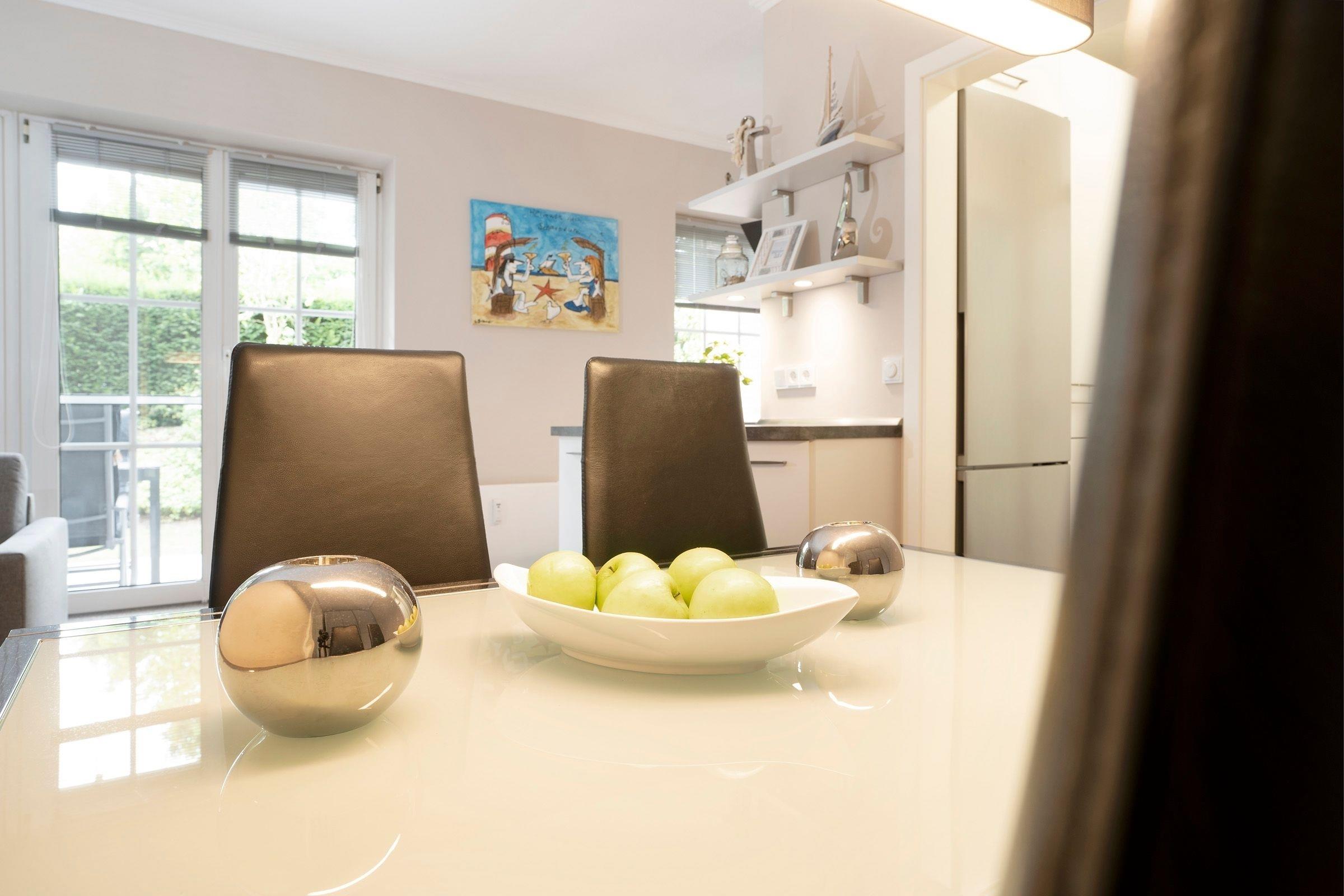 Im Wohnraum befinden sich eine hochwertige Couchgarnitur (Ottomane), welche zu einem Doppelbett (140x200 cm) ausgezogen werden kann. Ein DAB+-Internetradio mit Bluetooth, ein 55 Zoll Smart-TV und eine Spielesammlung lassen keine Langeweile aufkommen. Die moderne, sehr gut ausgestattete Einbauküche ist in den Wohnbereich integriert und mit den notwendigen Alltagshelfern und sogar einem Waffeleisen voll ausgestattet. Am Esstisch finden 4 Personen Platz. Im separaten Schlafzimmer sorgt ein Doppelbett (160x200 cm) für erholsame Nachtruhe. Außerdem ist das Schlafzimmer zusätzlich mit einem TV ausgestattet. Das hell geflieste Badezimmer mit Dusche und Haartrockner rundet das Angebot dieser Ferienwohnung ab. Die nicht einsehbare, windgeschützte Terrasse mit Markise bietet eine schöne Süd-Ausrichtung und verfügt über Gartenmöbel (Gartentisch mit 4 Stühle, 2 Relax-Liegestühle und 2 Liegen) mit Polsterauflagen.