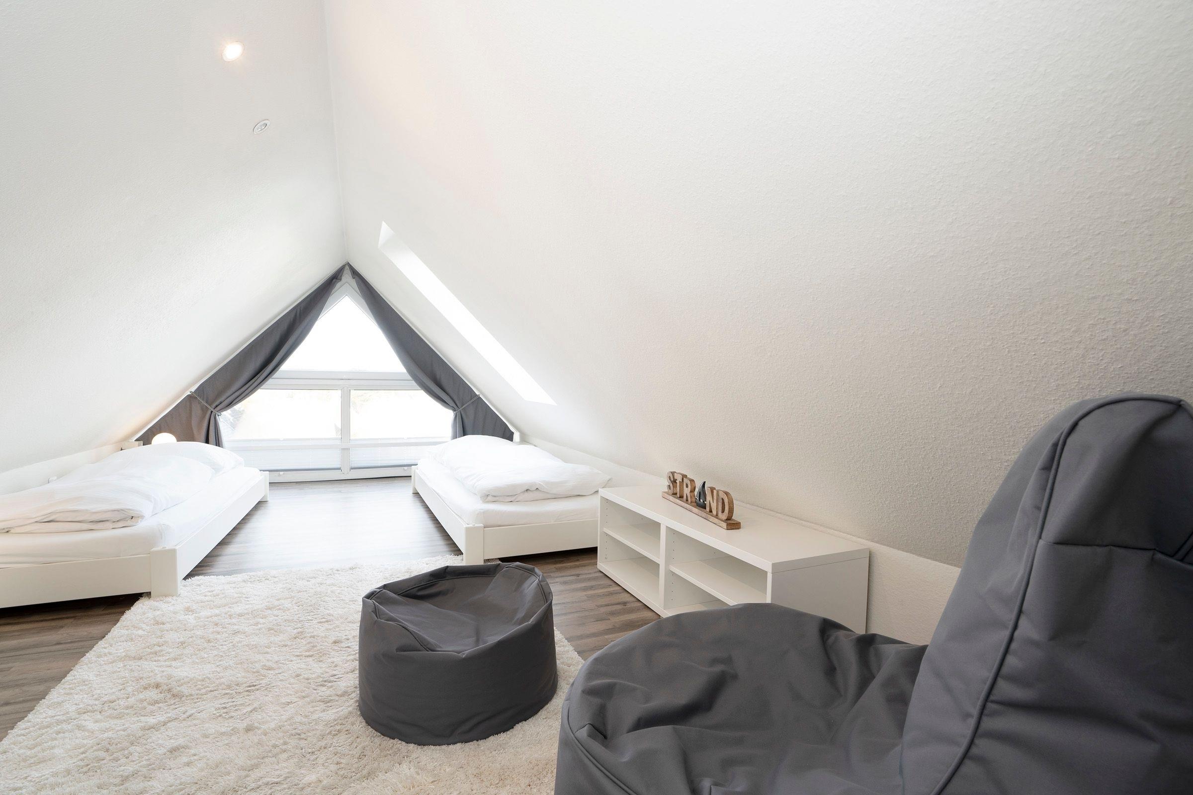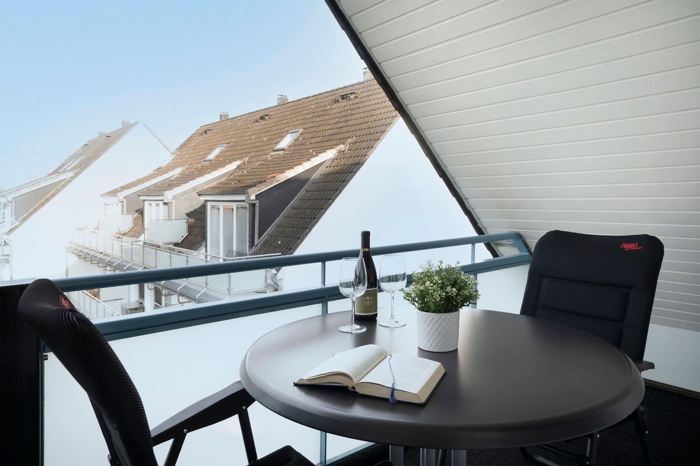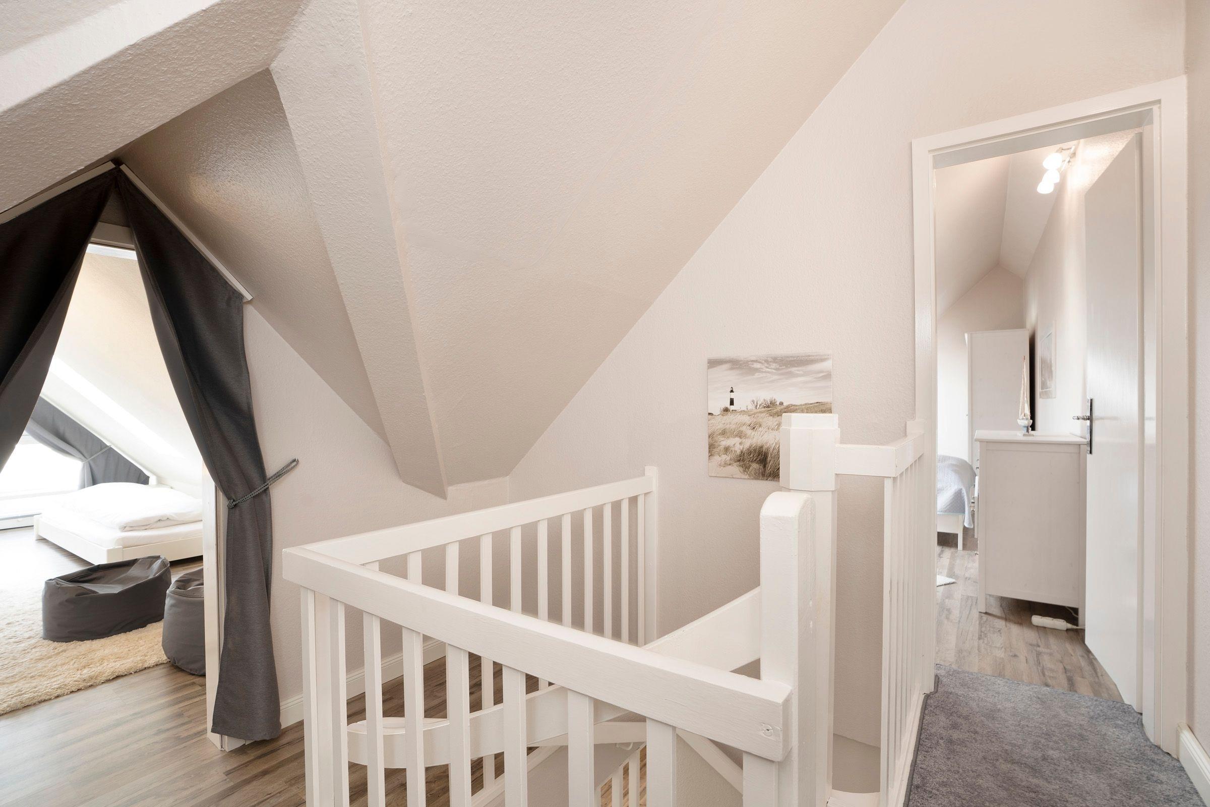 Vom Flur aus gelangen Sie in den Wohnbereich. Dieser ist hell und geschmackvoll eingerichtet und umfasst neben der gemütlichen Couch einen Flachbild-TV, die integrierte Küchenzeile sowie einen geräumigen Essplatz, an dem alle zusammensitzen und die Mahlzeiten gemeinsam einnehmen können. Der überdachte, möblierte Balkon lädt zu zahlreichen Sonnenstunden an der frischen Luft ein. Ebenfalls auf dieser Etage befindet sich das moderne Badezimmer mit Badewanne inklusive Duschfunktion. Eine Wendeltreppe führt in den oberen Schlafbereich, der im 1. Schlafzimmer mit einem Doppelbett (2x 90x200 cm) und im 2. Schlafzimmer mit 2 Einzelbetten (je 90x200 cm) ausgestattet ist. In der Wohnung steht Ihnen ein mobiler klappbarer Schreibtisch zur Verfügung, der bei Bedarf im Schlaf- oder Kinderzimmer aufgestellt werden kann. So ist auch Arbeiten im Urlaub möglich, ohne den Essplatz zu belegen.