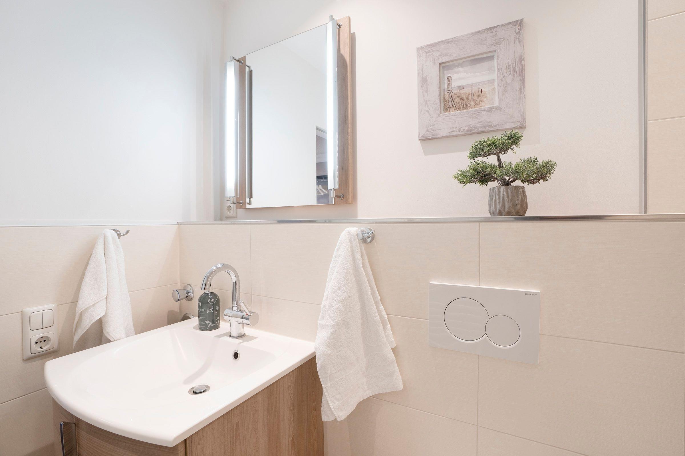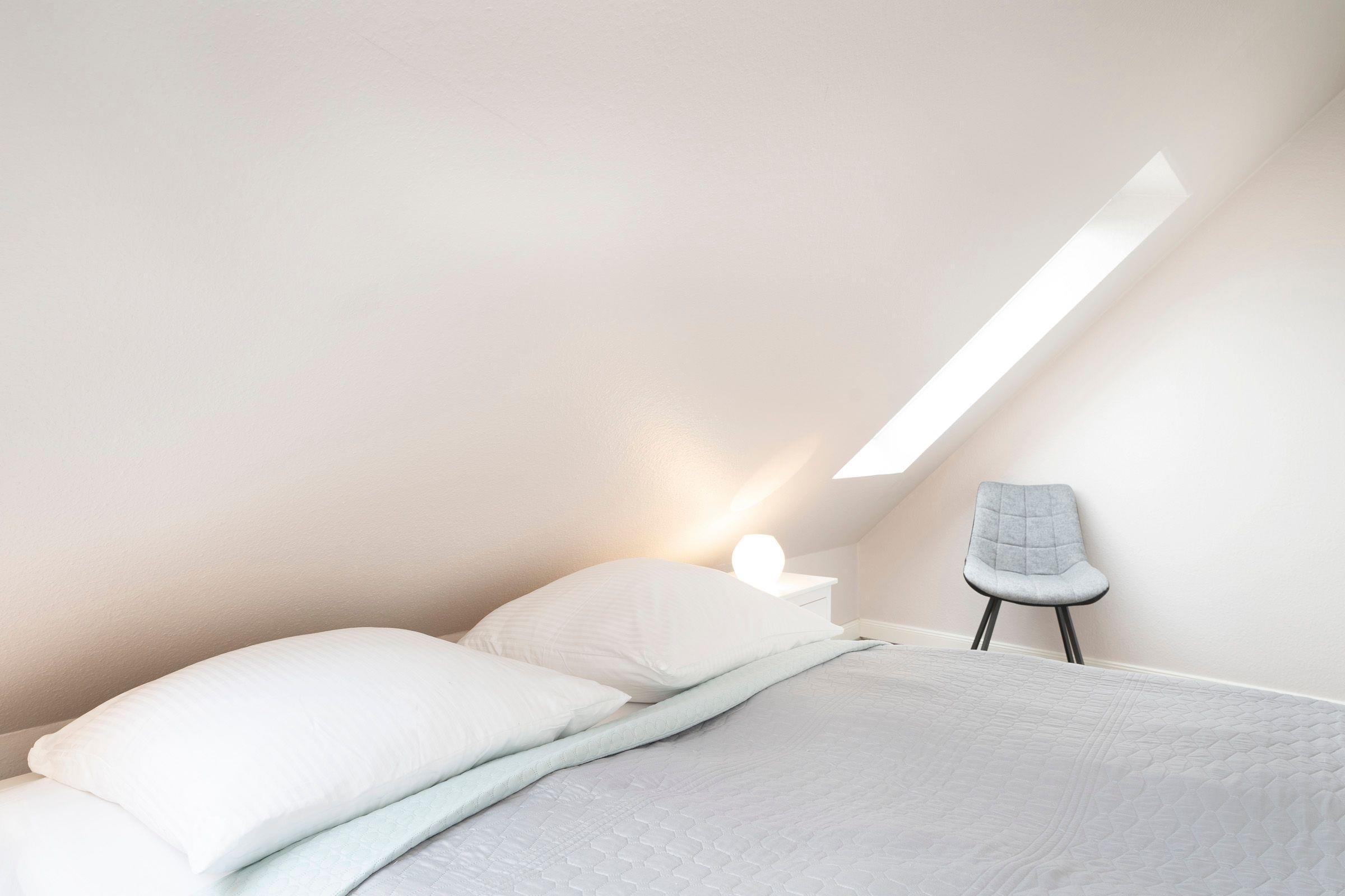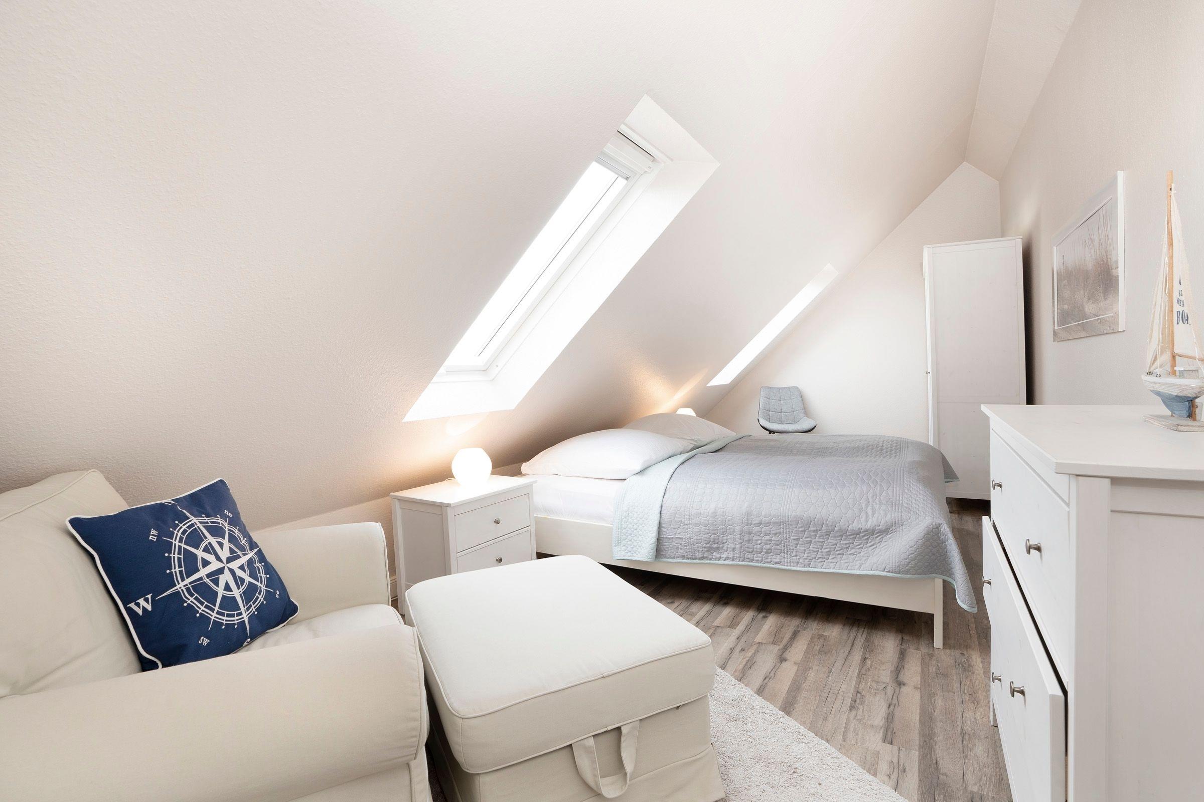 Vom Flur aus gelangen Sie in den Wohnbereich. Dieser ist hell und geschmackvoll eingerichtet und umfasst neben der gemütlichen Couch einen Flachbild-TV, die integrierte Küchenzeile sowie einen geräumigen Essplatz, an dem alle zusammensitzen und die Mahlzeiten gemeinsam einnehmen können. Der überdachte, möblierte Balkon lädt zu zahlreichen Sonnenstunden an der frischen Luft ein. Ebenfalls auf dieser Etage befindet sich das moderne Badezimmer mit Badewanne inklusive Duschfunktion. Eine Wendeltreppe führt in den oberen Schlafbereich, der im 1. Schlafzimmer mit einem Doppelbett (2x 90x200 cm) und im 2. Schlafzimmer mit 2 Einzelbetten (je 90x200 cm) ausgestattet ist. In der Wohnung steht Ihnen ein mobiler klappbarer Schreibtisch zur Verfügung, der bei Bedarf im Schlaf- oder Kinderzimmer aufgestellt werden kann. So ist auch Arbeiten im Urlaub möglich, ohne den Essplatz zu belegen.