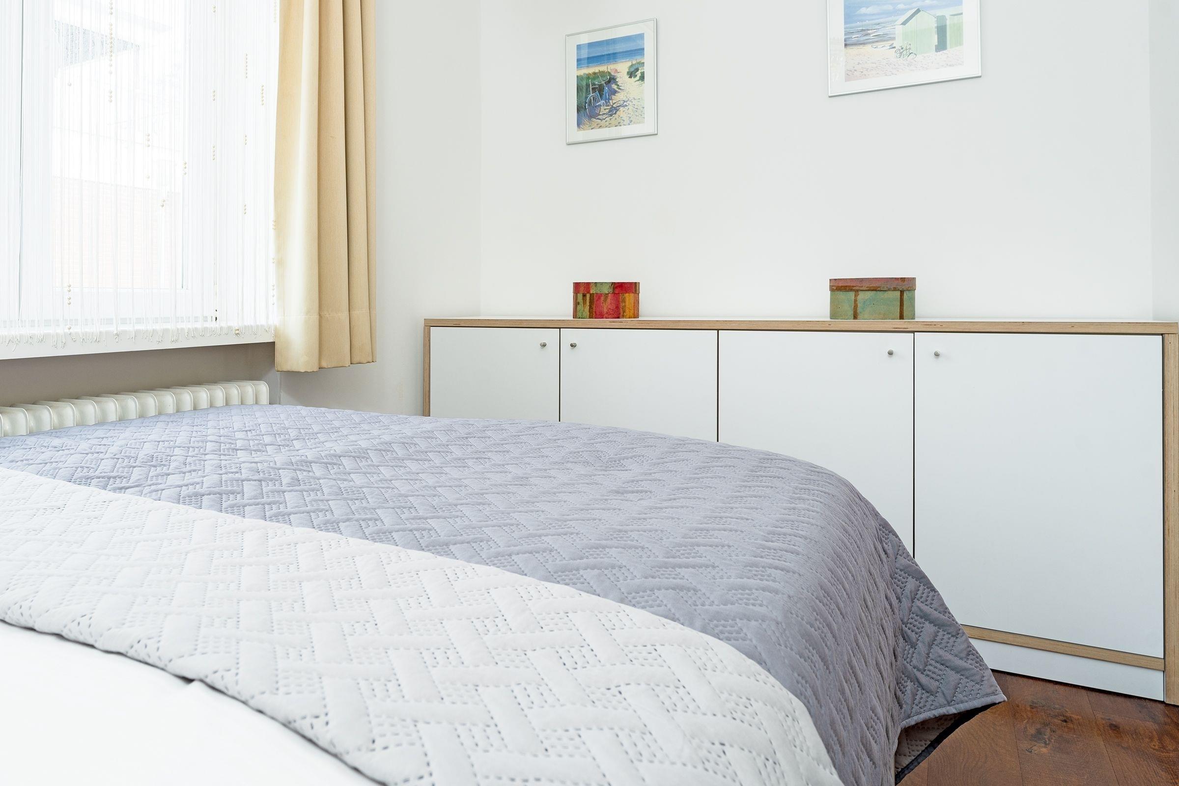 Schlafzimmer: 1 Doppelbett (140x200 cm), Kommode, Verdunkelung: Vorhang, kein Platz für ein Kinderreisebett vorhanden.