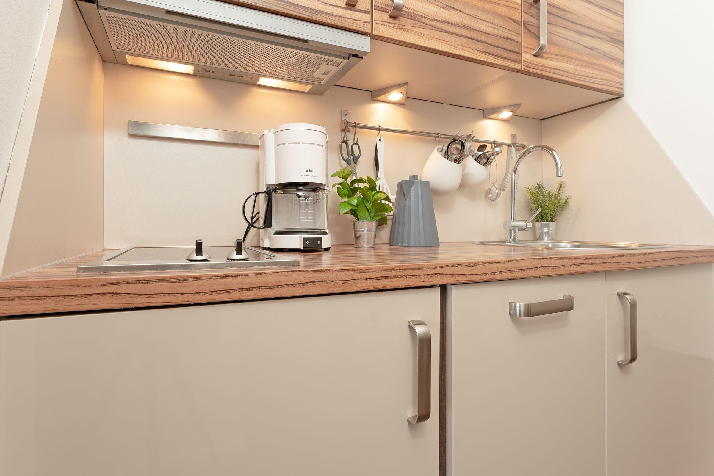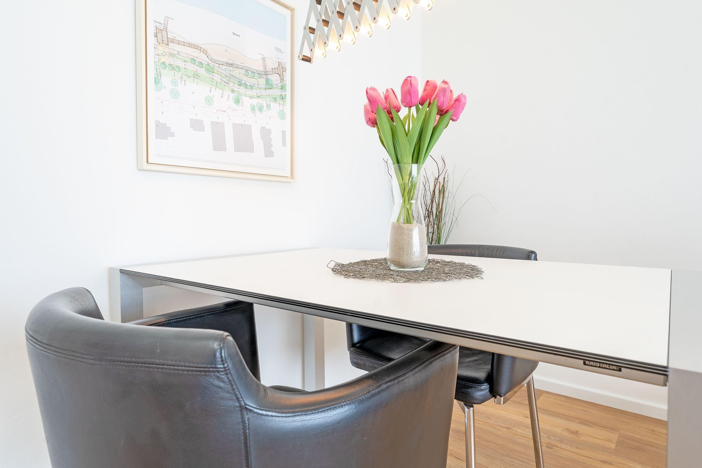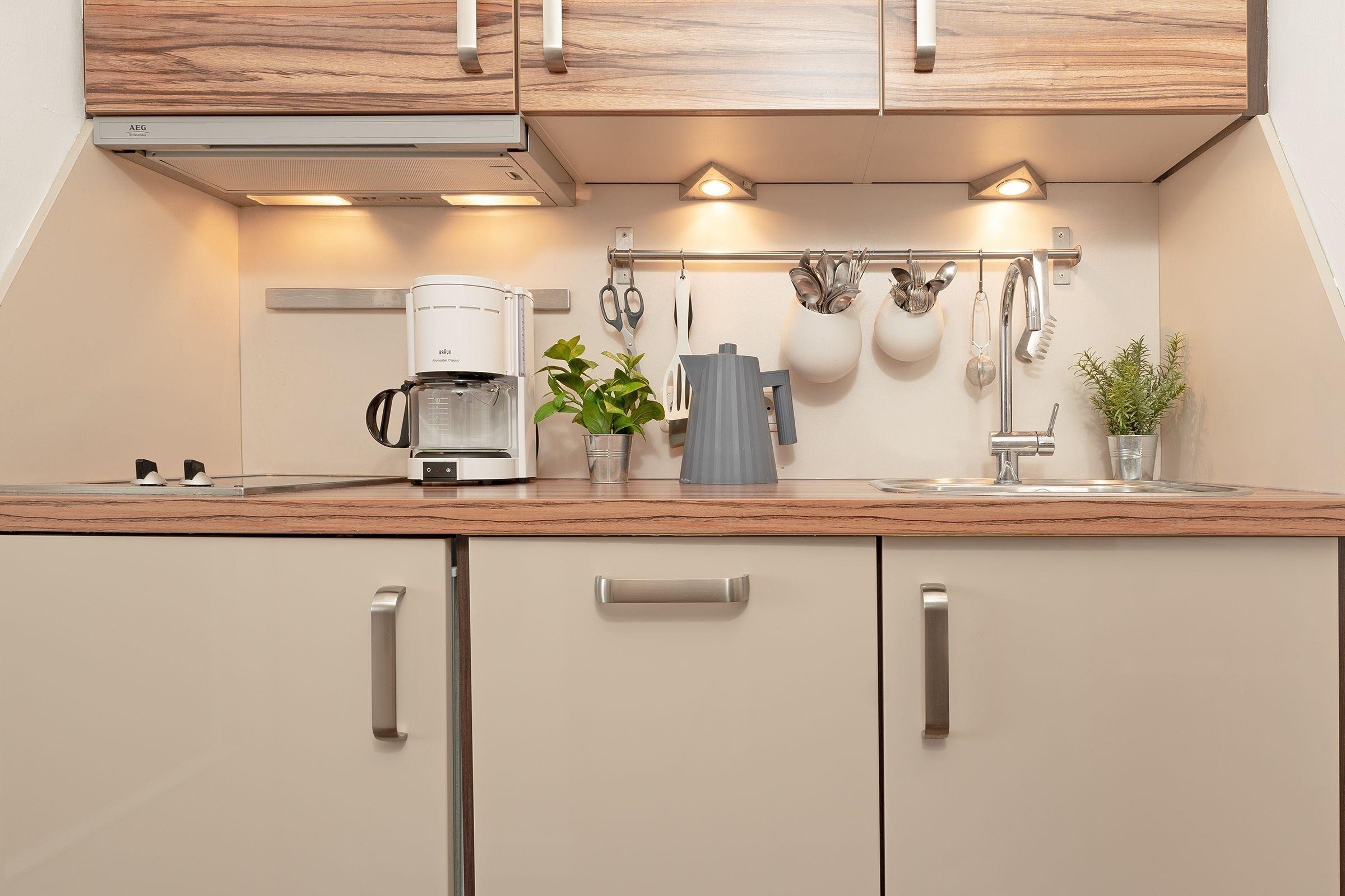 Im Flur befindet sich die funktionale und mit vielen Annehmlichkeiten ausgestattete Küchenzeile. Die dort zubereiteten Mahlzeiten können Sie im Wohnzimmer am Esstisch einnehmen.