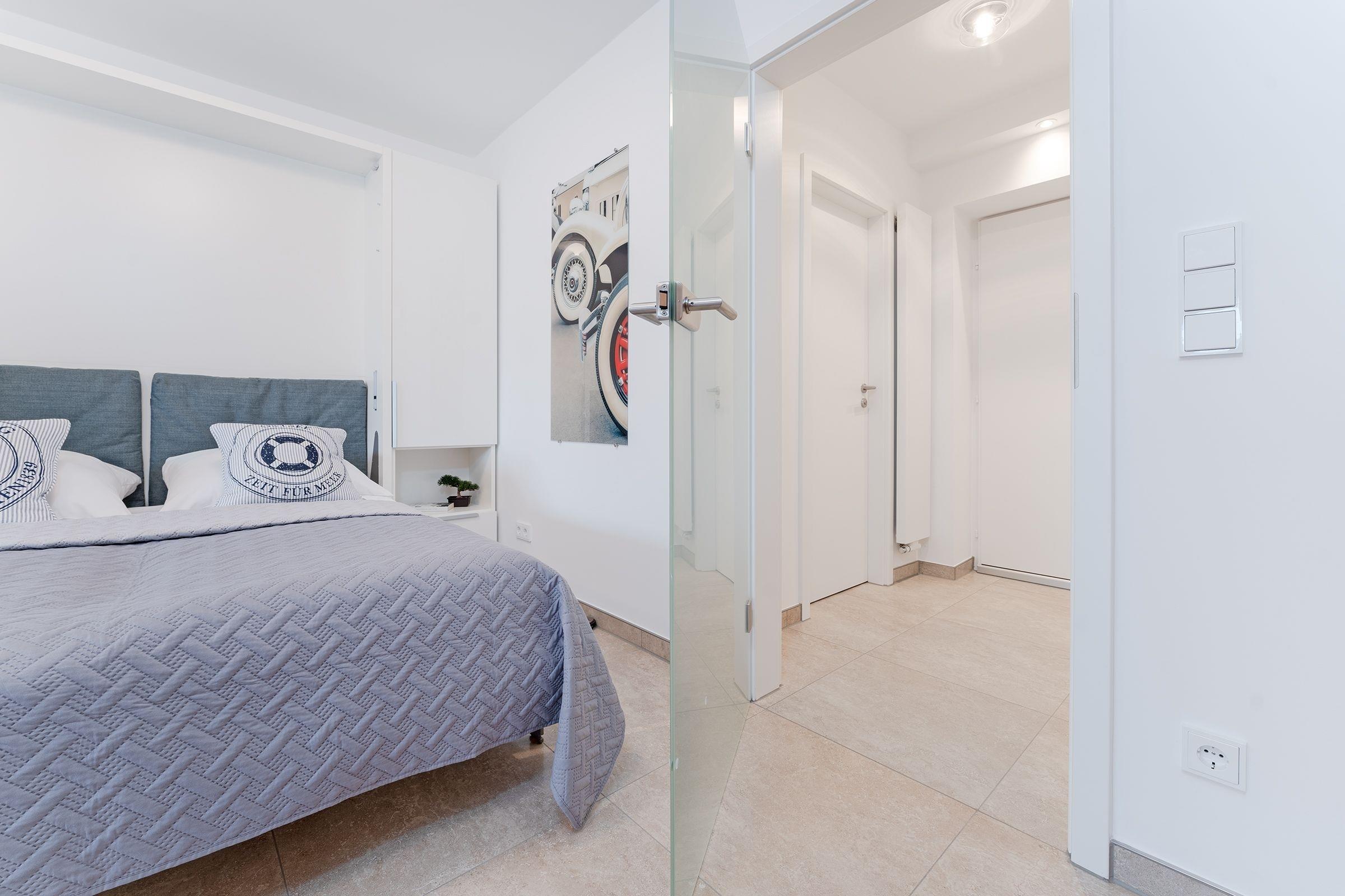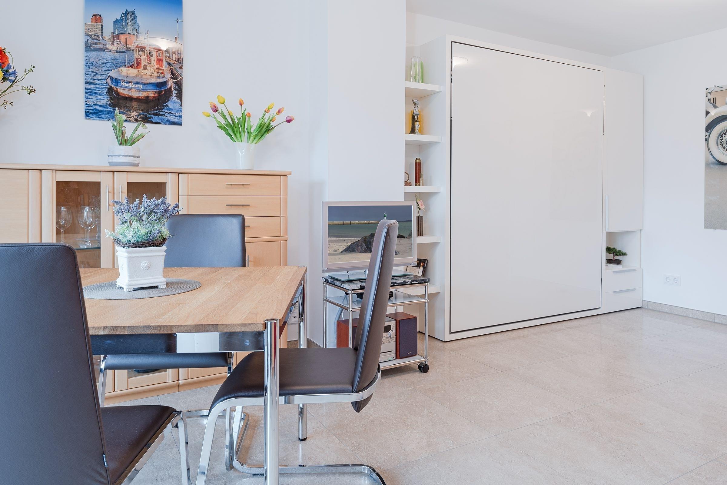 Mit dem Aufzug gelangen Sie bequem in den zweiten Stock des Mehrparteienhauses und betreten Ihre Ferienwohnung. Das kombinierte Wohn-Schlafzimmer bietet Ihnen unter anderem Zugang zum möblierten Südbalkon mit Markise, ein komfortables, platzsparendes Schrankbett (ca. 160x200 cm)) sowie eine praktische Essecke und TV. Die separate Küche mit Tageslicht befindet sich gleich nebenan und ist gut ausgestattet - Kaffee-Liebhaber werden sich hier über die Nespresso-Kapselmaschine und eine French-Press freuen. Um erfrischt in den Tag zu starten, statten Sie dem Tageslichtbadezimmer mit Regendusche und Haartrockner einen kurzen Besuch ab. Für die Urlaubswäsche stehen eine Gemeinschaftswaschmaschine und -trockner bereit.
