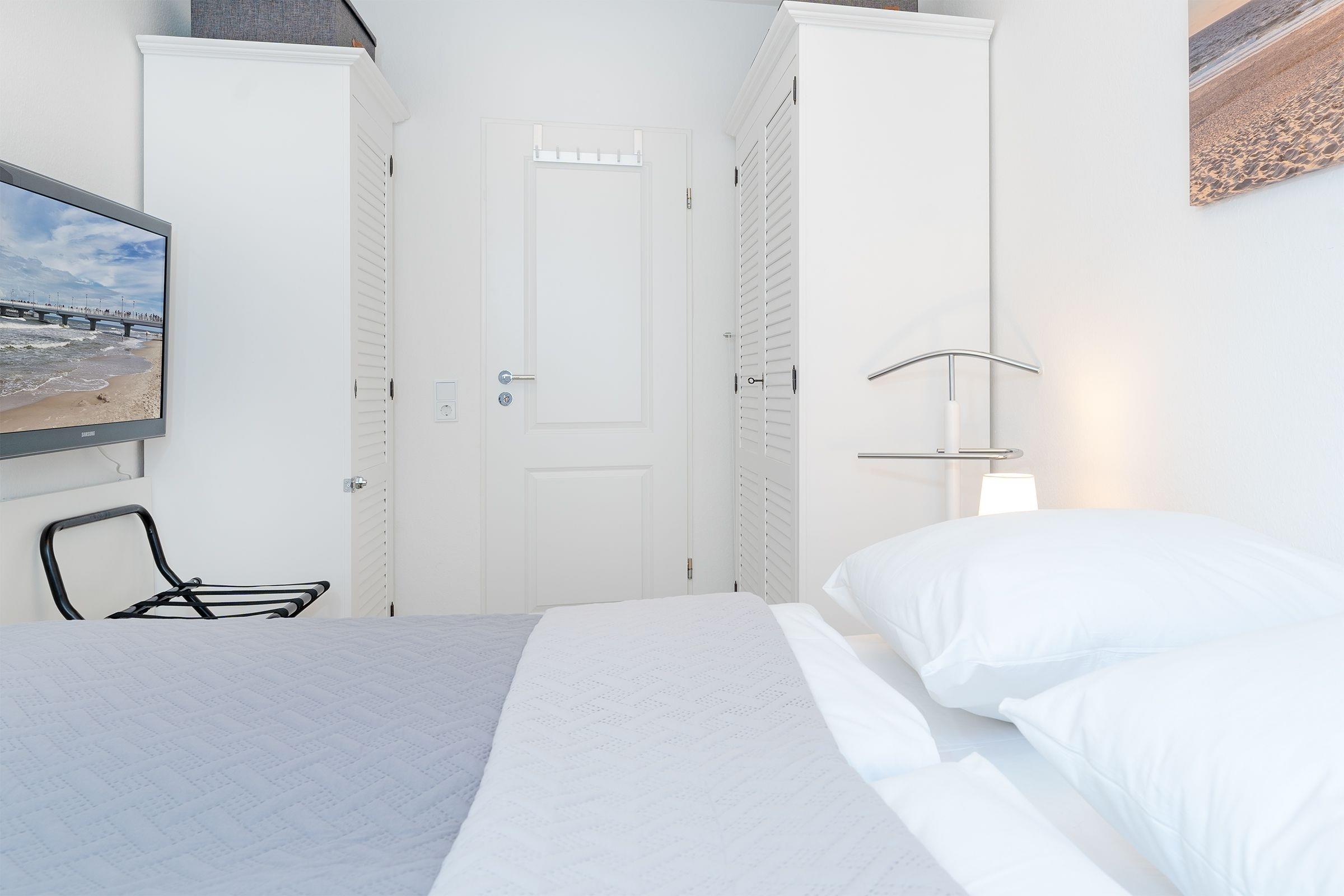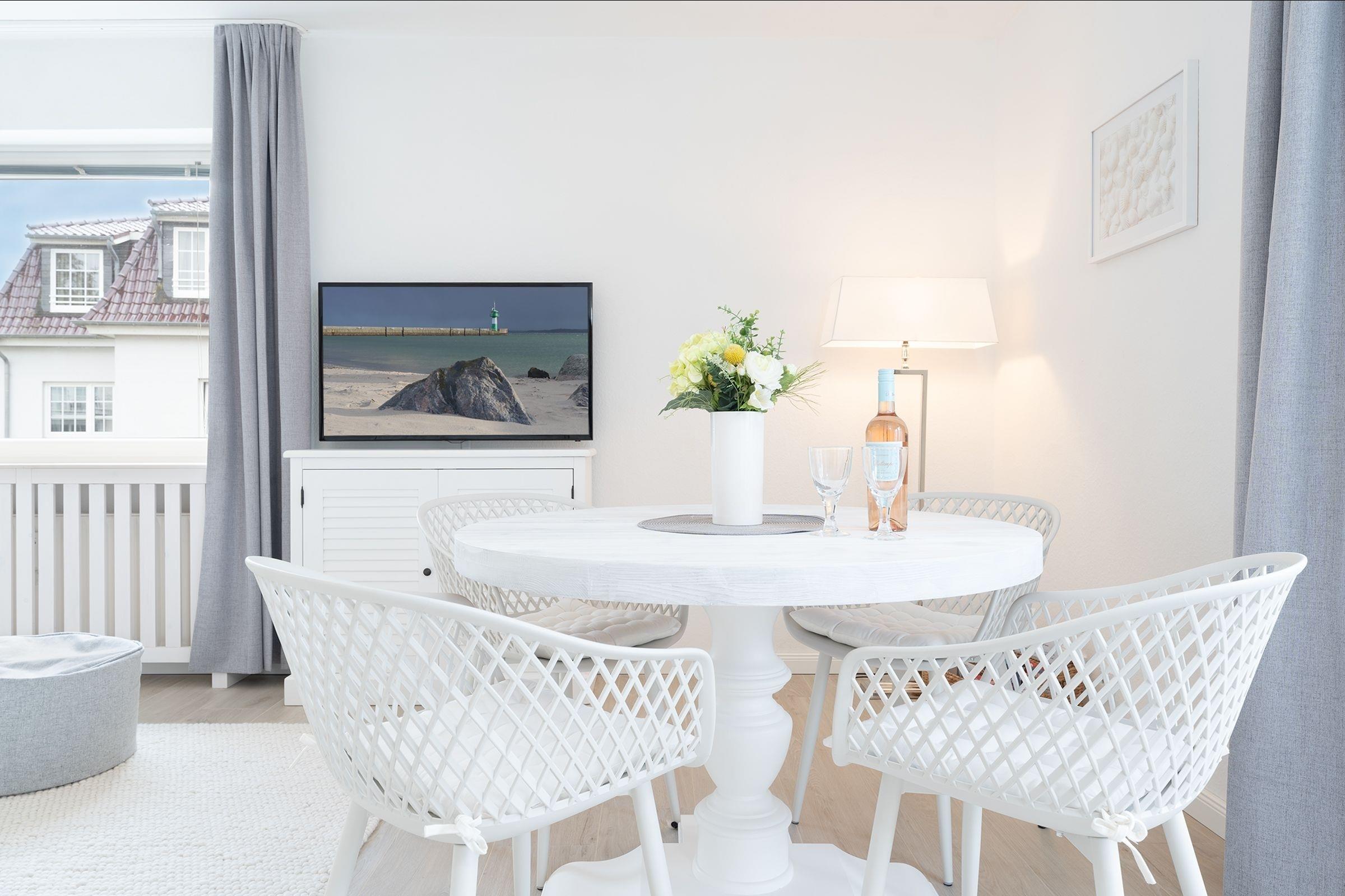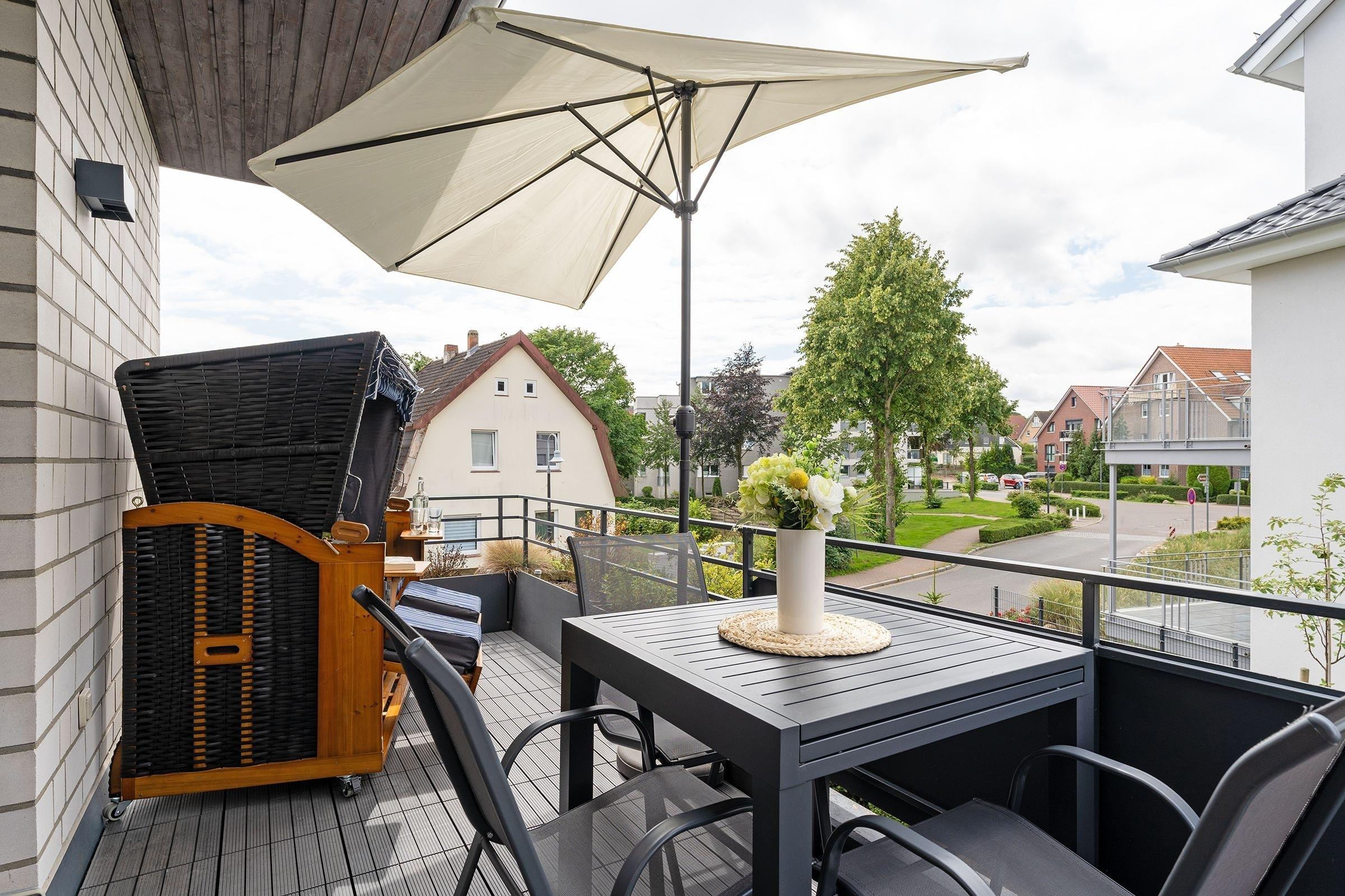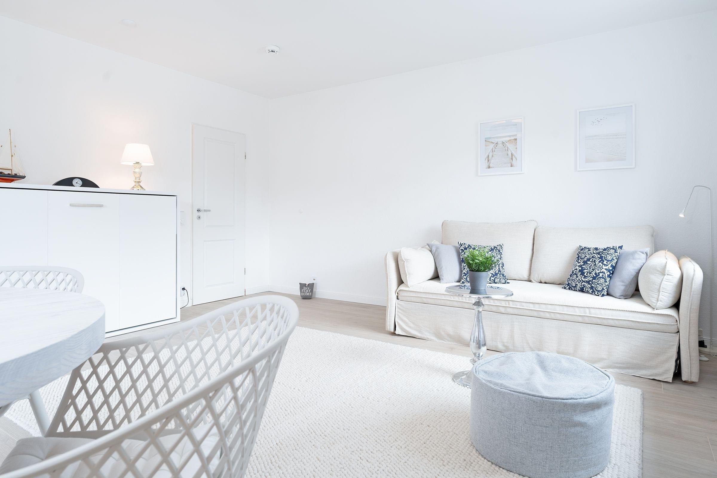Ihr Urlaubsdomizil lässt mit einem hellen Wohnbereich und liebevoller Ausstattung keine Wünsche offen: neben dem Essplatz, der bequemen Couch, einem Flat-TV samt MagentaTV und Disney Plus sorgen auch ein Radio sowie eine High-End-Musikanlage inkl. Apple Airplay für eine rundum gelungene Auszeit. Im Wohnbereich befindet sich auch das praktische Schrankbett, das sich zur Nacht in einen Schlafplatz (150x200 cm) verwandeln lässt. Entspannen Sie tagsüber im XXL-Strandkorb auf dem teilüberdachten Balkon und genießen Sie geschützt die frische Ostseeluft. In der perfekt ausgestatteten Küche geht Ihnen das Zubereiten Ihrer Urlaubsmahlzeiten ganz sicher spielend von der Hand. Erholsam nächtigen können Sie auch im separaten Schlafzimmer mit einem Doppelbett (180x200 cm), einem weiteren TV sowie einem Kleiderschrank. Verbinden Sie ganz einfach Arbeit und Urlaub, indem Sie den Klapptisch für Workation-Tätigkeiten nutzen. Nach einer erholsamen Nacht können Sie sich im modernen Badezimmer auf eine erfrischende Regendusche freuen.