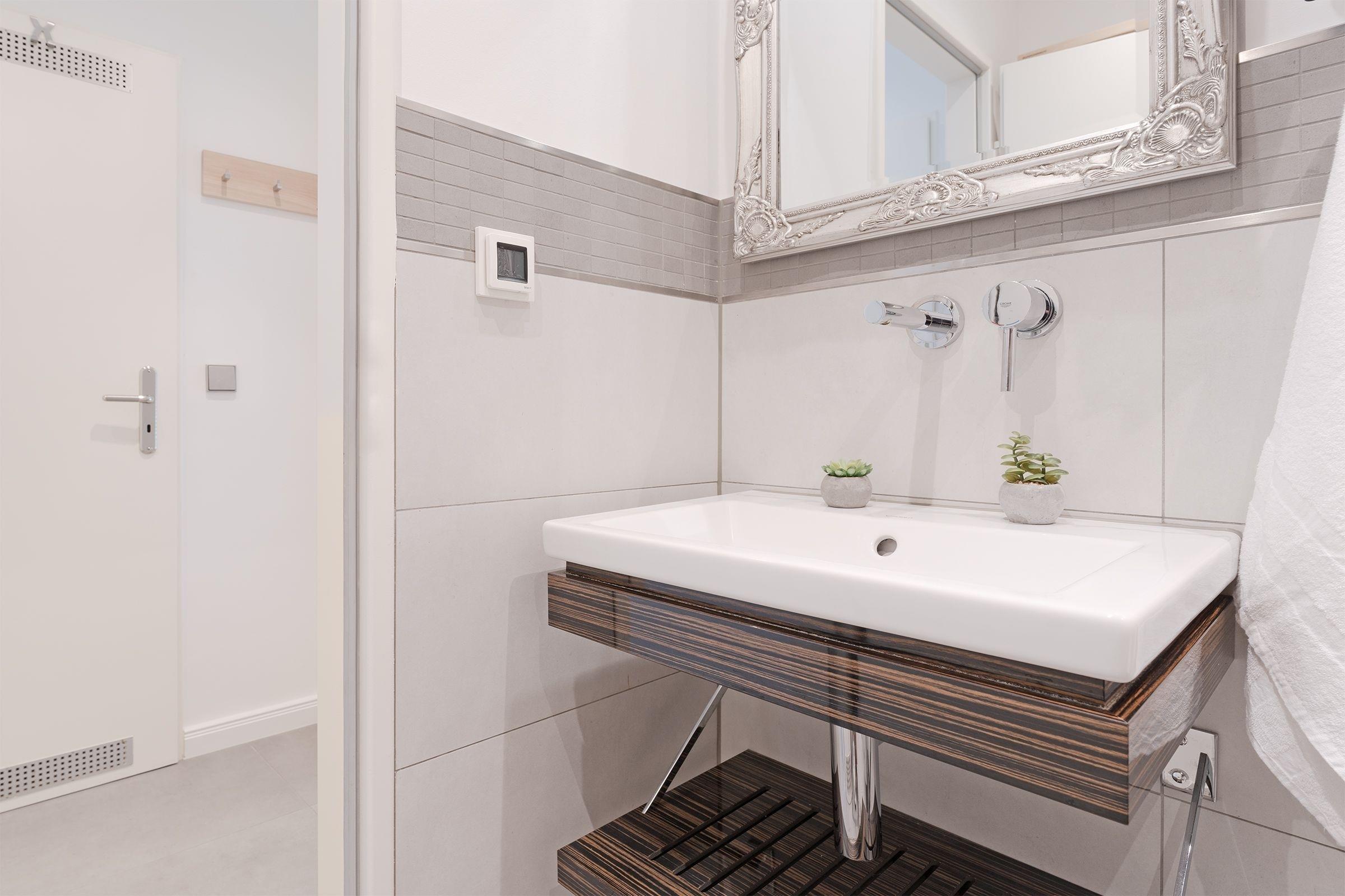 Diese hochwertig ausgestattete Ferienwohnung bietet Ihnen einen gemütlichen Wohn- Schlafbereich, der zum Verweilen einlädt. Hier befindet sich ein exklusives Doppelbett (140x200 cm), ein TV, sowie der Essbereich. Für erholsame Nächte lässt sich der Bereich durch Außenjalousien abdunkeln. Die offene Küche ist gut ausgestattet mit Wasserkocher, Spülmaschine und Backofen (Miele). Für den Morgenkaffee steht eine Kaffeemaschine zur Verfügung. Das Badezimmer ist mit einer ebenerdigen Dusche ausgestattet und bietet zudem Fußbodenheizung für zusätzlichen Komfort.