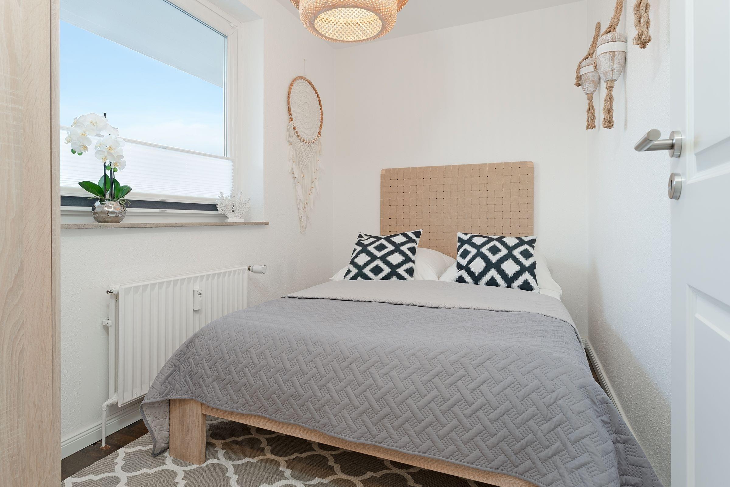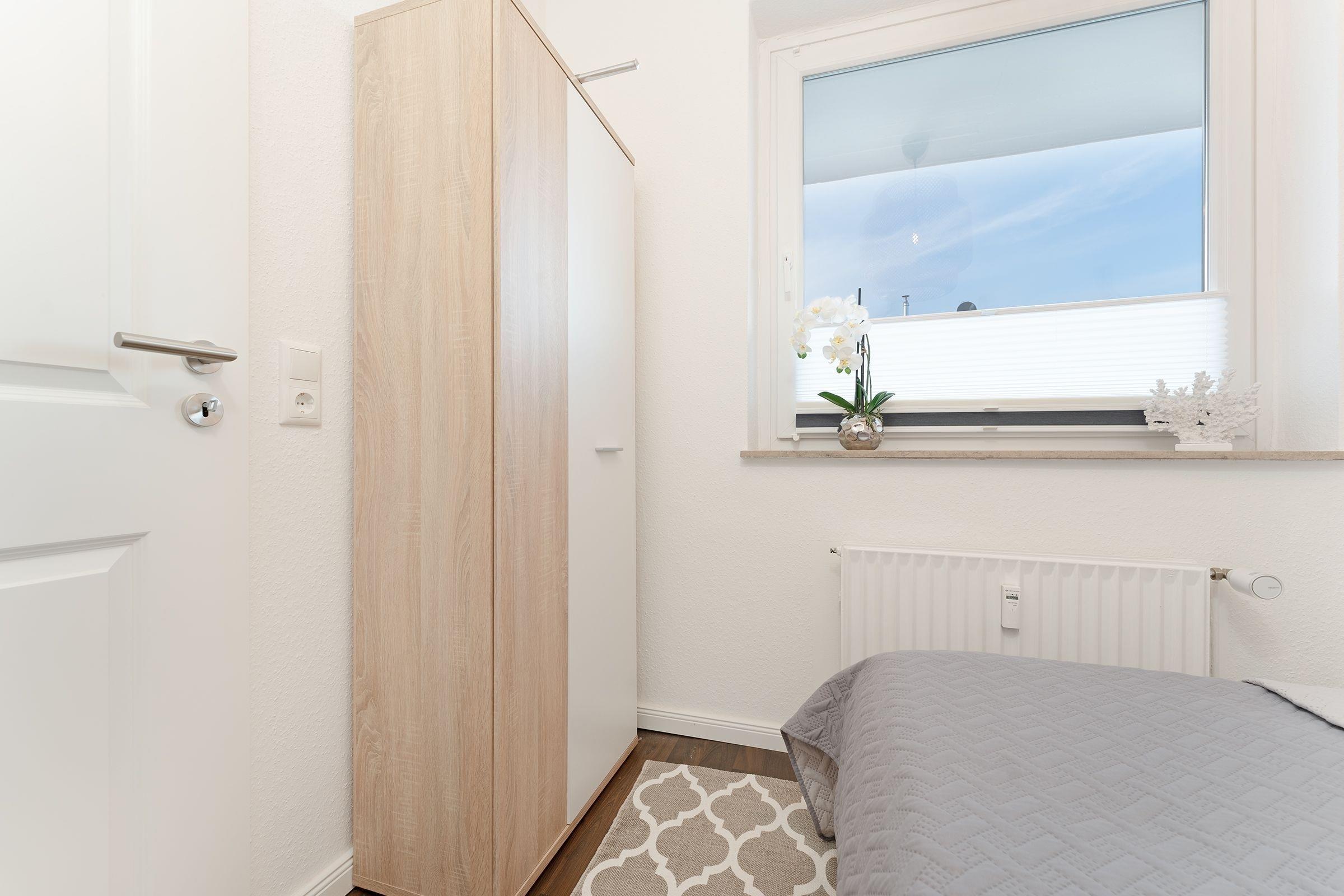 Schlazimmer: 1 Doppelbett (140x200 cm), Kleiderschrank, Verdunkelung: Plissees, kein Platz für ein Babybett