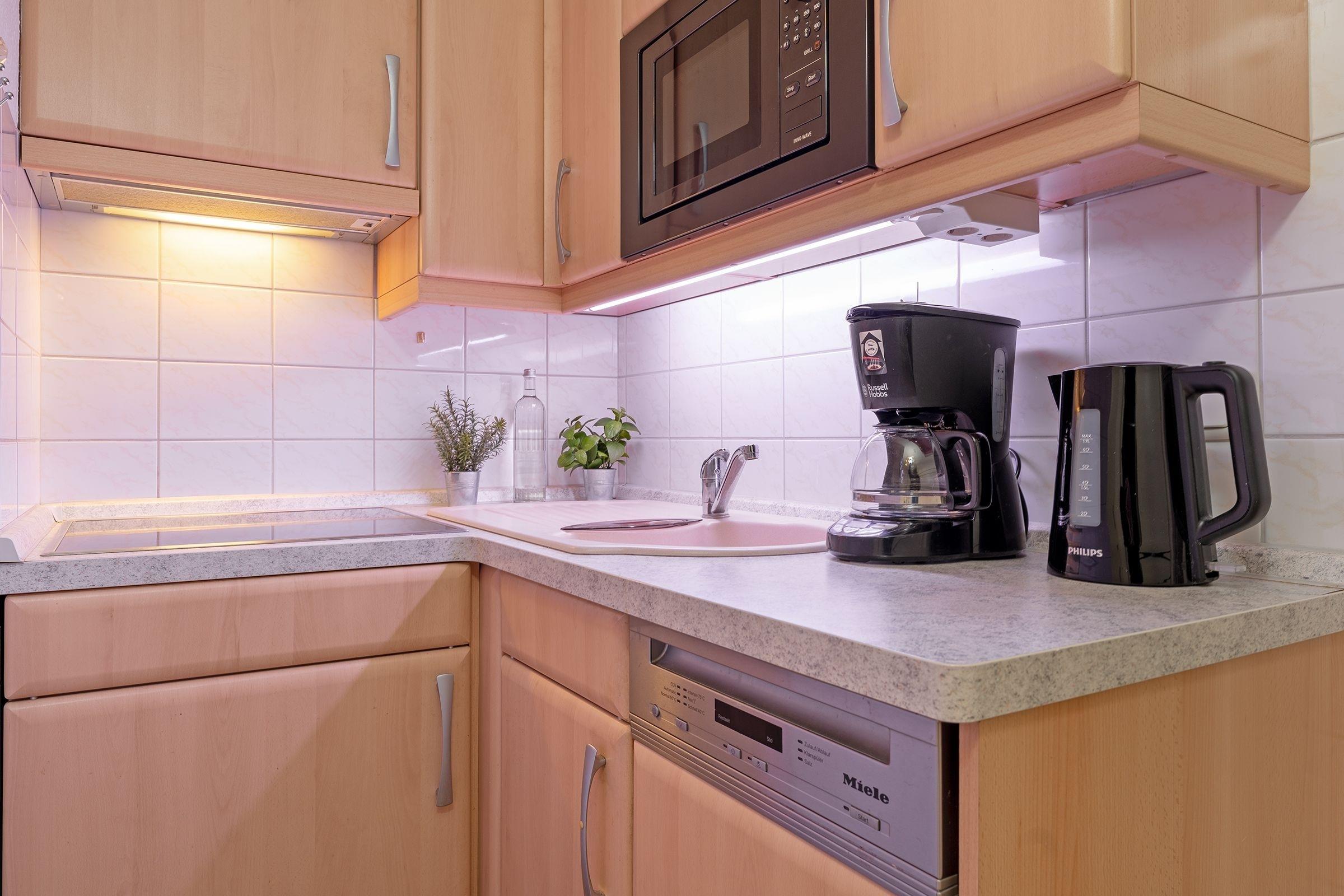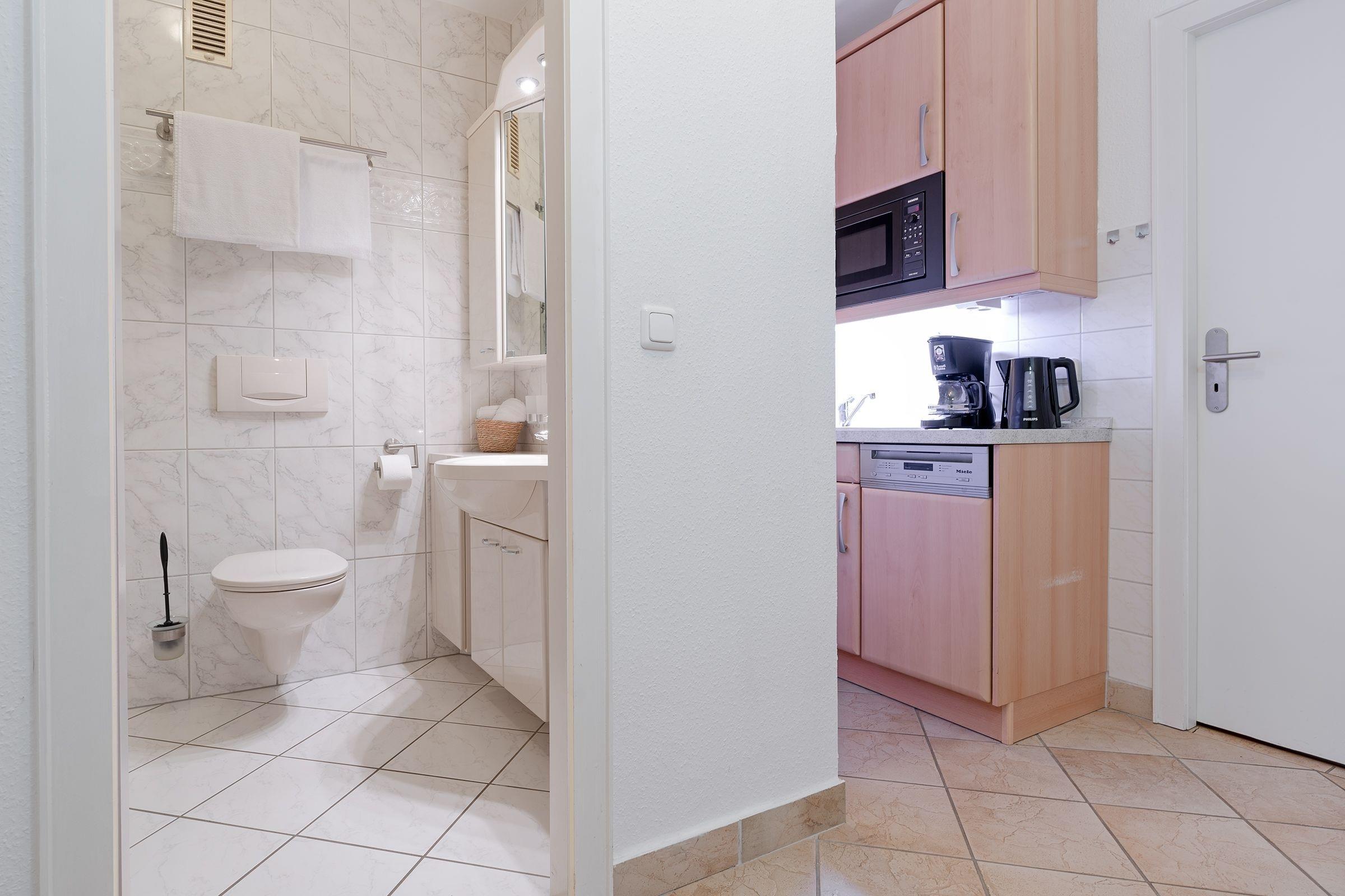 Von hier aus gelangen Sie direkt auf die überdachte Terrasse, die mit Gartenmöbeln ausgestattet ist. Genießen Sie die frische Ostseeluft bei einem morgendlichen Kaffee oder einem leckeren Abendessen im Freien. Die Kochnische der Ferienwohnung ist mit einem 2-Feld-Ceran-Kochfeld, Backofen, Kühlschrank sowie einer Tassimo-Kaffeemaschine bestens ausgestattet. Der Essbereich bietet Platz für ein gemütliches Beisammensein. Für eine erholsame Nacht sorgt entweder ein bequemes Schlafsofa (160x200 cm) im Wohnbereich oder zwei ausklappbare Einzelbetten (Etagenbett, je 90x190 cm) im Flur. Das Badezimmer verfügt über eine moderne Dusche mit Badewanne sowie einen Haartrockner und garantiert einen angenehmen Start in den Tag.