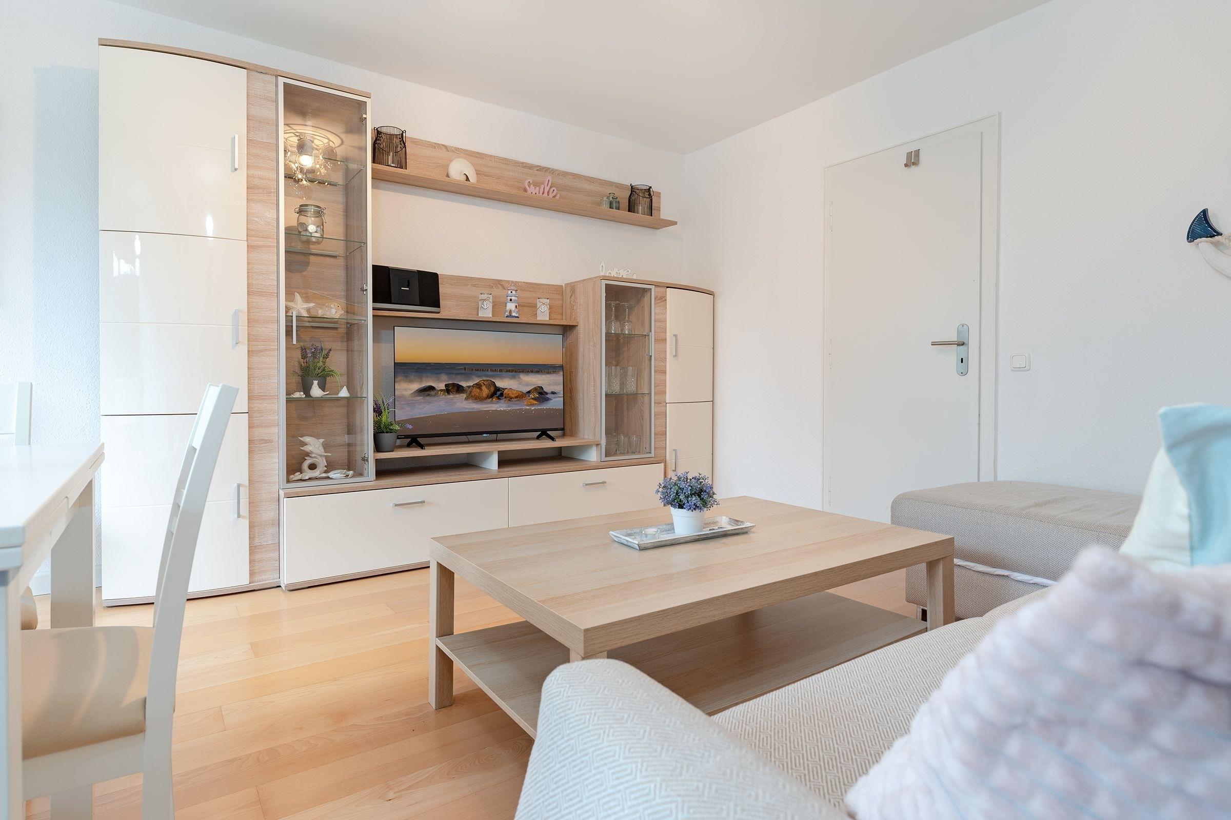 Treten Sie ein in diese charmante, strandnahe Ferienwohnung und lassen Sie sich von der behaglichen Atmosphäre verzaubern. Der gemütliche Wohnbereich bietet ausreichend Platz zum Entspannen. Ein Fernseher und Radio (CD/Bluetooth) sind ebenfalls vorhanden, sodass es an Unterhaltungsmöglichkeiten nicht mangelt.