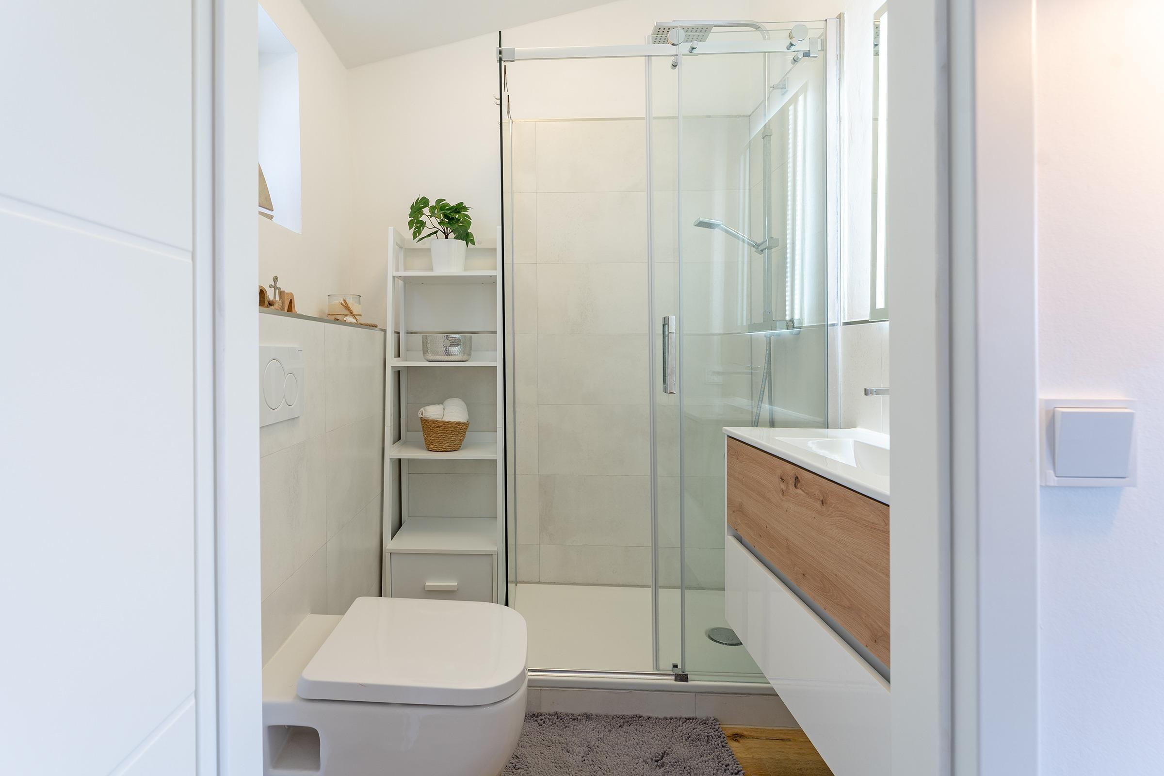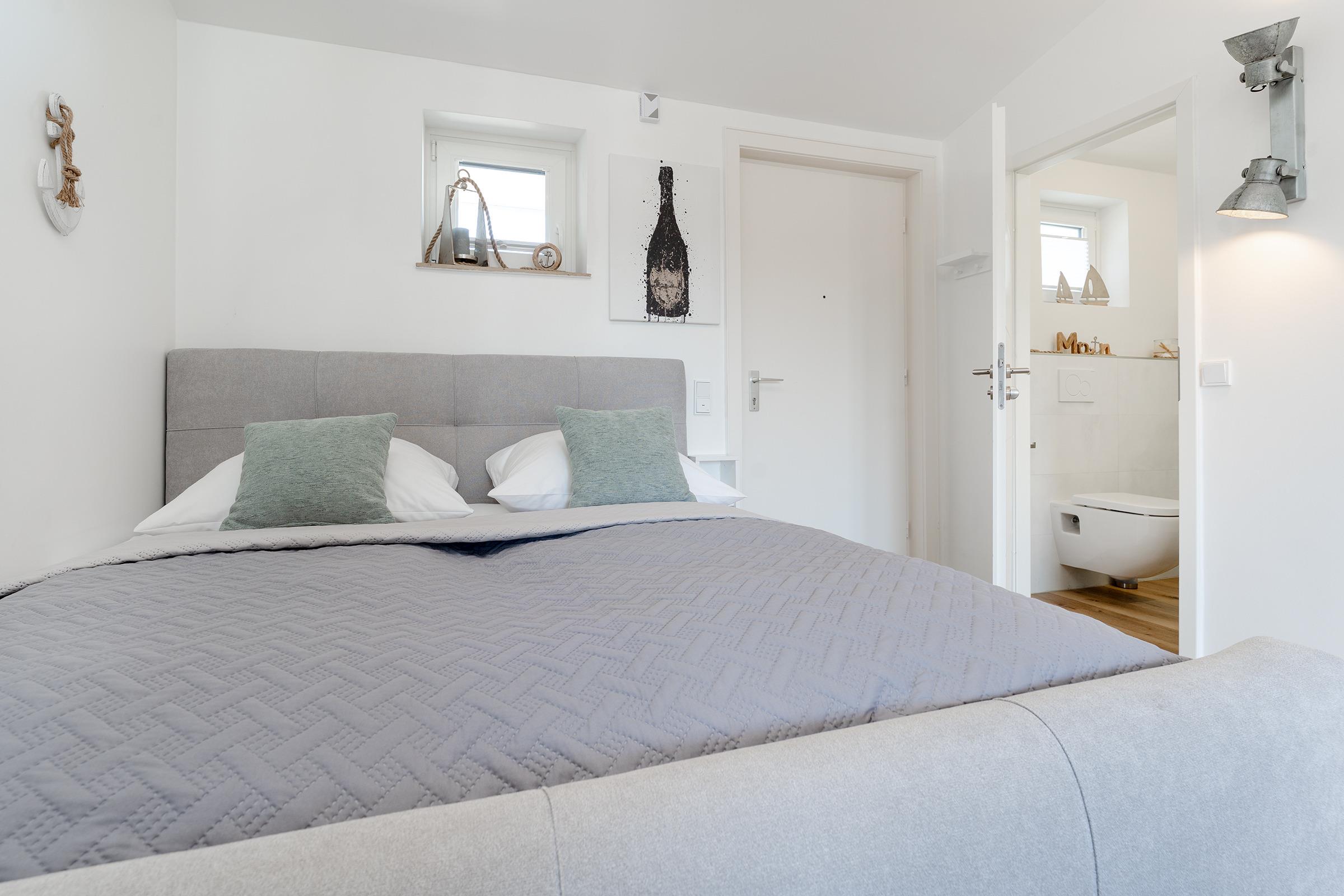 Das moderne Tageslichtbad verfügt über eine Dusche, ein Waschbecken und ein WC. Ein Haartrockner und eine Fußbodenheizung runden den Komfort ab.