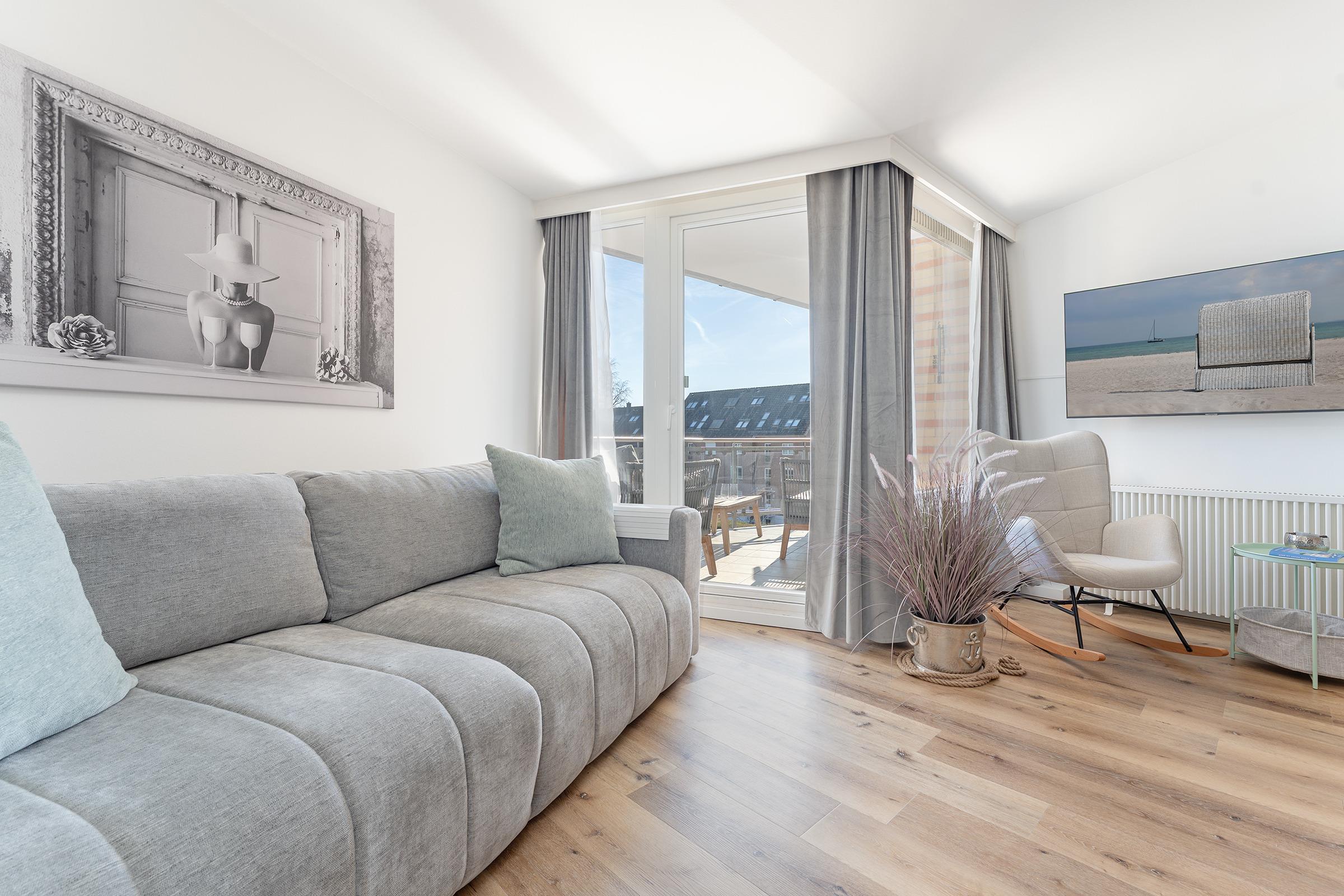 Diese stilvolle Ferienwohnung in Scharbeutz bietet modernen Komfort in bester Lage. Der helle Wohnbereich verfügt über eine gemütliche Sofaecke und einen Fernseher für entspannte Abende. Große Fenster sorgen für viel Tageslicht und eine angenehme Atmosphäre. Vom Wohnzimmer aus gelangen Sie auf den überdachten Balkon mit Gartenmöbeln, ideal für ein Frühstück an der klaren Meeresluft.