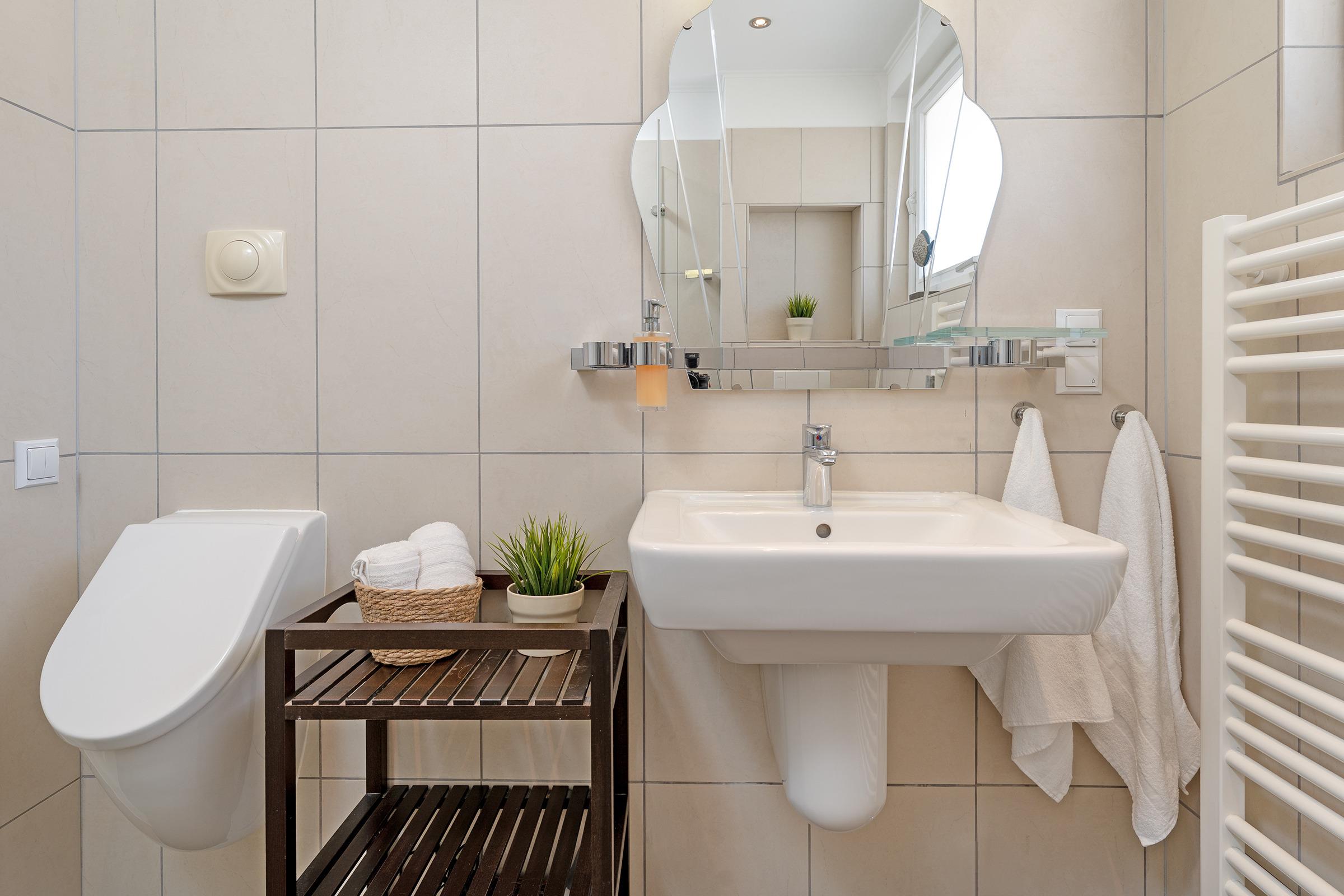 Das moderne Badezimmer überzeugt mit einer bodengleichen Dusche und hochwertiger Ausstattung.