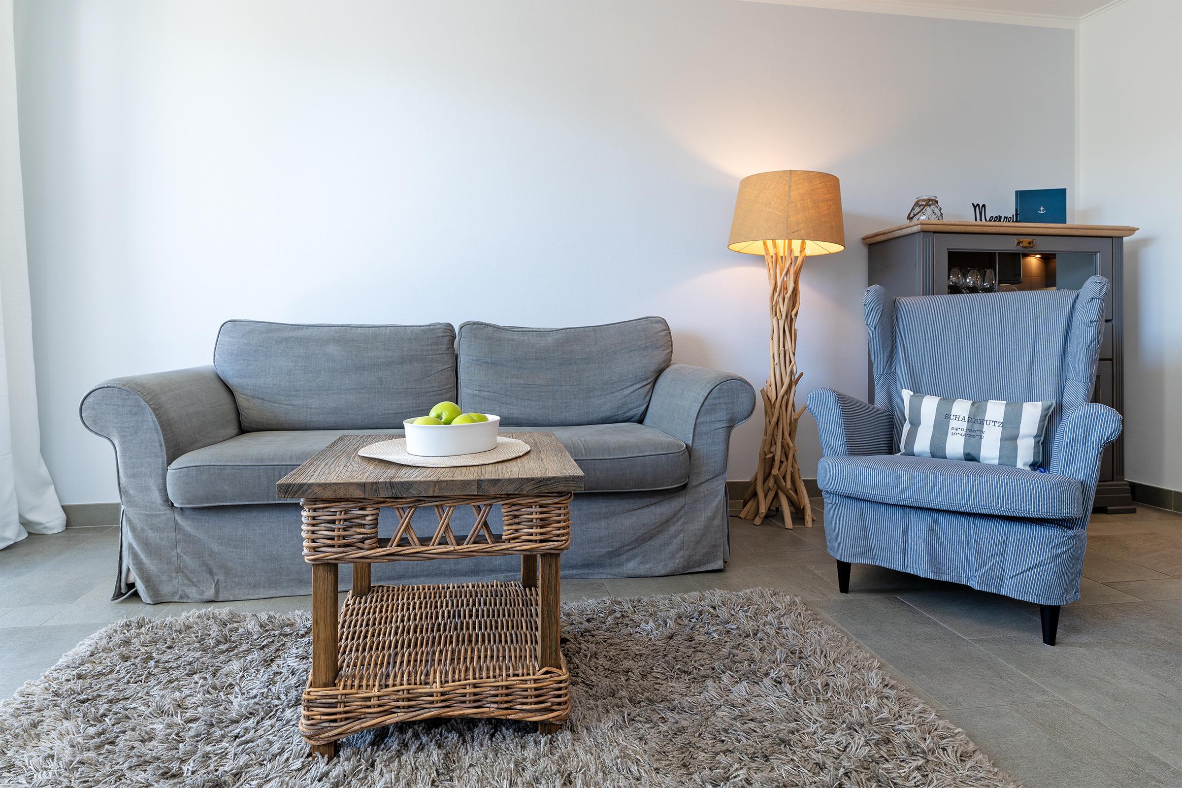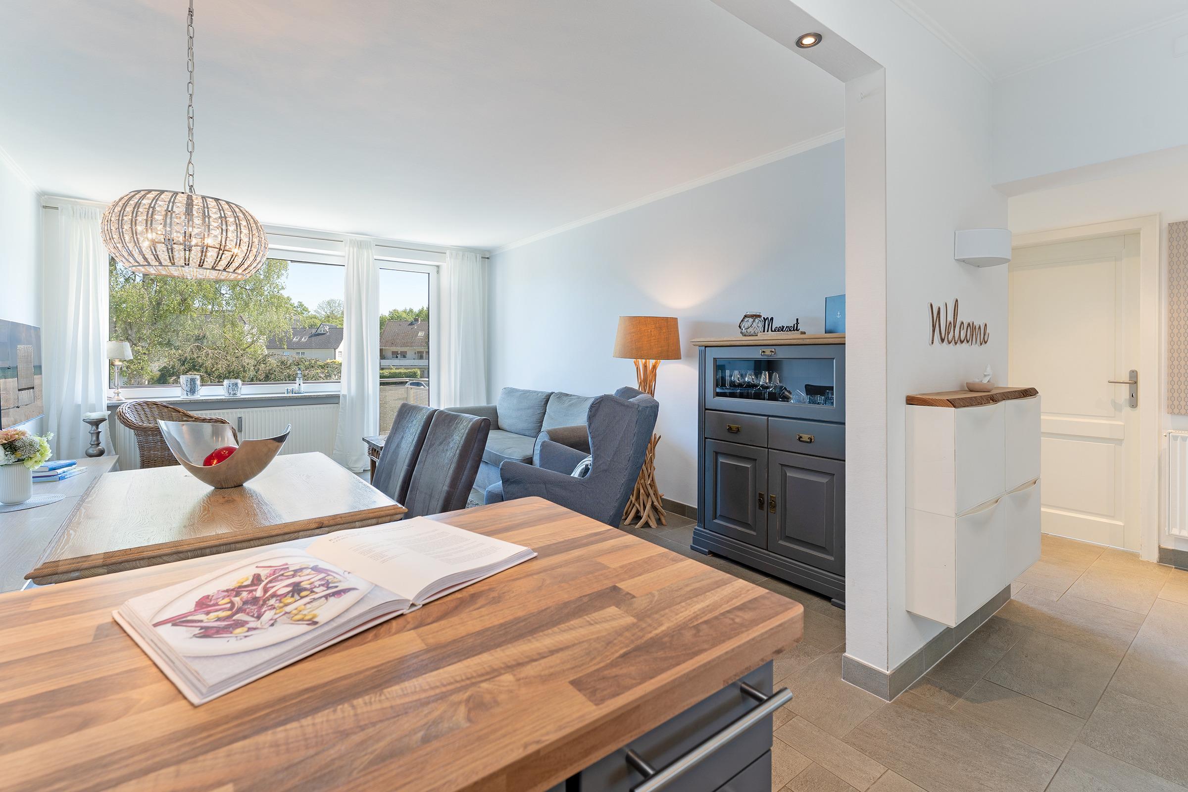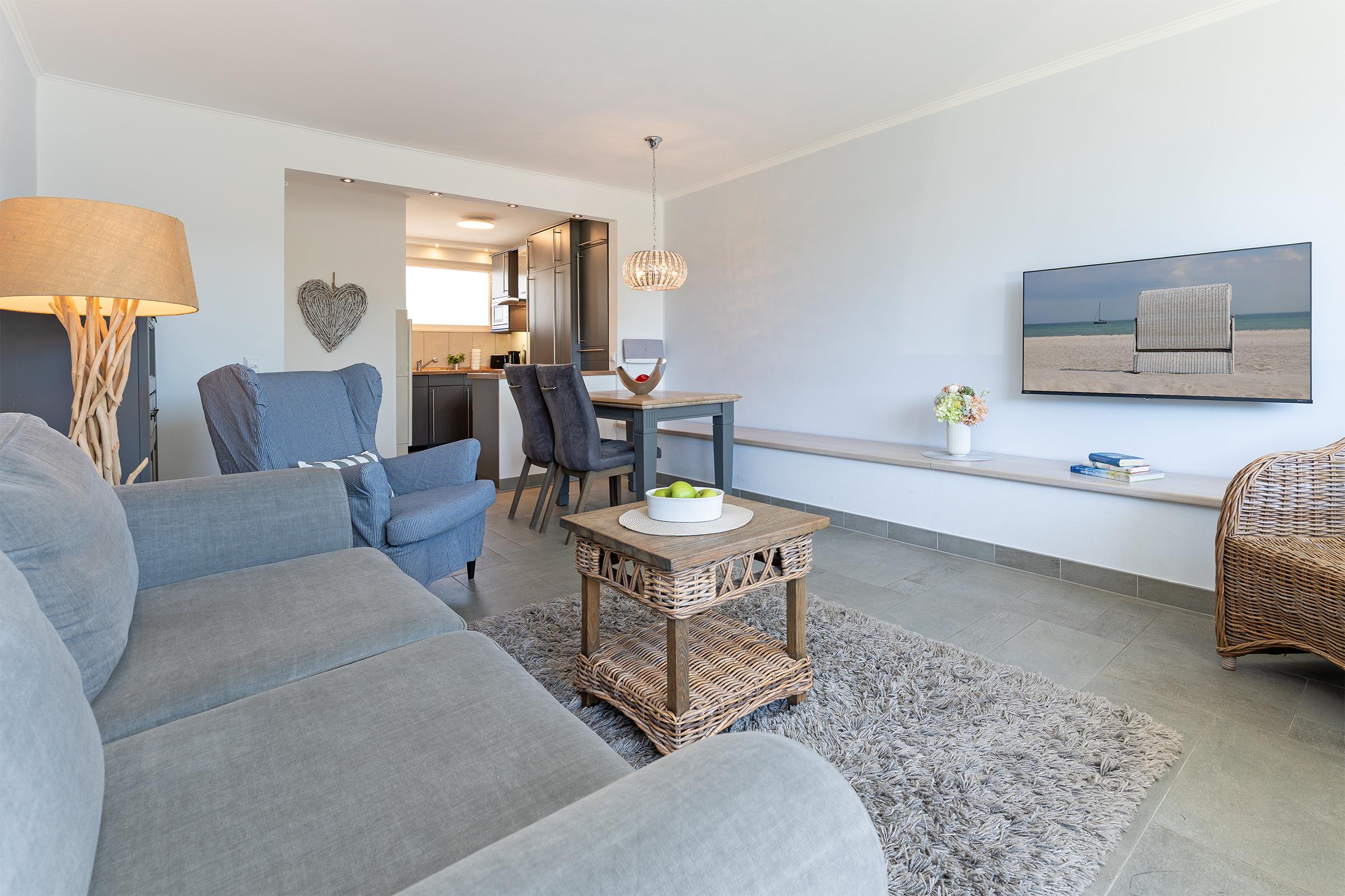 Der helle Wohnbereich mit bequemer Sitzecke und offen gestalteter Küche lädt zum Verweilen ein. Die Küche ist vollständig ausgestattet – ob für ein ausgiebiges Frühstück oder ein gemütliches Abendessen nach einem Strandtag, hier bleiben keine Wünsche offen. Vom Wohnbereich aus gelangen Sie direkt auf den möblierten Balkon, wo Sie bei frischer Meeresluft und einer Tasse Kaffee entspannen können.