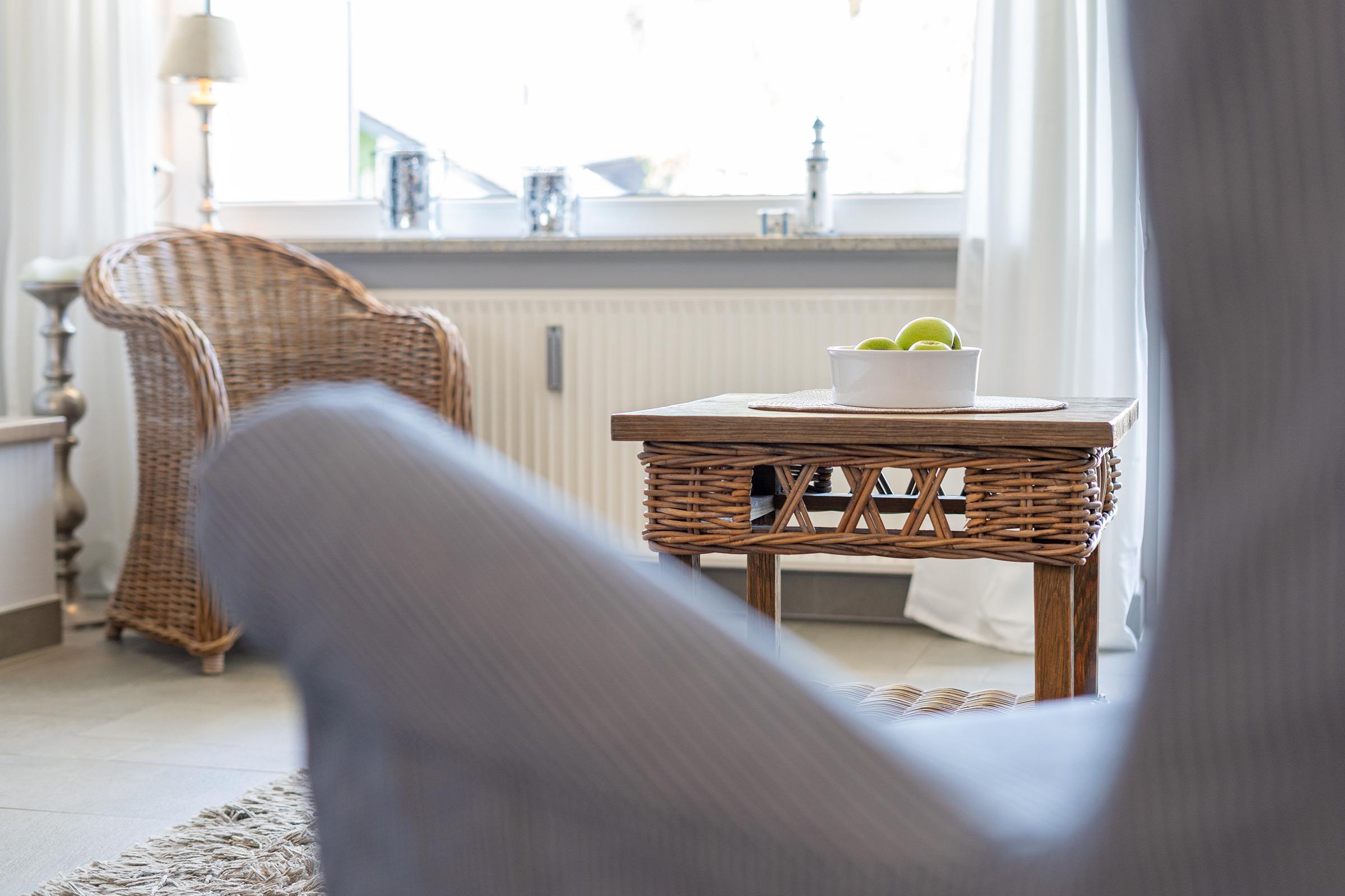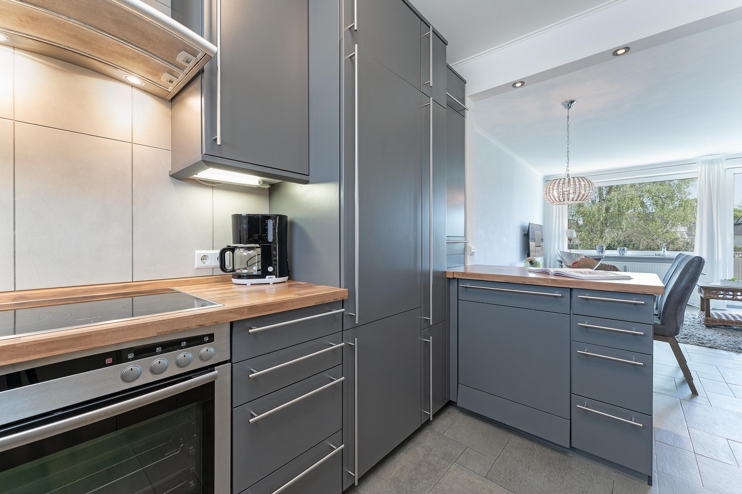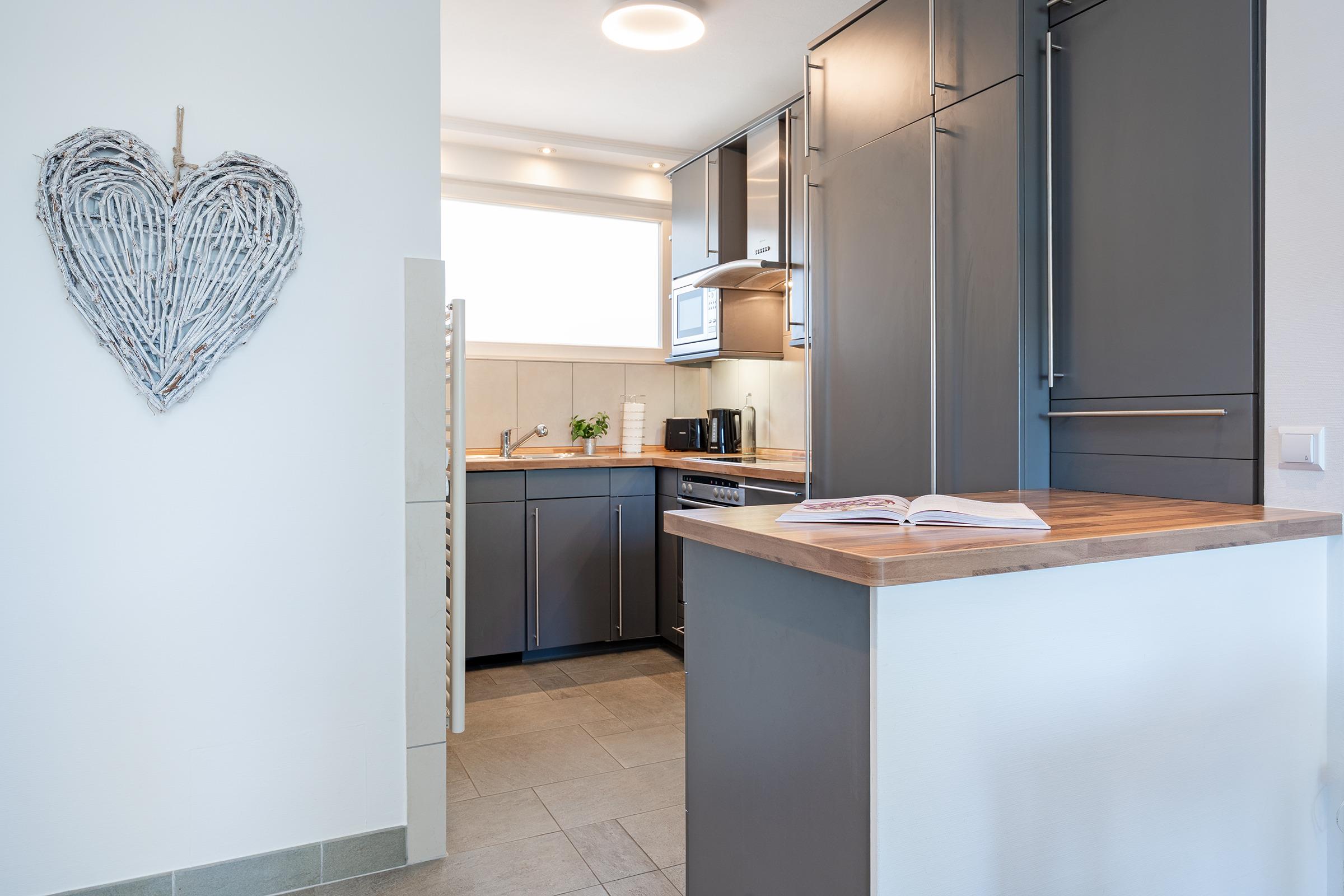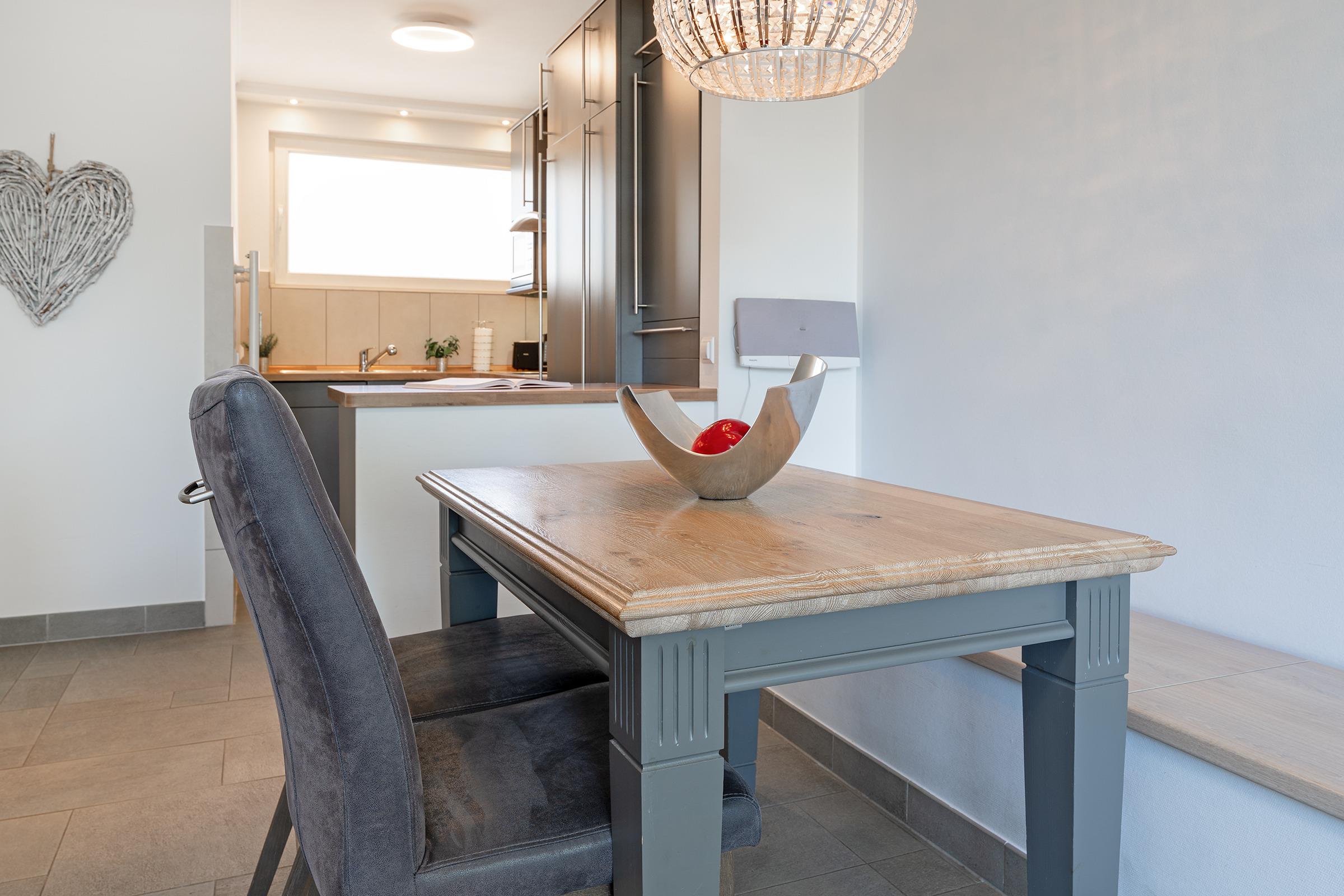 Der helle Wohnbereich mit bequemer Sitzecke und offen gestalteter Küche lädt zum Verweilen ein. Die Küche ist vollständig ausgestattet – ob für ein ausgiebiges Frühstück oder ein gemütliches Abendessen nach einem Strandtag, hier bleiben keine Wünsche offen. Vom Wohnbereich aus gelangen Sie direkt auf den möblierten Balkon, wo Sie bei frischer Meeresluft und einer Tasse Kaffee entspannen können.