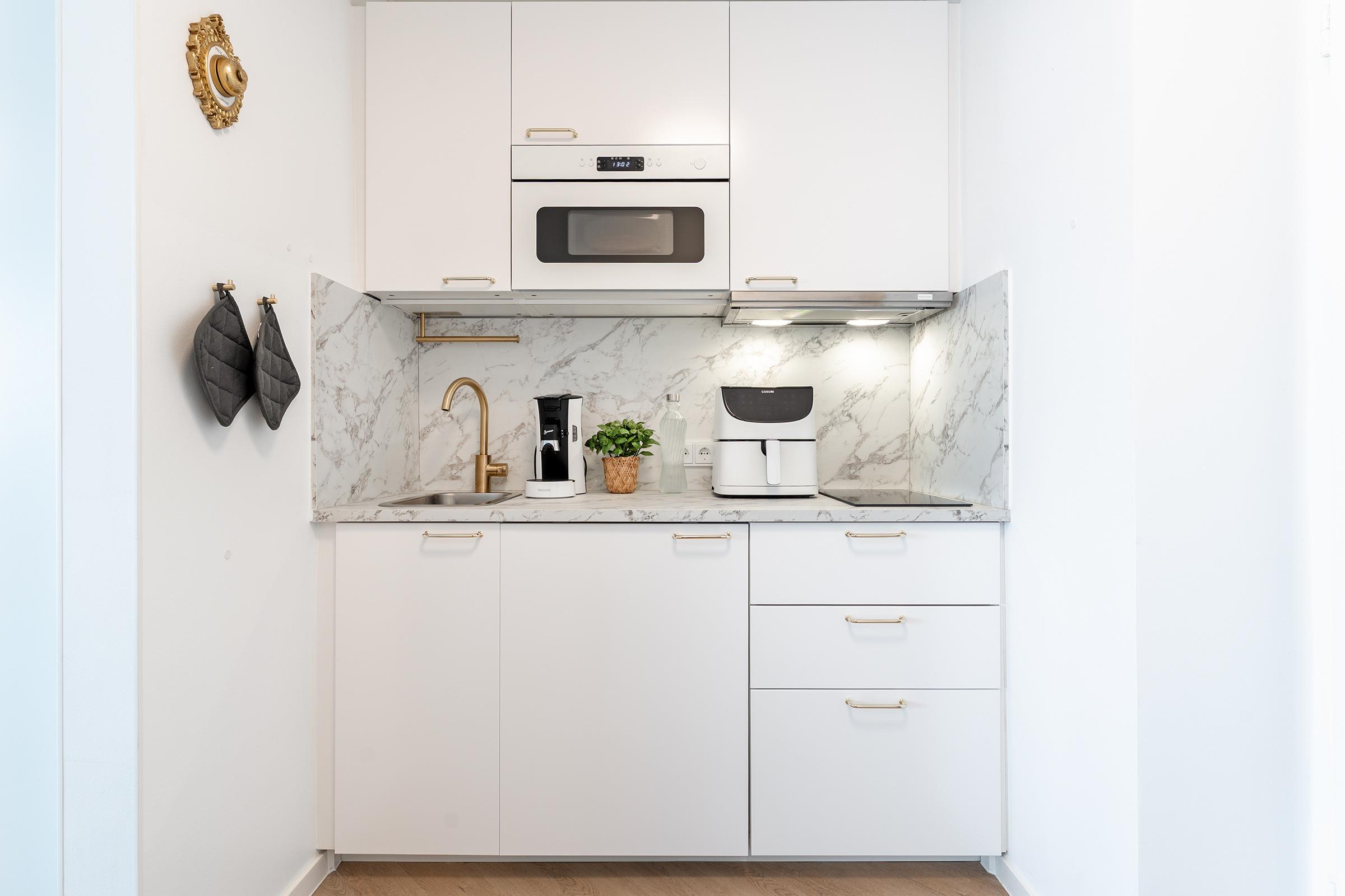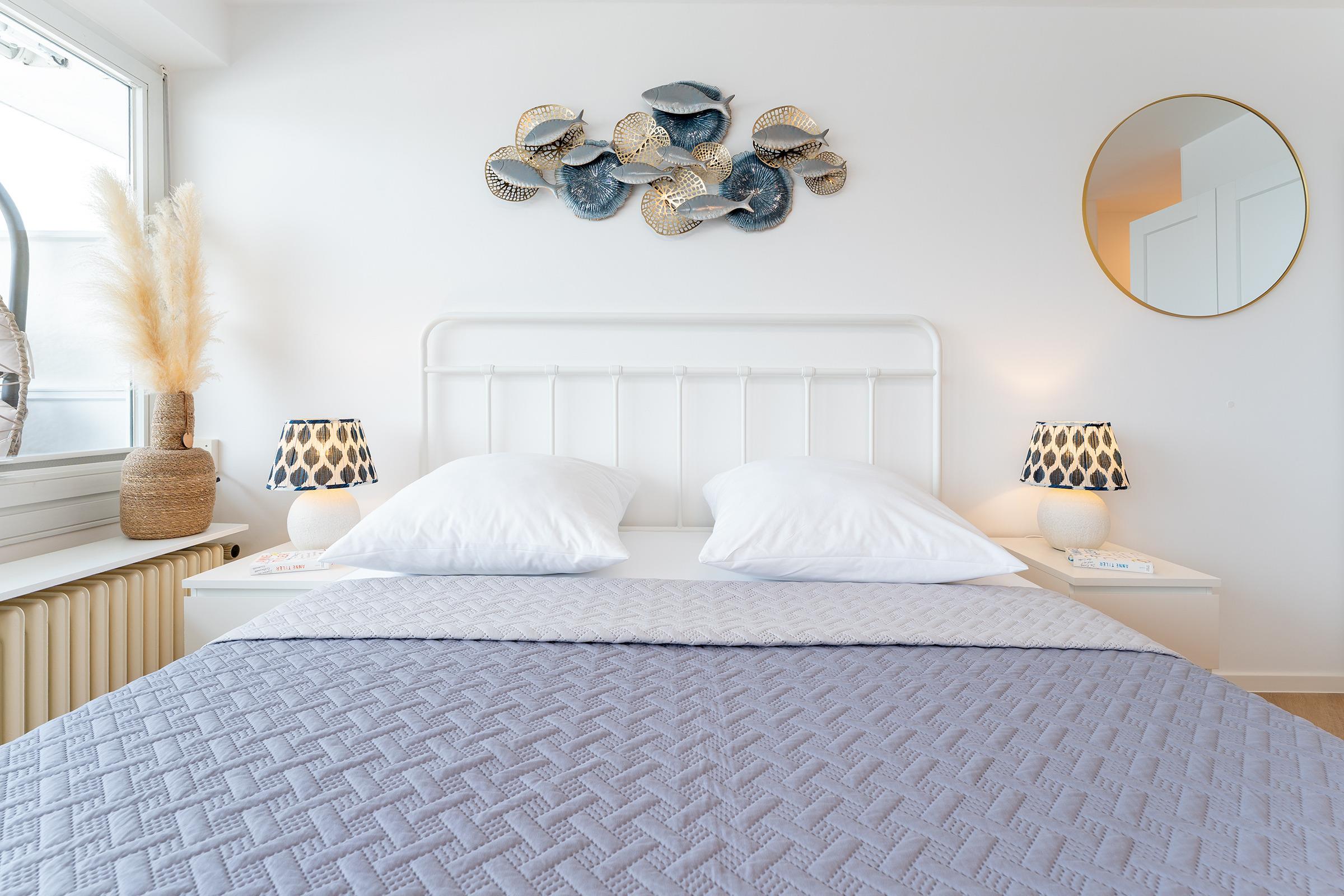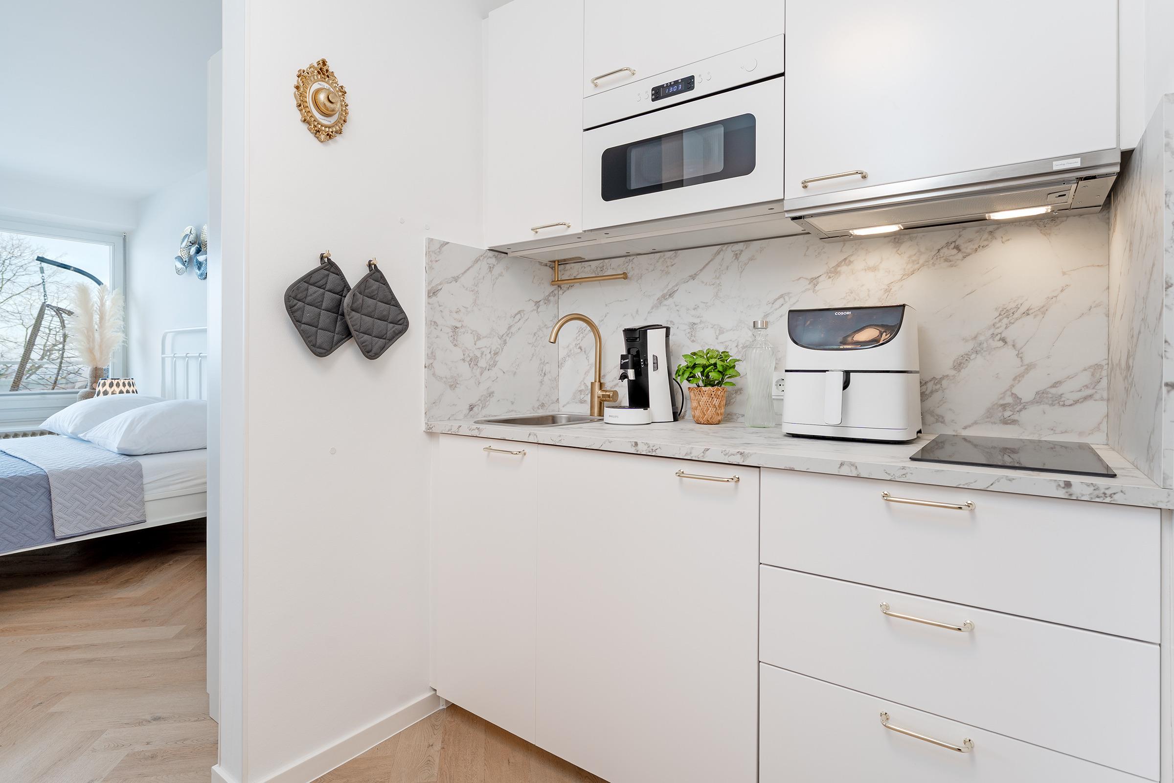 Der helle Wohn- und Schlafbereich ist freundlich eingerichtet und kombiniert Komfort mit Funktionalität. Ein bequemes Doppelbett sorgt für erholsame Nächte, während eine Sitzecke mit Fernseher und sogar einem Plattenspieler für entspannte Stunden nach einem Strandtag bereitsteht. Vom Wohnbereich gelangen Sie auf den Balkon, der mit Balkonmöbeln und einem Hängesessel ausgestattet ist und zum Frühstücken im Freien oder zum Ausklingen des Tages einlädt. Die kleine Küche verfügt über ein Kombi-Mikrowellen-Backofen, eine Kaffeemaschine, einen Kühlschrank sowie einem Wasserkocher – ideal, um sich während des Urlaubs selbst zu versorgen. Das Badezimmer ist mit Dusche, WC, Haartrockner und Kosmetikspiegel ausgestattet und bietet alles, was Sie für Ihre Urlaubstage benötigen.