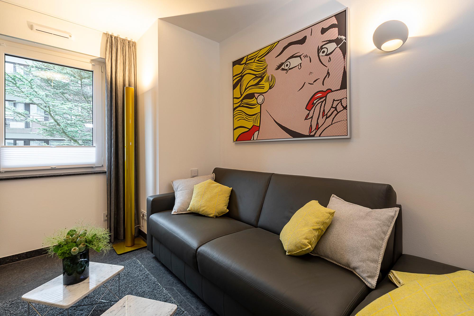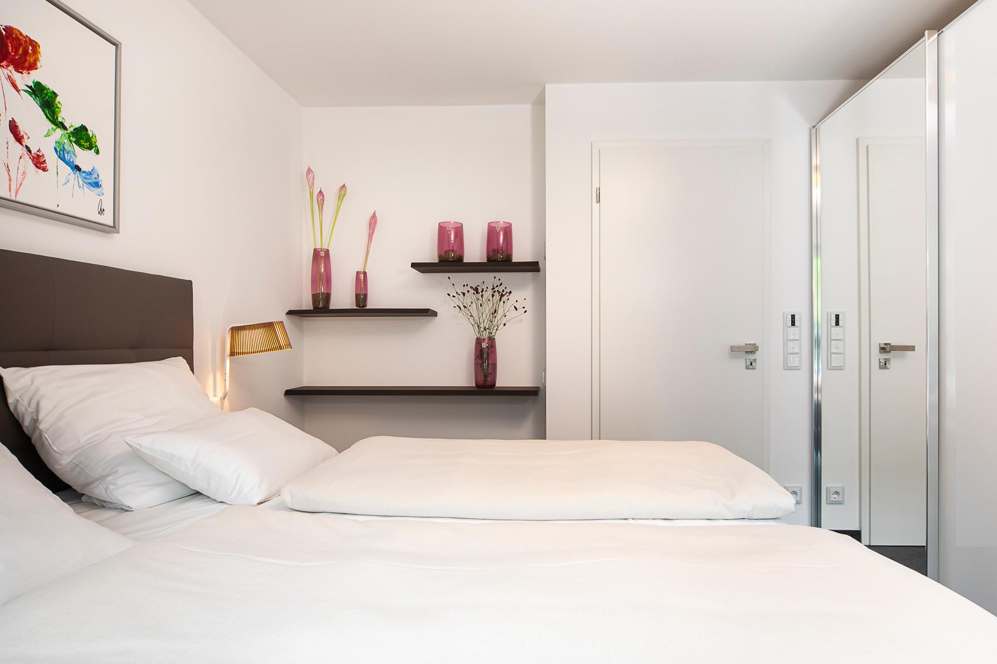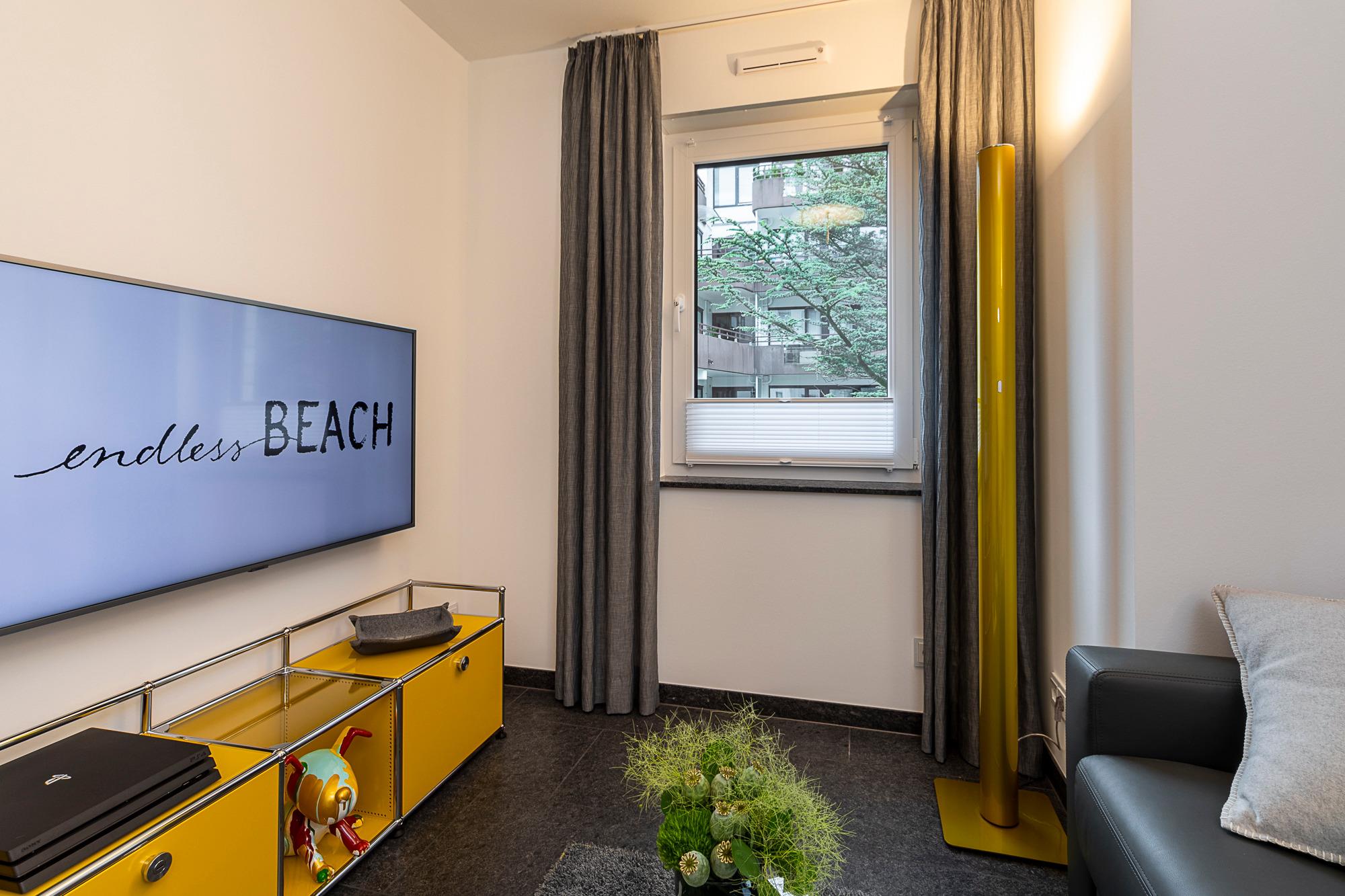 2. Schlafzimmer: Dieser Raum zeichnet sich durch seine Flexibilität aus. Ein Ledersofa mit Recamierenhocker kann mit wenigen leichten Handgriffen zu einem vollwertigen Bett (mit Orthoflex-Lattenrost und Gelform-Matratze 160x200) umfunktioniert werden. Oder nutzen Sie diesen Raum als weiteren Rückzugsort zum Lesen oder Spielen (diverse Bücher und Spiele liegen im USM-TV-Board bereit). Für bestes Entertainment finden Sie hier einen 49-Zoll-Samsung-Smart-TV mit LAN-Anschluss und eine Playstation PS4 Pro.
