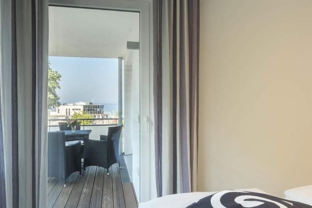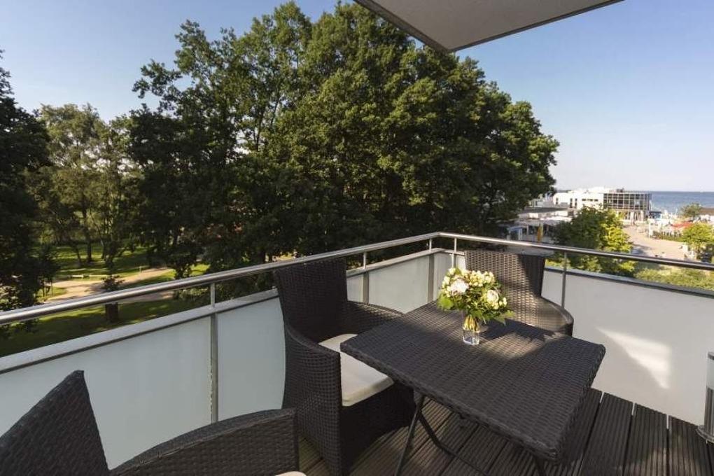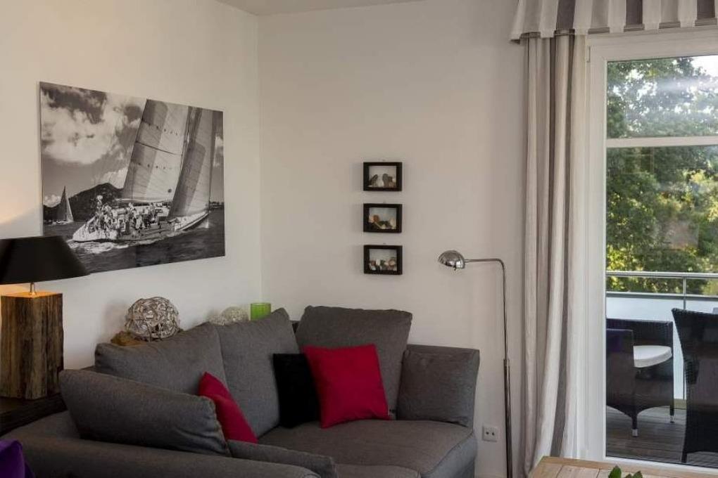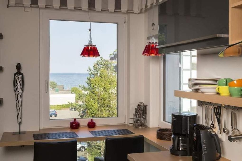Diese Ferienwohnung mit tollem Blick über die Ostsee lädt Sie zum Entspannen ein. Der gemütliche Wohnbereich mit bodentiefen Fenstern ist mit einem gemütlichen Sofa ausgestattet, von welchem Sie bequem den Blick über die Ostsee genießen können. Neben einem Flachbildfernseher und einem BluRay-Player steht Ihnen selbstverständlich kostenloses WLAN zur Verfügung. Der überdachte Balkon, mit Blick auf die Ostsee oder in den Kurpark, ist mit einem Tisch und Stühlen ausgestattet. Die moderne Küche mit Tresen lässt keine Wünsche offen. Im gemütlichen Schlafzimmer stehen ein bequemes Bett (1,80 x 2,00m, Einzelmatratzen) sowie ein geräumiger Schrank zur Verfügung. Von dem Schreibtisch, der im Flur steht, haben Sie einen schönen Meerblick. Das Badezimmer verfügt über einen Doppelwaschtisch, eine bodentiefe Dusche und einen abgegrenzten WC-Bereich. Neben der Fußbodenheizung ist hier ein zusätzlicher Handtuchheizkörper angebracht.