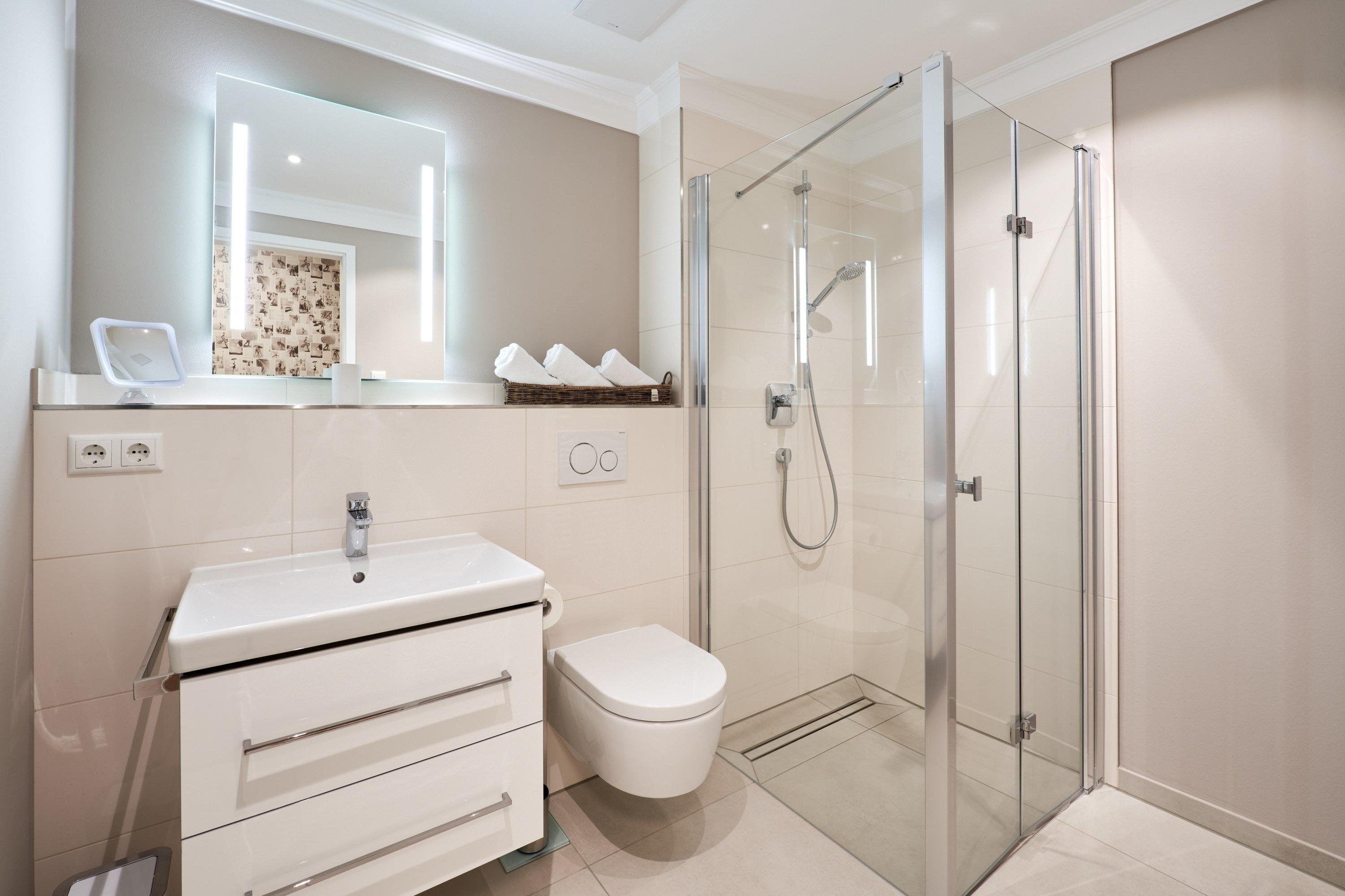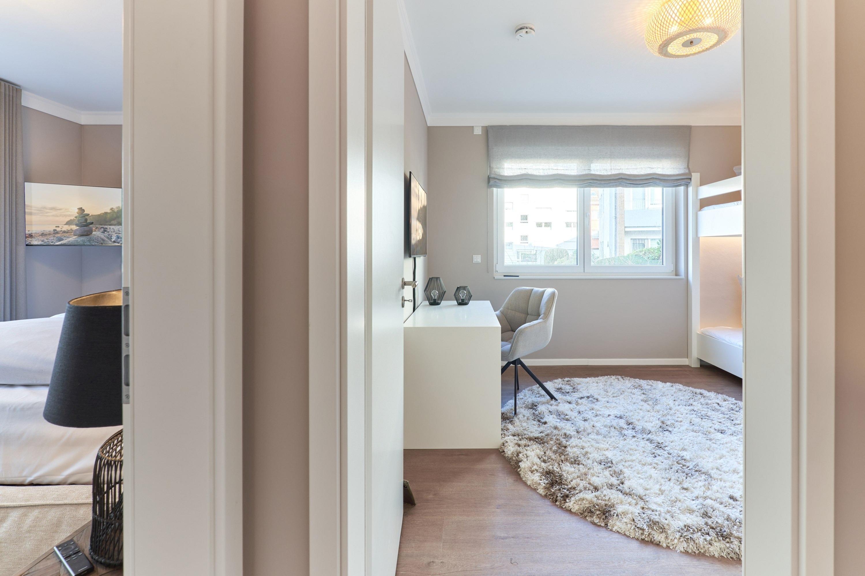 Das erste Schlafzimmer ist mit einem bequemen Doppelbett (1,80m x2,00m), einem Smart-TV (43 Zoll) sowie mit einem Kleiderschrank ausgestattet. Im 2. Schlafzimmer stehen ein hochwertiges Etagenbett (1,20 m x 2,00m), angrenzend ein Einbauschrank sowie ein Schreibtisch, angefertigt in hochwertiger Tischlerarbeit, sowie ein TV (43 Zoll) für Sie bereit. Alle Räume lassen sich durch Außenrollläden verdunkeln. Das Duschbad hält für Sie einen Handtuchheizkörper und einerbodengleichen Dusche bereit. Kosmetikspiegel und Haartrockner sind hier selbstverständlich vorhanden.