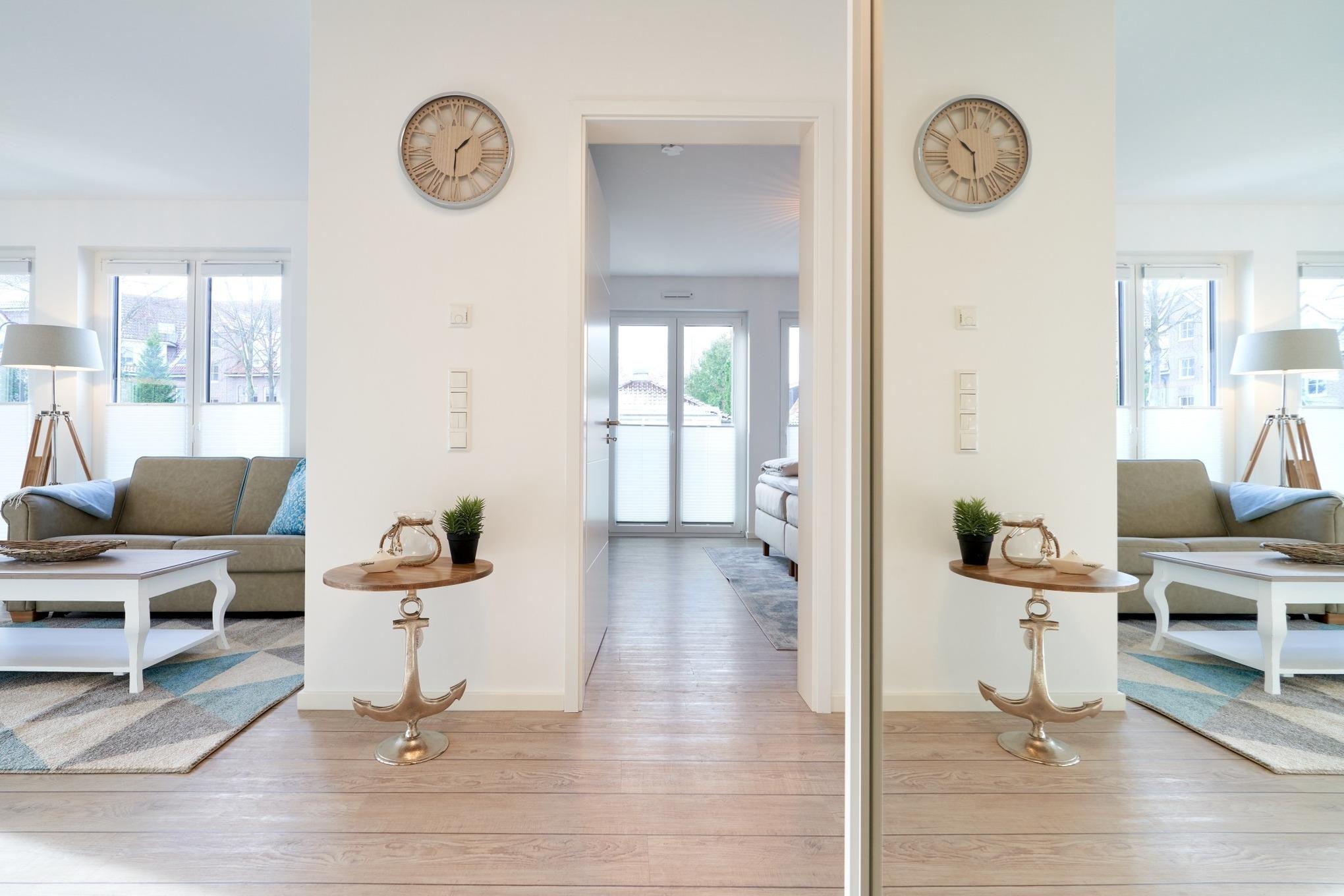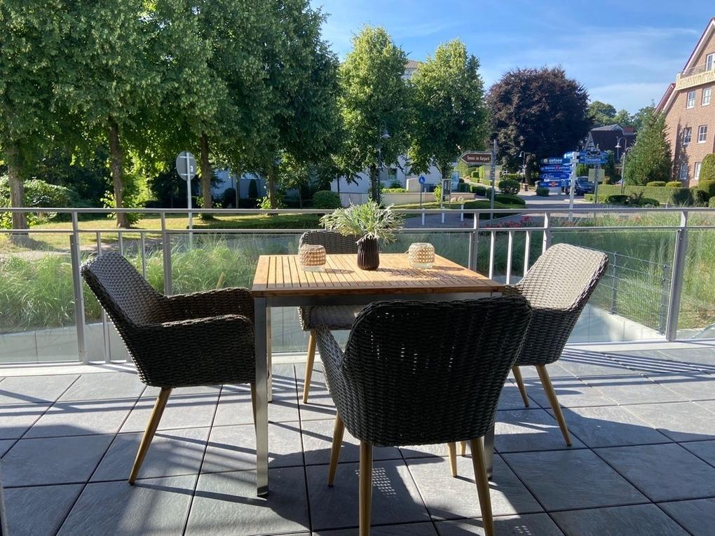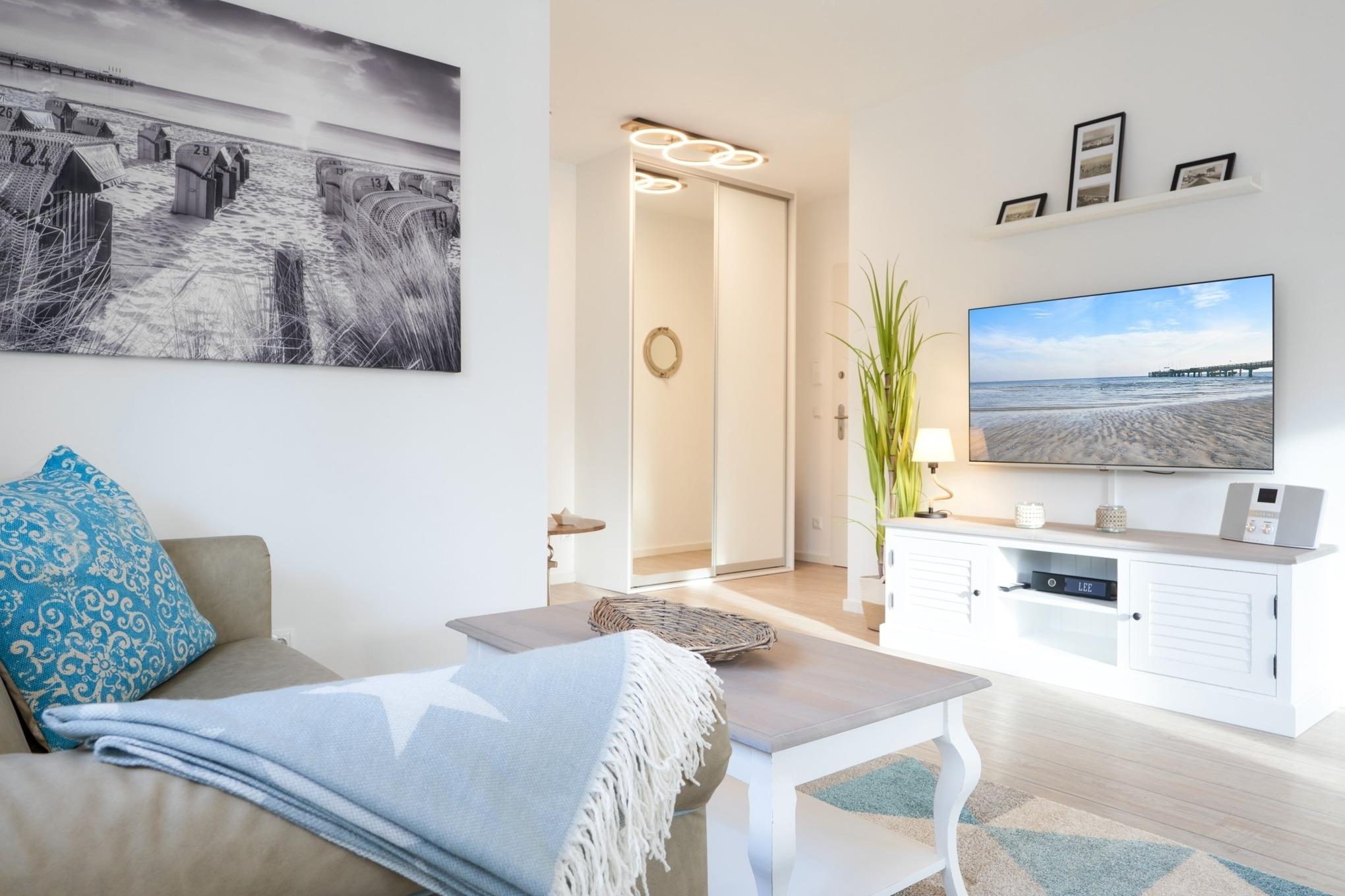 Wohnung LEE – für 2 Personen plus 1. Helle und freundliche sowie sehr ansprechende 2-Zimmerwohnung, ca. 66 m², im Hochparterre, in der Villa Scharbeutz, großer Süd-Westbalkon. Elektrische Außenrollläden im Schlafzimmer, Kfz-Außenstellplatz. Fahrstuhl, Waschmaschine und Trockner im Keller.