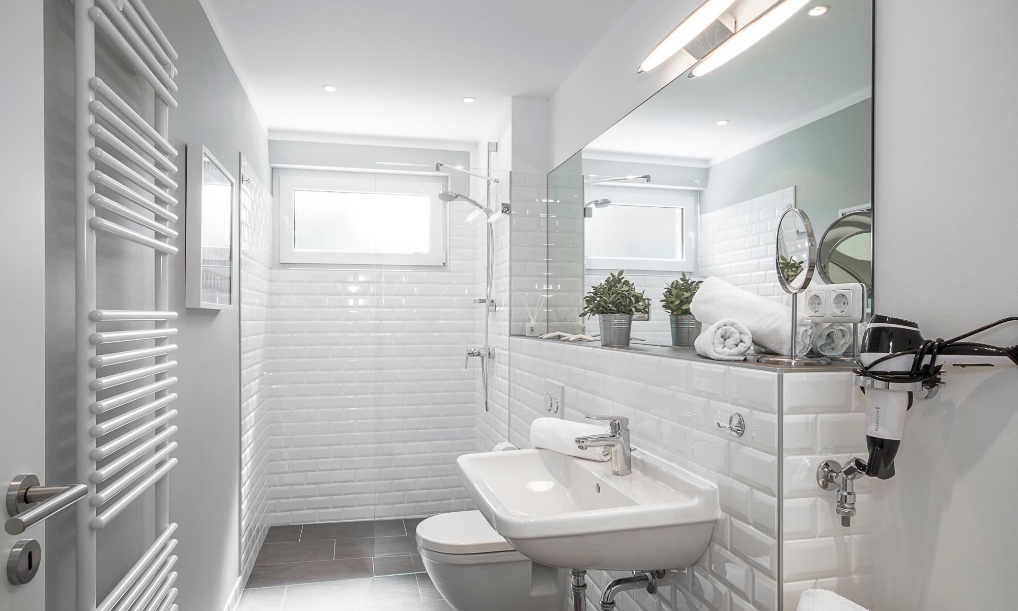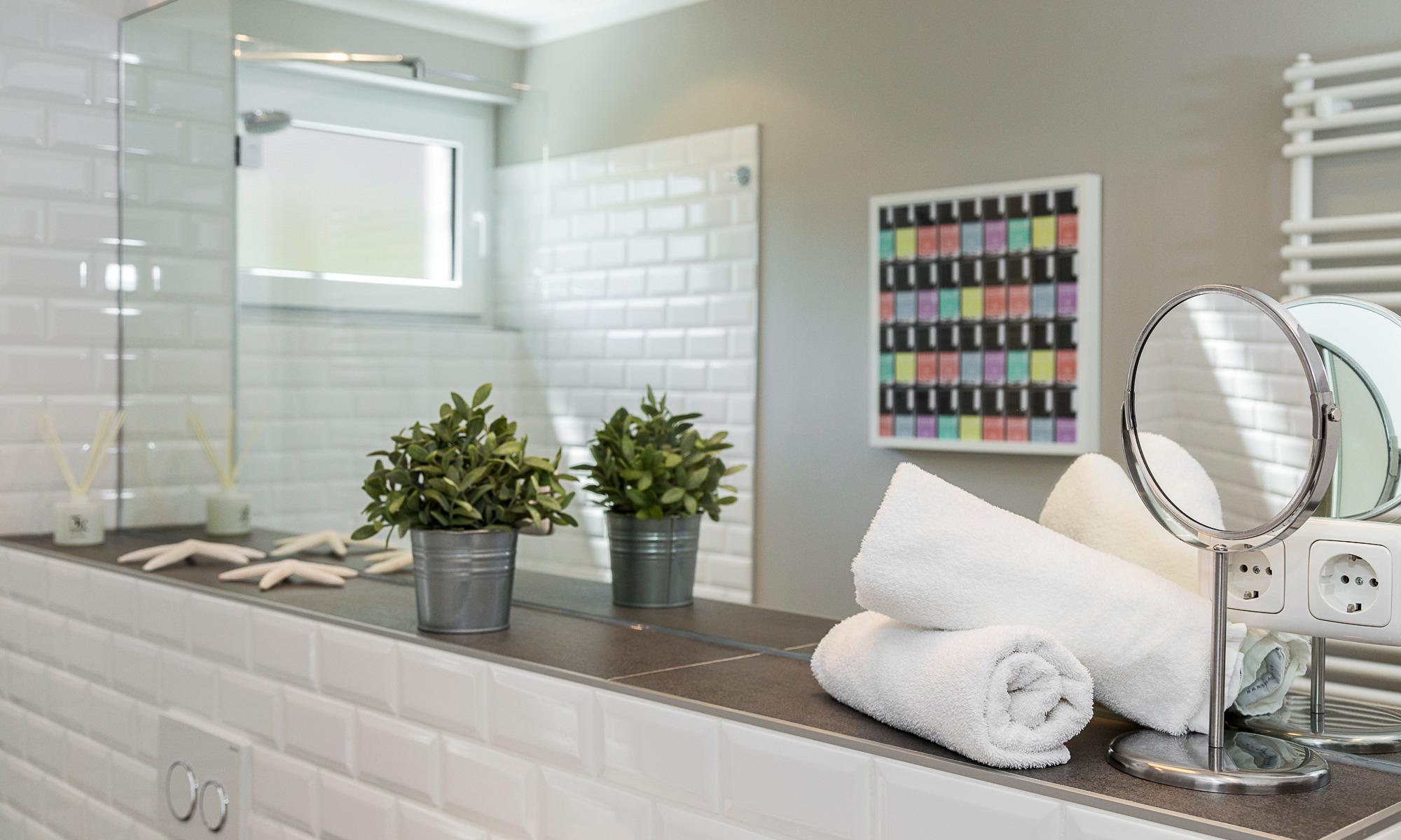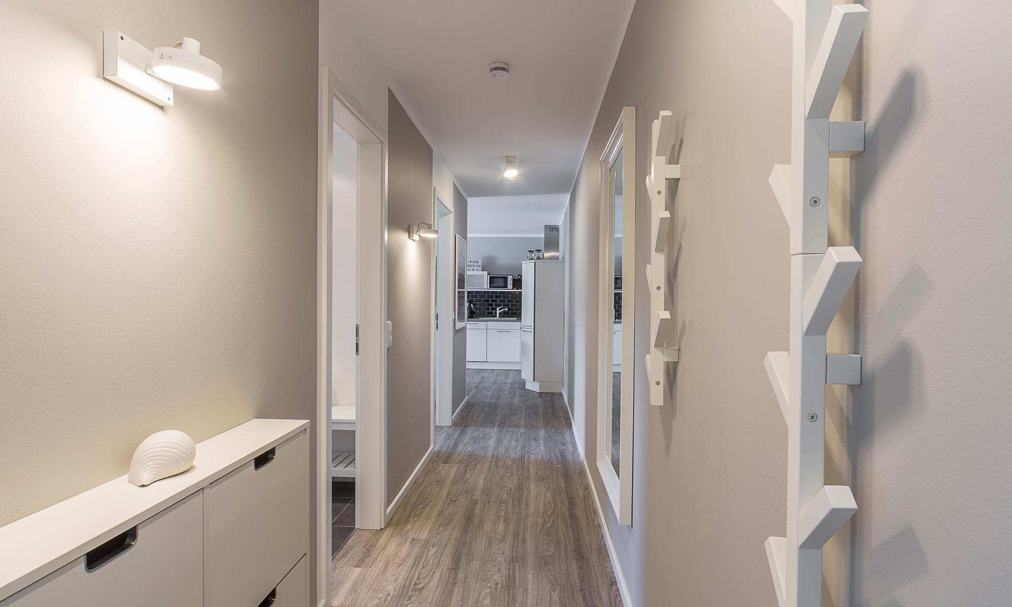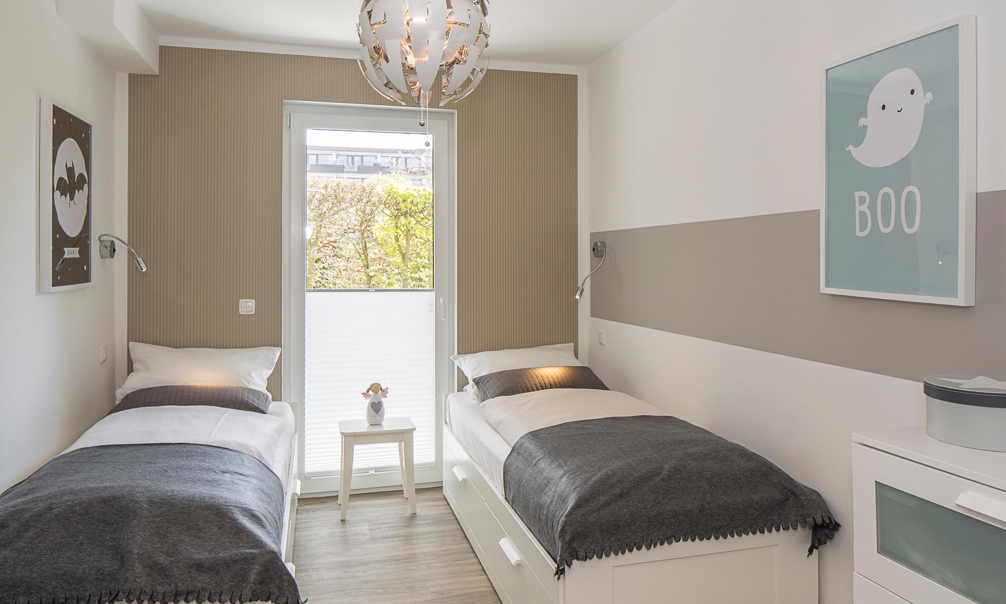 Der moderne Wohn-Essbereich bietet Ihnen eine gemütliche Sofaecke sowie einen großen Esstisch mit Stühlen für gesellige Stunden. Auf der angrenzenden Terrasse nach Westen genießen Sie die Nachmittagssonne. Neben einem Flach-TV, einer Stereoanlage und einem BluRay-Player steht Ihnen selbstverständlich kostenloses WLAN zur Verfügung. Die moderne Küche ist komplett ausgestattet und lässt keine Wünsche offen. Das Bad verfügt über eine bodentiefe Dusche und einen extra Handtuchheizkörper. Das 1. Schlafzimmer ist mit einem Boxspringbett (1,80 x 2,00m), das 2. Schlafzimmer mit zwei Einzelbetten (0,80 x 2,00m) ausgestattet.
