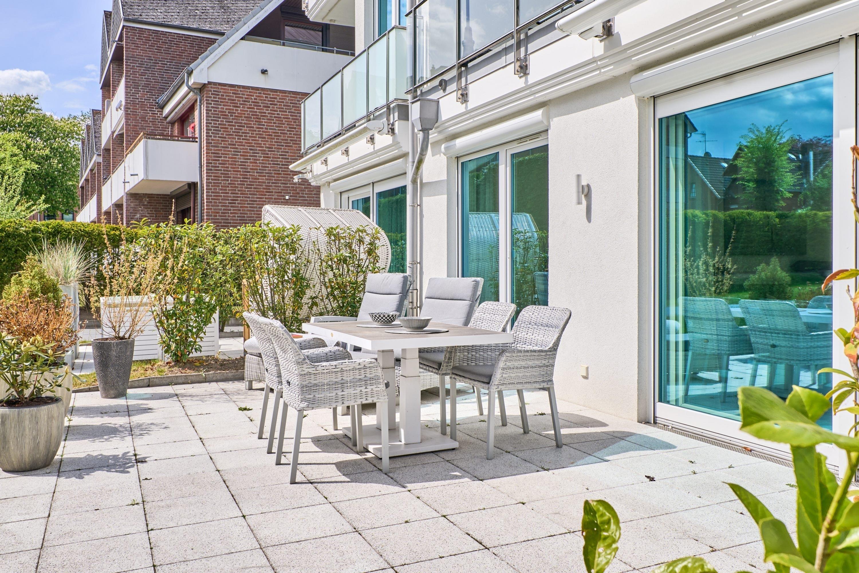 2-Zimmer-Ferienwohnung, ca. 48 m² zzgl. Terrasse in der Hansa-Straße 11. Diese sehr schöne, neue 2-Zimmerwohnung liegt im Erdgeschoss, Sonnenterrasse mit elektrischer Markise, bodentiefe Fenster, Außenrollläden, kostenfreies WLAN, Tiefgaragenstellplatz[nbsp] (Durchfahrthöhe 2,00 m).