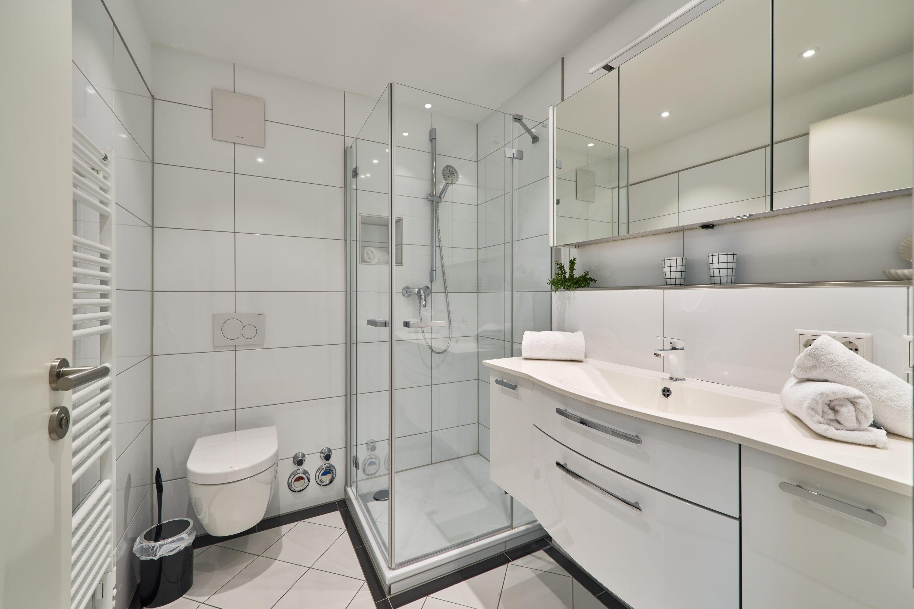 Das Schlafzimmer ist mit einem Boxspringbett (1,80 x 2,00m) ausgestattet und verfügt über einen Kleiderschrank, 2 Nachttische und TV SAT. Das Duschbad mit Dusche und Handtuchheizkörper, Fön, Kosmetikspiegel. Die ganze Wohnung ist mit einer Fußbodenheizung sowie mit einem Sicht- bzw. Lichtschutz an allen Fenstern und zusätzlichen elektrischen Rollläden ausgestattet. Waschmaschine und Trockner stehen Ihnen im Gemeinschaftskeller zur Verfügung und sind über einen Münzzähler zu bedienen.