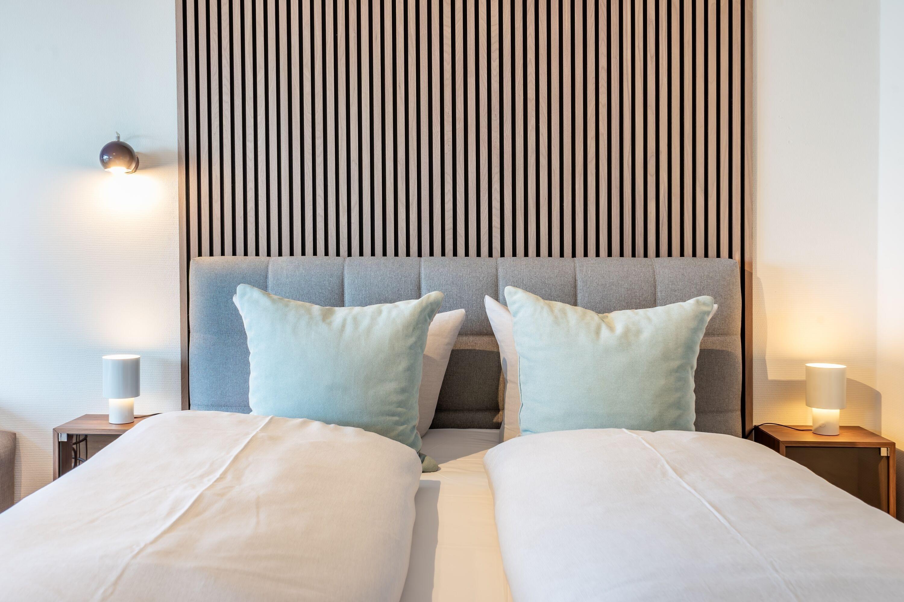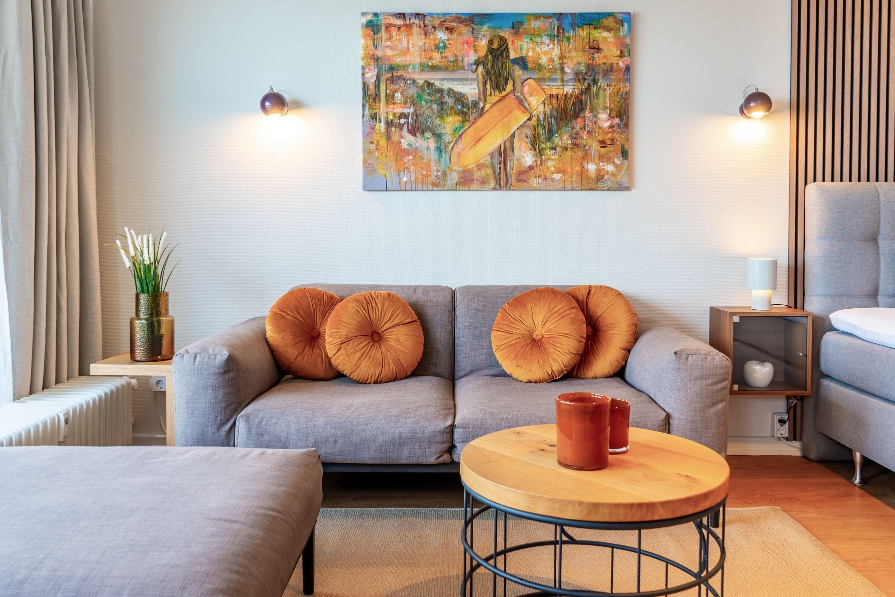 Diese 1-Zimmerwohnung bietet Platz für bis zu 2 Personen. Verschiedene Design-Klassiker sorgen für eine stylische und gleichzeitig gemütliche Atmosphäre. Es erwarten Sie ein bequemes Schlaraffia Boxspringbett (1,80x2,00m) und eine elegante Designer-Wohnzimmercouch von Rolf Benz, von welcher aus Sie den traumhaften Blick auf die Ostsee genießen können. Ein modernes Duschbad mit Kosmetikspiegel, eine Küchenzeile mit einem Geschirrspüler, einer Senseo-Kaffeemaschine sowie einer Filterkaffeemaschine und einem Wasserkocher, WLAN und ein Flachbildfernseher runden das Angebot ab. Die große Terrasse mit Blick auf die Ostsee lädt zum "Outdoor-Living" ein. Durch die Terrassenbauweise des Hauses können Sie hier viele Sonnenstunden genießen. Für Ihren PKW steht Ihnen hinter dem Haus ein Stellplatz zur Verfügung. Falls Sie eigene Fahrräder mitbringen möchten, können Sie diese in einer, nur zu dieser Wohnung gehörenden, abschließbaren Fahrradbox unterbringen.