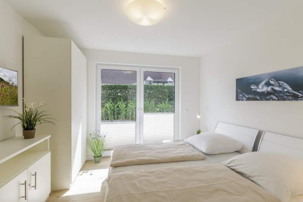 Das erste Schlafzimmer ist mit einem Boxspringbett (180 x 200m), das zweite Schlafzimmer mit zwei Einzelbetten (90 x 200m) und je einem Flach-TV sowie einem Kleiderschrank ausgestattet. Durch die Außenrollläden können Sie auf Ihren Wunsch die Schlafzimmer verdunkeln, ganz so, wie Sie es möchten. Das Badezimmer hat Tageslicht, eine bodengleiche Dusche, Handtuchheizkörper und Fußbodenheizung. Ein Tageslicht-Gäste-WC steht ebenfalls zur Verfügung.