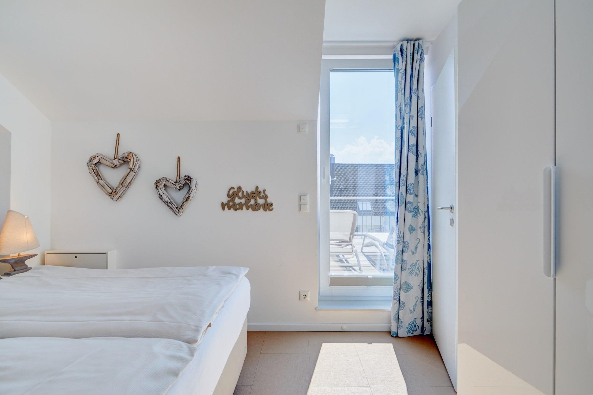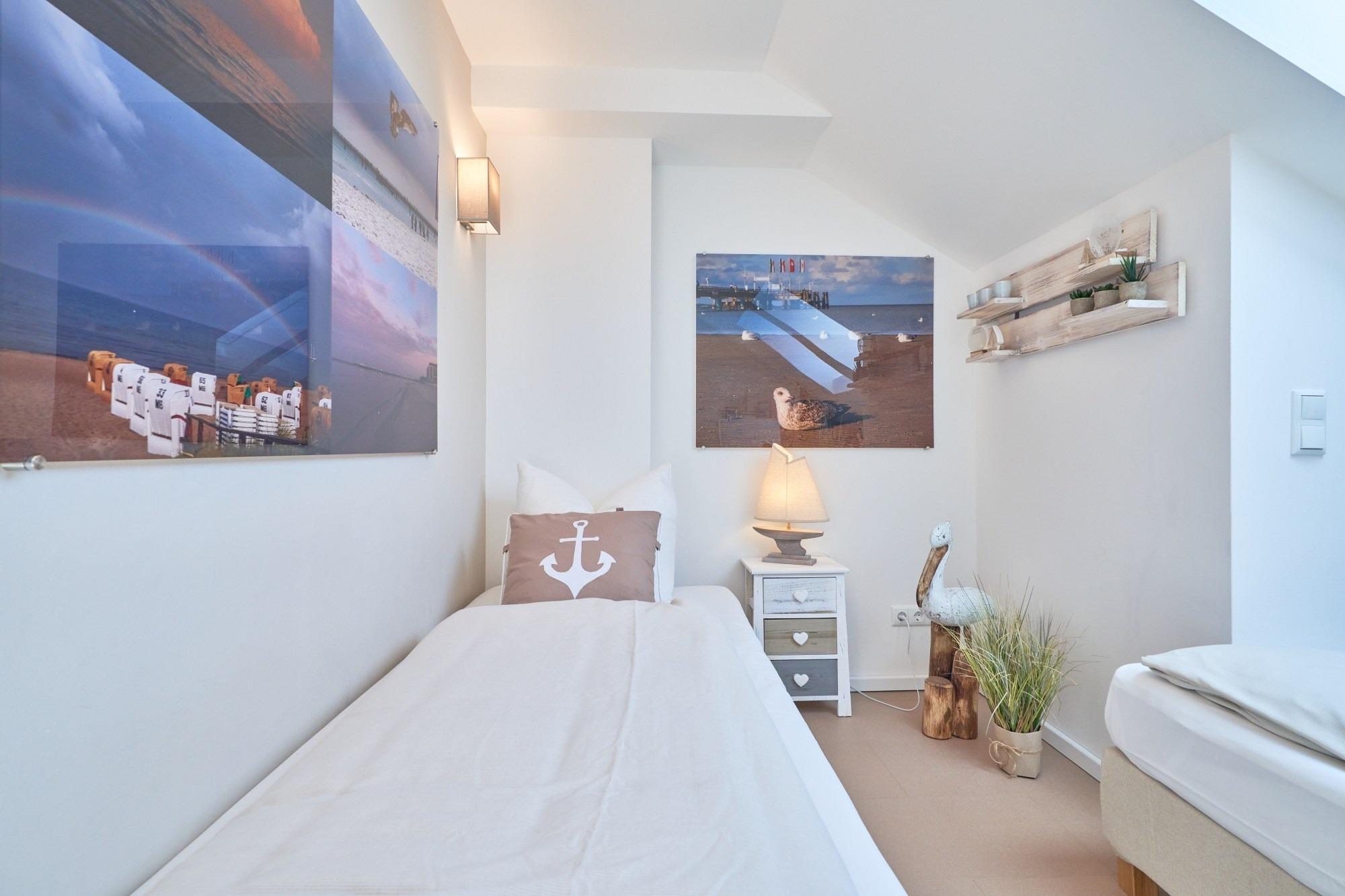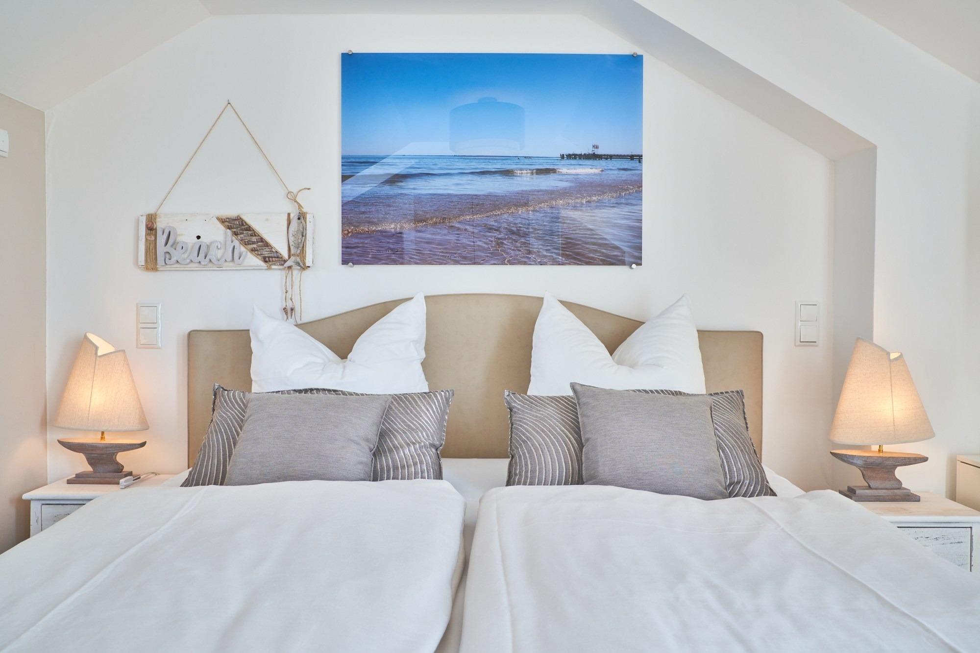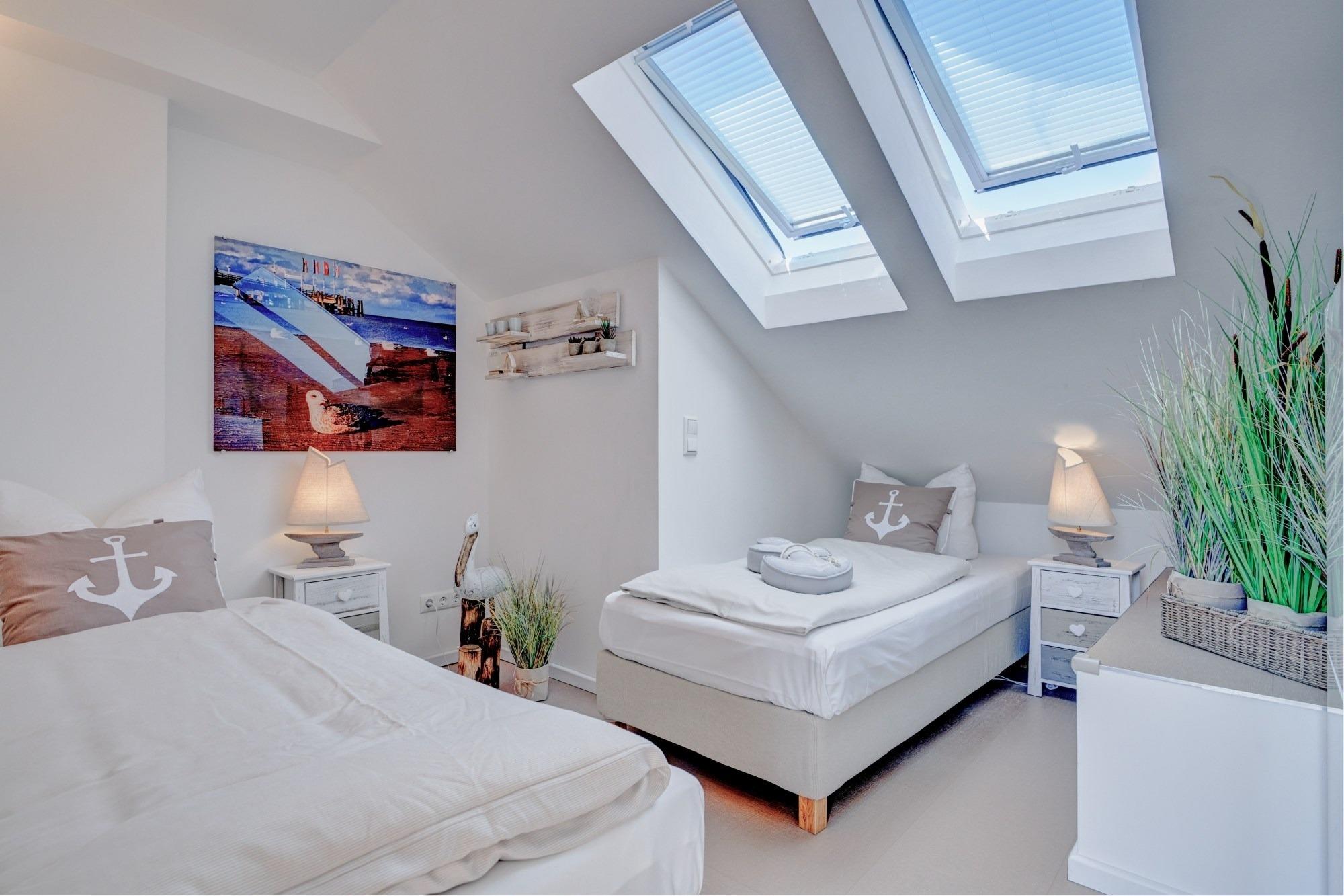 Über eine bequeme Treppe gelangen Sie in das Obergeschoss. Hier eröffnen sich zwei Schlafzimmer sowie eine große Dachterrasse. Das erste Schlafzimmer ist mit zwei Boxspring-Einzelbetten (90 x200m), einer Kommode sowie 2 Nachttischen ausgestattet. Das zweite Schlafzimmer ist mit einem Ruf-Boxspringbett (180 x200m), einem Kleiderschrank, zwei Nachttischen sowie einem Flachbildfernseher ausgestattet. Alle Fenster im Obergeschoss sind mit elektrischen Außenrollläden zu verdunkeln. Auf der großen Dachterrasse stehen Ihnen zwei Liegen zur Verfügung.