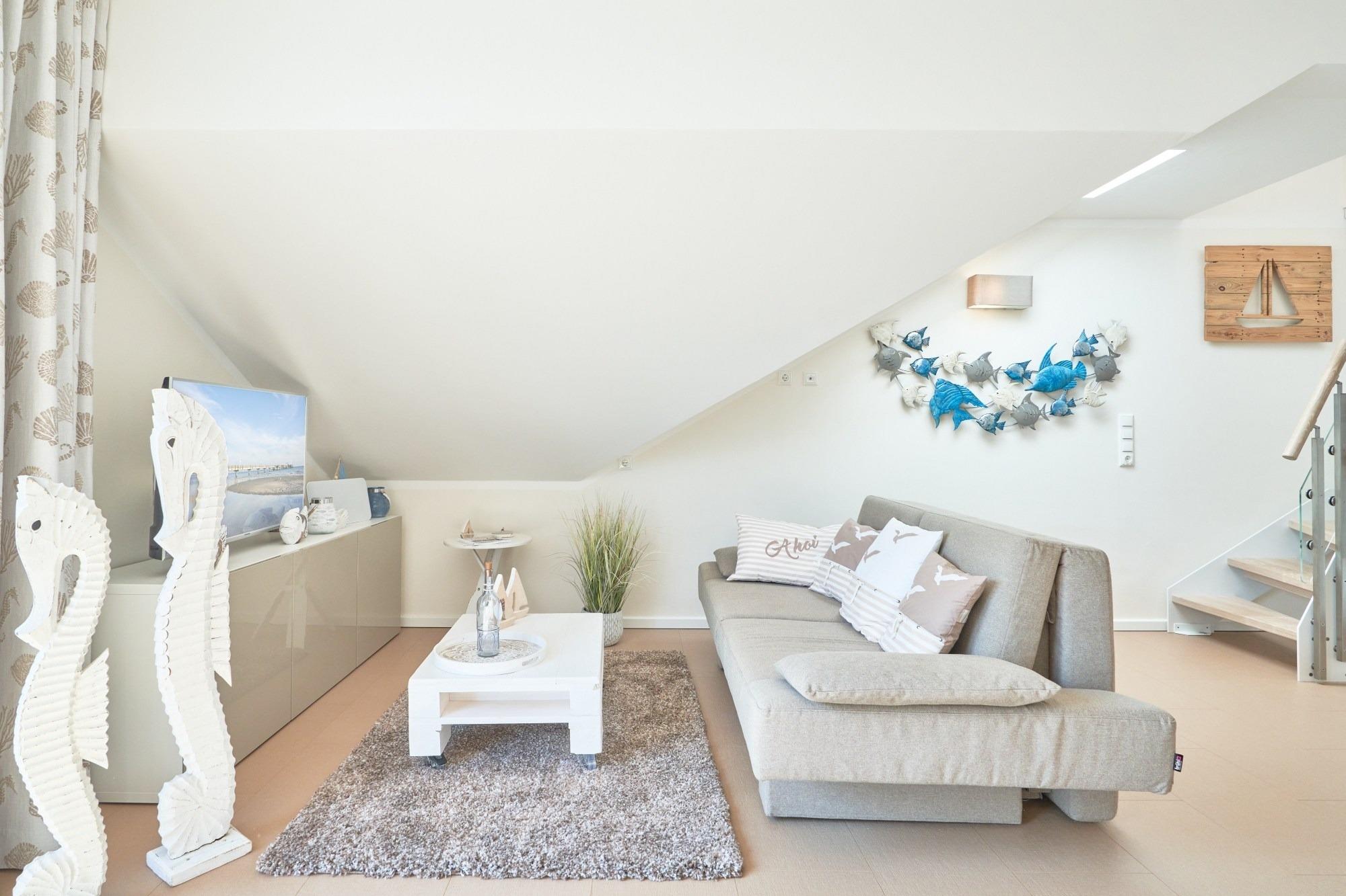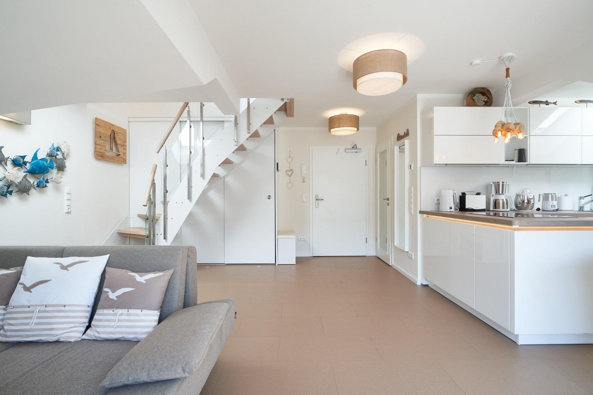 Sehr ansprechende, hochwertige und mit viel Liebe eingerichtete Ferienwohnung. Sie ist durchgehend mit einem Plankendesign in heller Optik und Fußbodenheizung ausgestattet. Der Wohnraum verfügt über einen Essbereich sowie einen gemütlichen Sitzbereich. Die Couch lässt sich mit nur wenigen Handgriffen in eine bequeme Schlafcouch (1,40 x 2,00 m) umfunktionieren. Neben dem Flachbildfernseher steht Ihnen eine moderne HiFi-Anlage zur Verfügung. Kostenloses WLAN ist selbstverständlich. Der Balkon Richtung Süden ist mit einem runden Rattantisch mit Glasplatte und vier Stühlen ausgestattet. Die moderne Küche lässt keine Wünsche offen. Filterkaffeemaschine, Waschmaschine, Wärmeschublade, Eierkocher, Toaster, Mixer, Passierstab sowie eine Alessi-Saftpresse finden hier unter anderem ihren Platz. Helles Duschbad, bodentiefe Dusche sowie Handtuchheizkörper.