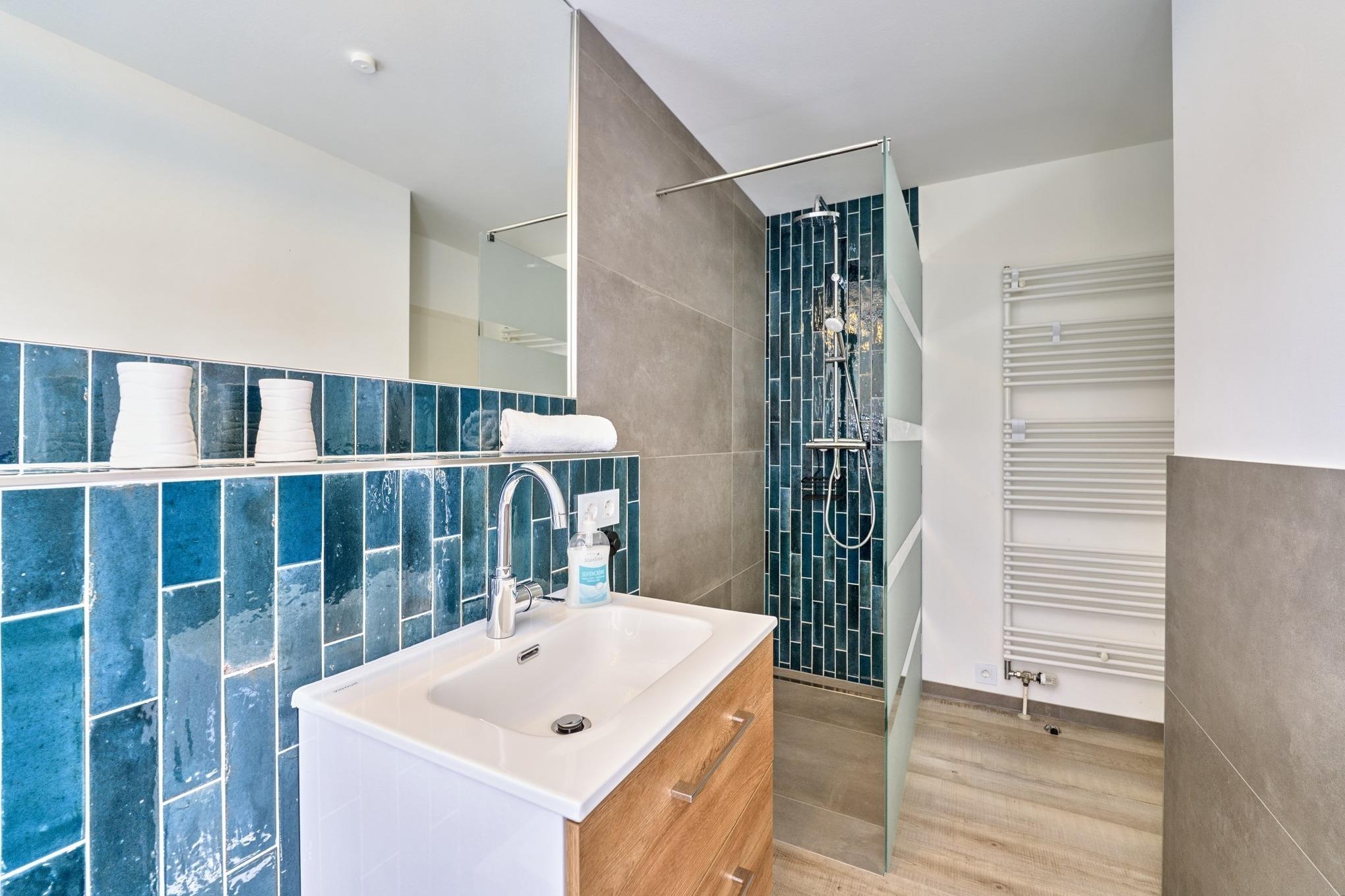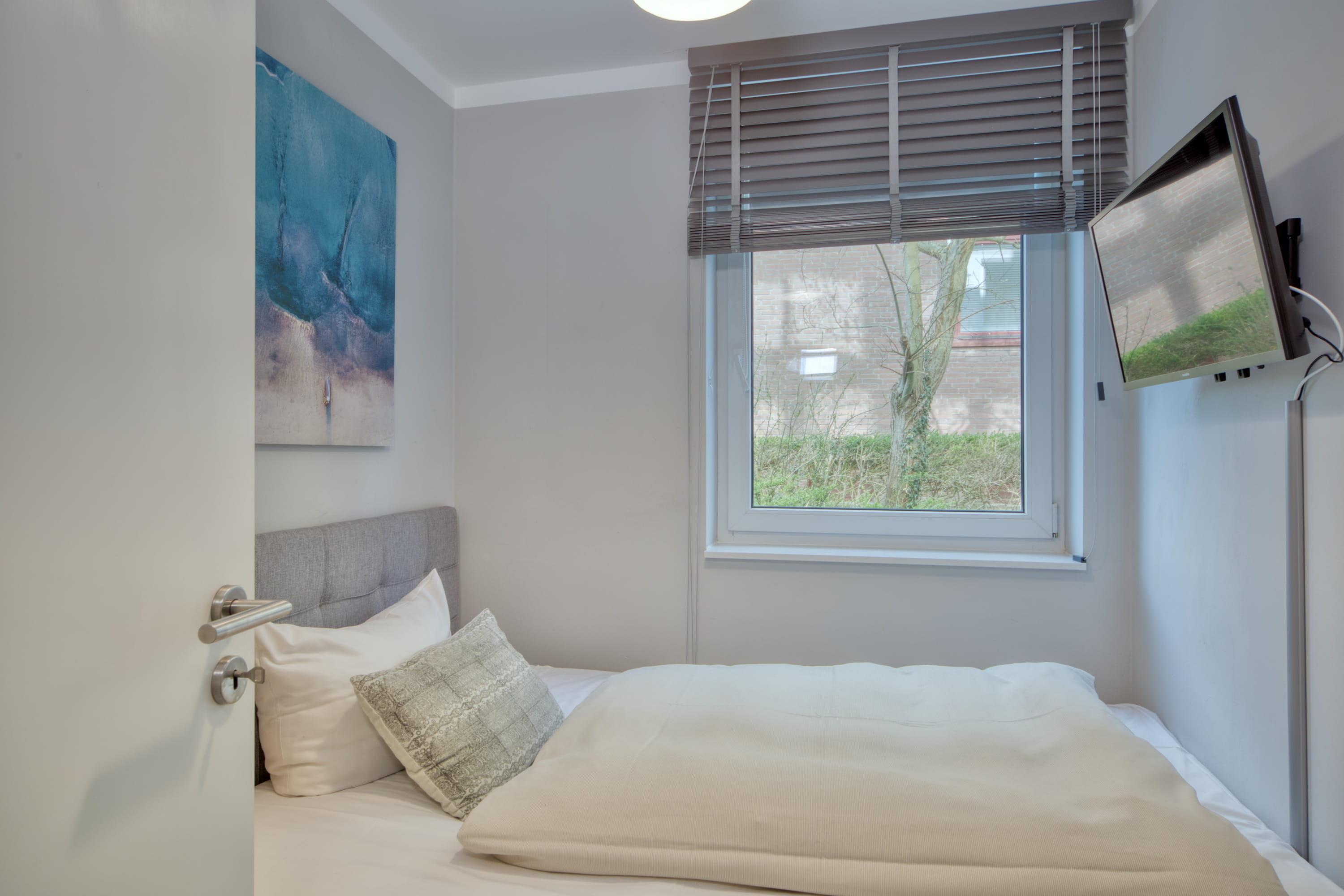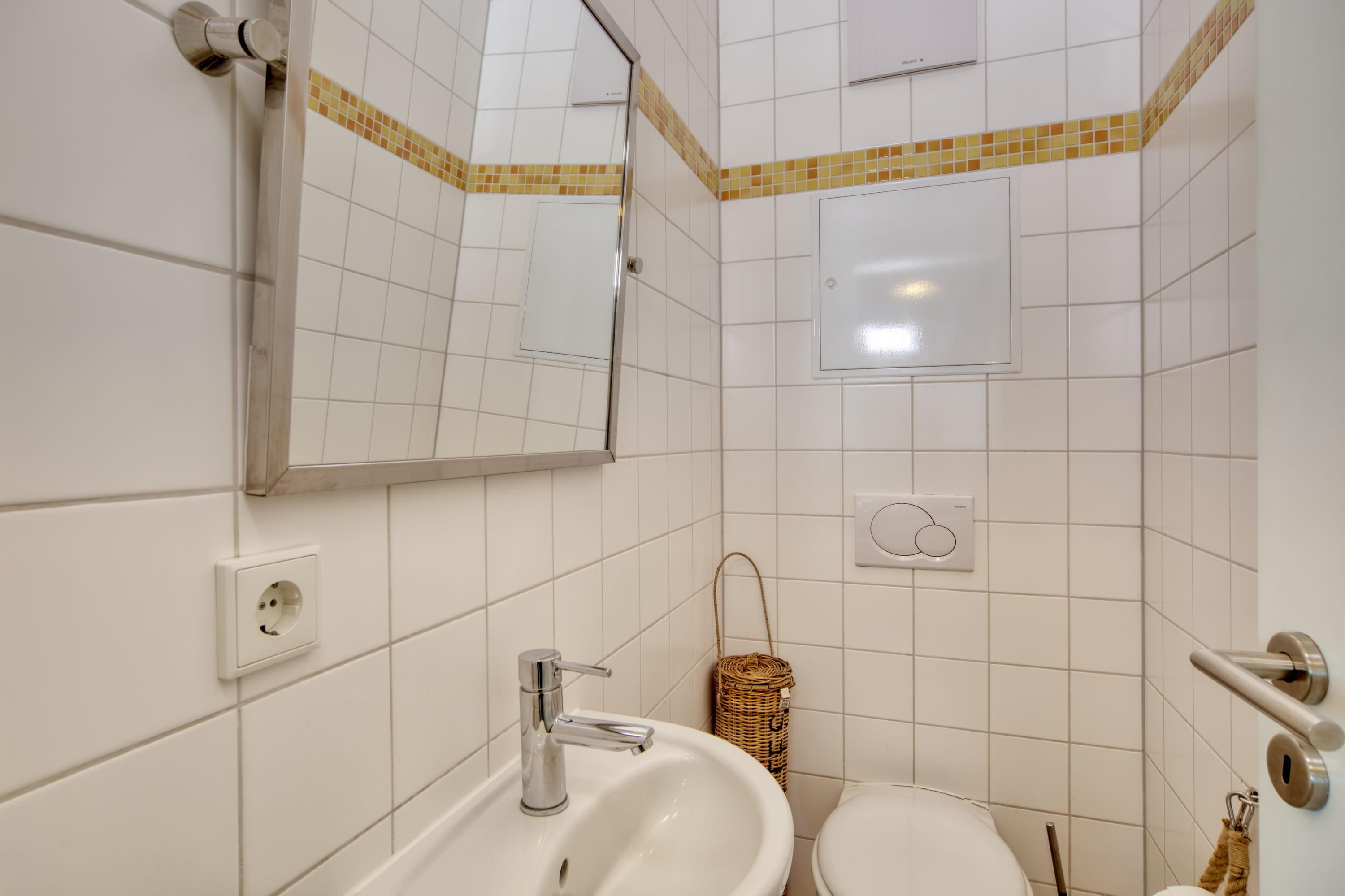 (1,80 x 2,00m) und einem Flachbildfernseher ausgestattet. Von hier erreichen Sie die zweite Terrasse. Ein weiteres Schlafzimmer ist mit einem Doppelbett (1,40 x 2,00m) sowie mit einem TV eingerichtet. Diese Ferienwohnung hat ein großes, tageslichtreiches Bad mit ebenerdiger Dusche und ein separates WC. Im Keller des Hauses befinden sich Waschmaschine und Wäschetrockner, beide sind über einen Münzzähler zu bedienen.