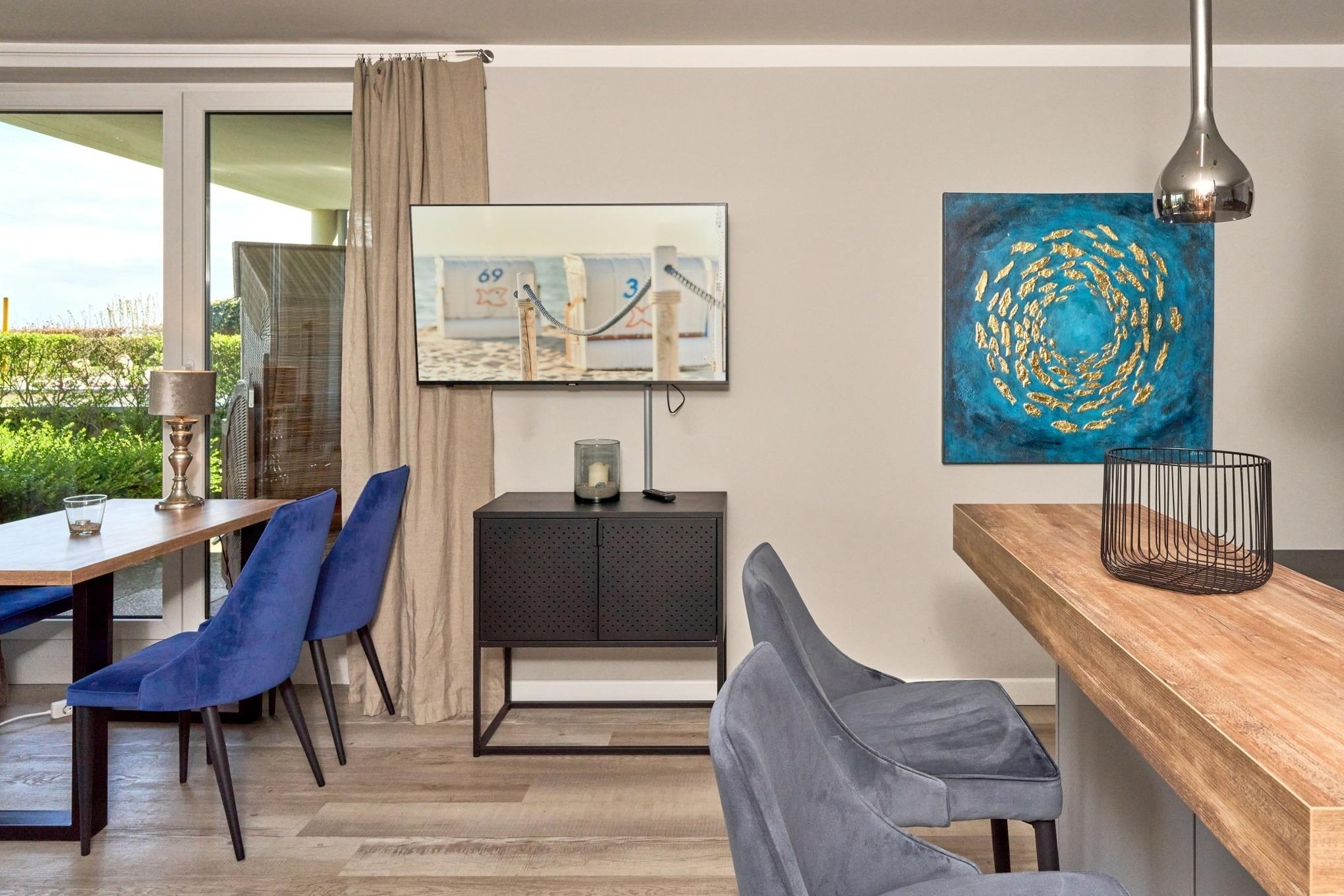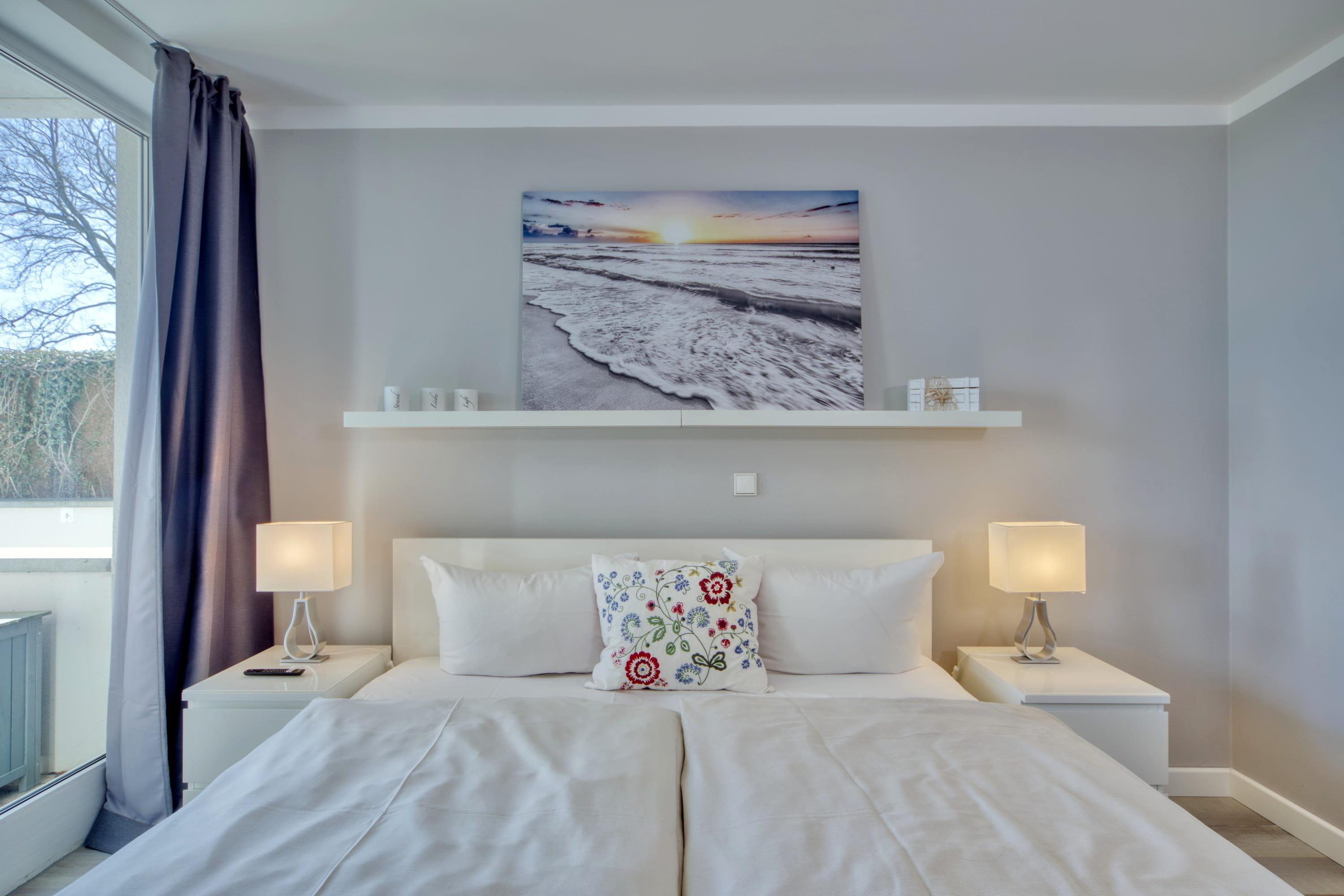 Diese gemütliche 3-Zimmer-Ferienwohnung bietet Ihnen neben dem traumhaften Blick auf die Lübecker Bucht und die Ostsee alles, was Ihr Urlaubsherz begehrt. Der Wohn-Essbereich ist geschmackvoll eingerichtet und verfügt über SAT/Kabel-TV und einen kostenlosen WLAN-Anschluss. Aus dem Wohnzimmer gelangen Sie auf die erste Terrasse Richtung Osten und können den Blick über die Ostsee schweifen lassen. Das gemütliche Schlafzimmer ist mit einem geräumigen Kleiderschrank, einem Boxspringbett