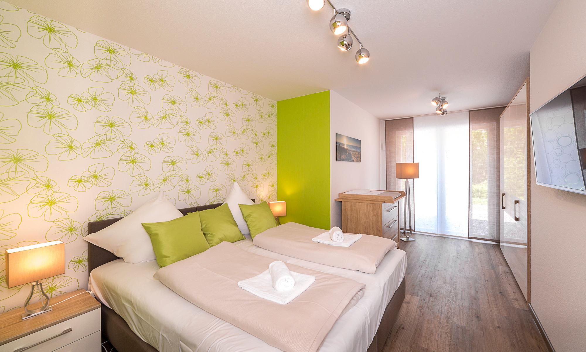 Das erste Schlafzimmer ist mit einem Musterring-Boxspringbett Evolution 180x200, einem Kleiderschrank, einem Flach-TV sowie einer (Wickel-)Kommode HARO und PAIDI ausgestattet, das zweite Schlafzimmer mit zwei Einzelbetten, einem Musterring-Boxspringbett Evolution ( 90x200) und einem Flach-TV.