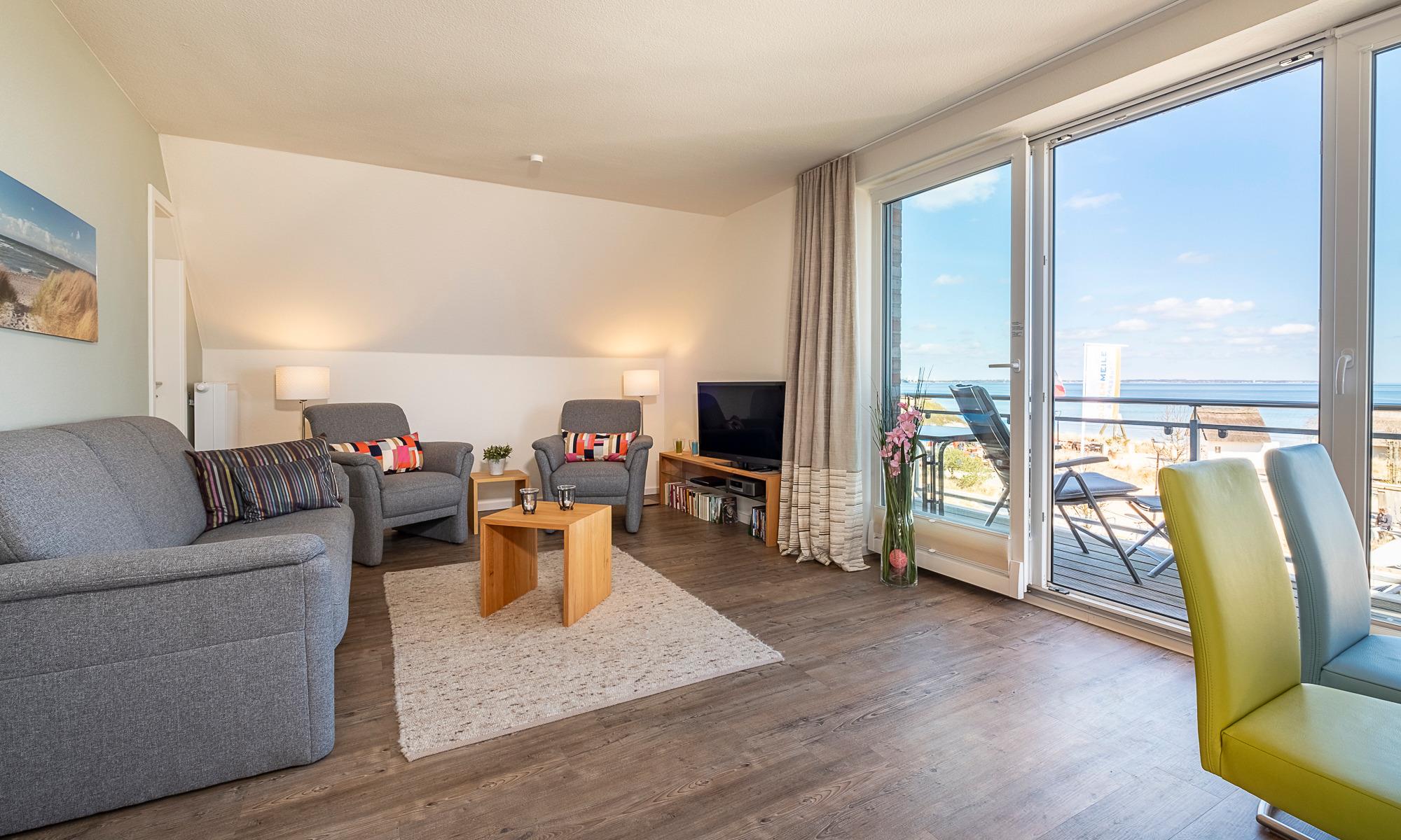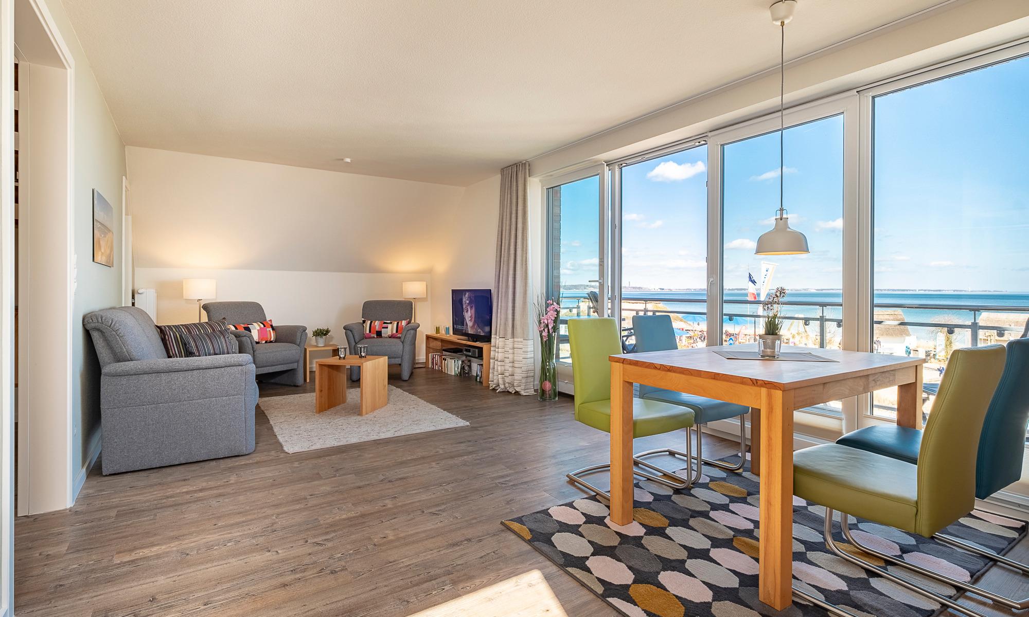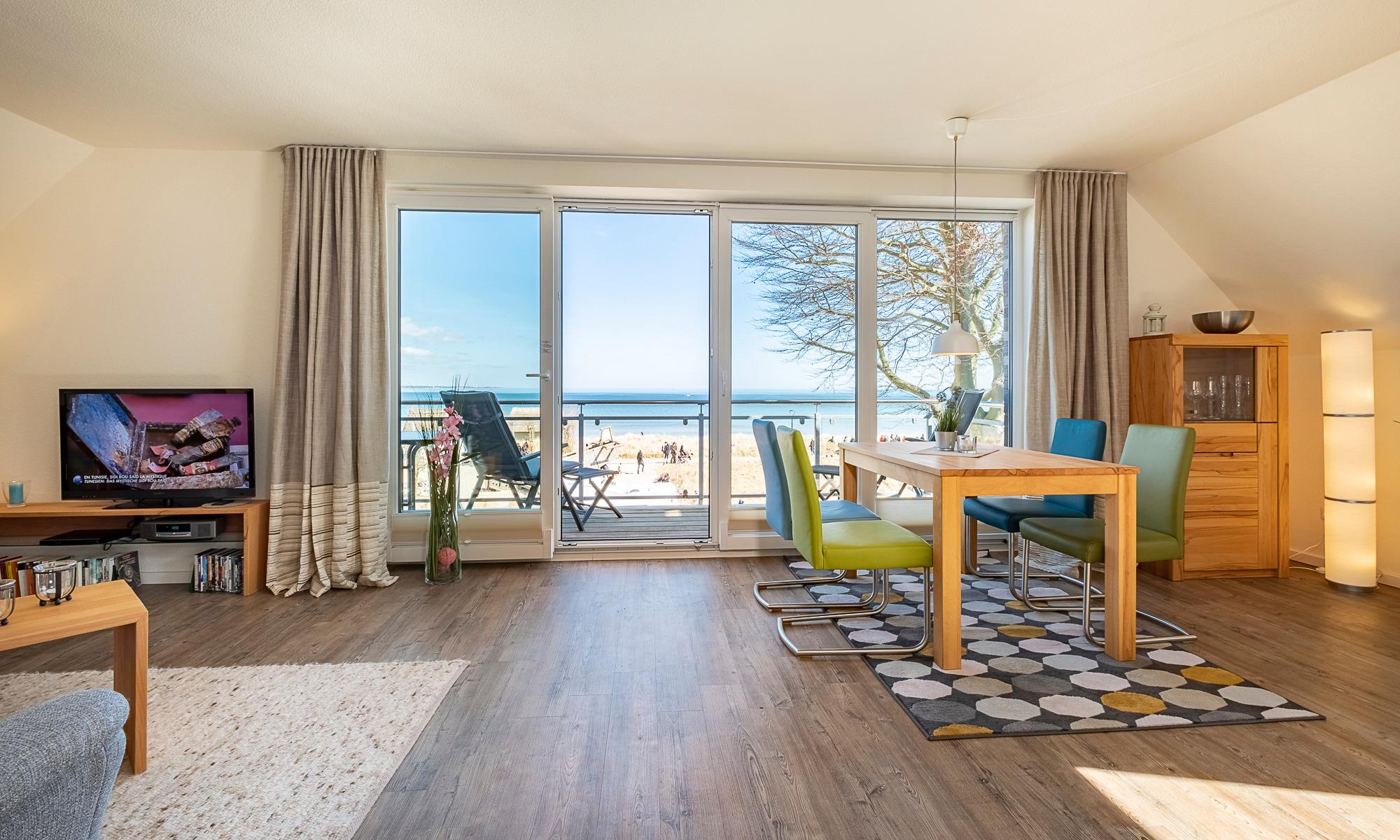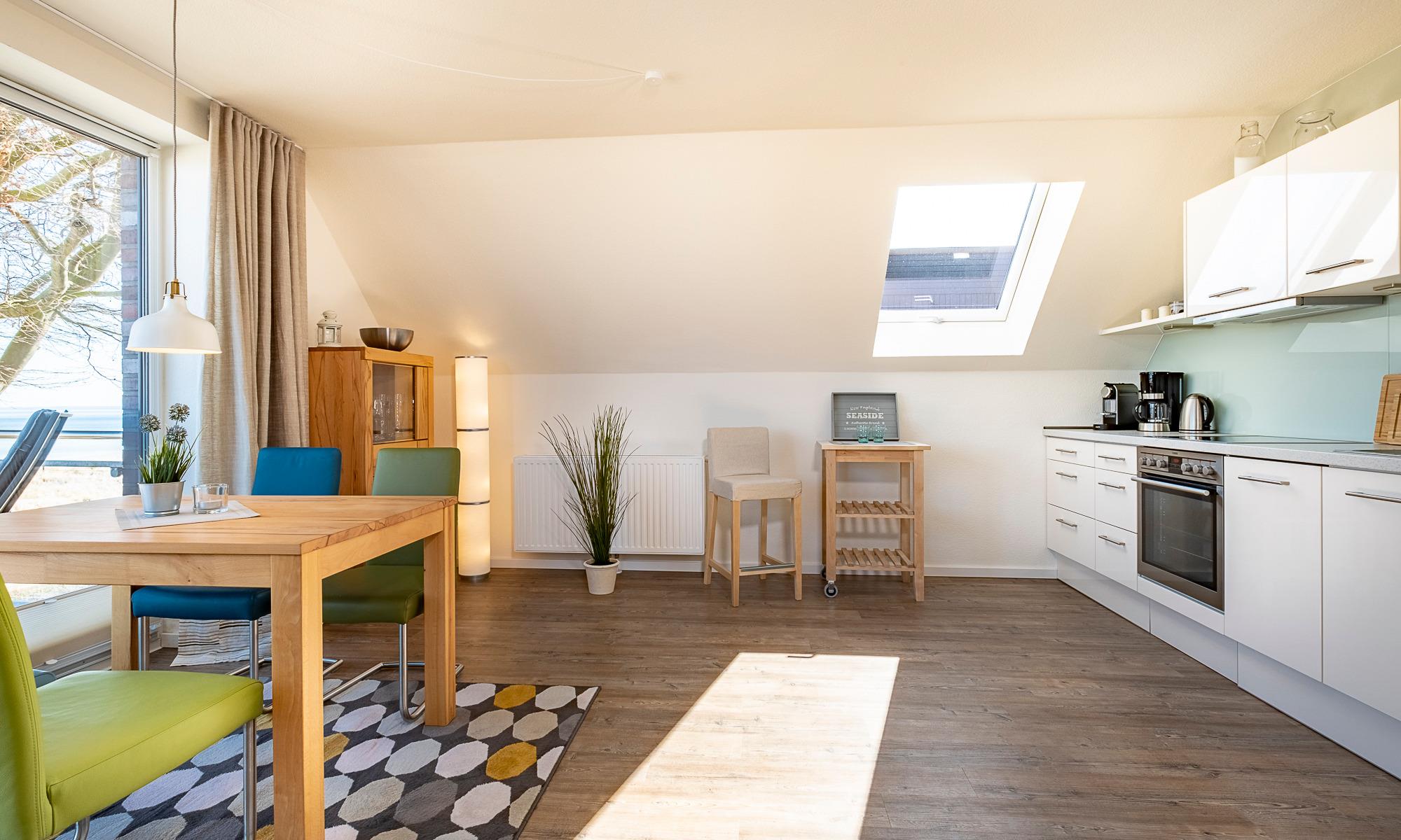 Heller, großer Wohn-Essbereich mit weitem Blick auf die Ostsee. Tiefer sowie breiter Balkon mit Tisch und Stühlen, Ostseeblick pur. Schöner Wohnbereich mit einem Sofa, 2 Sesseln sowie Beistelltischen. Flach-TV, DVD-Player, Bose-Radio, CD-Player, Bücher, Spiele und DVD´s. Der Essbereich bietet Ihnen Platz für 4 Personen. Hier können Sie ausgiebig frühstücken und den Ostseeblick genießen. Die moderne Küche ist komplett ausgestattet und lässt keine Wünsche offen. Neben der Filterkaffeemaschine steht Ihnen hier zusätzlich eine Nespresso-Maschine zur Verfügung. Kleiner Abstellraum. Selbstverständlich steht Ihnen auch in dieser Wohnung kostenloses WLAN zur Verfügung.