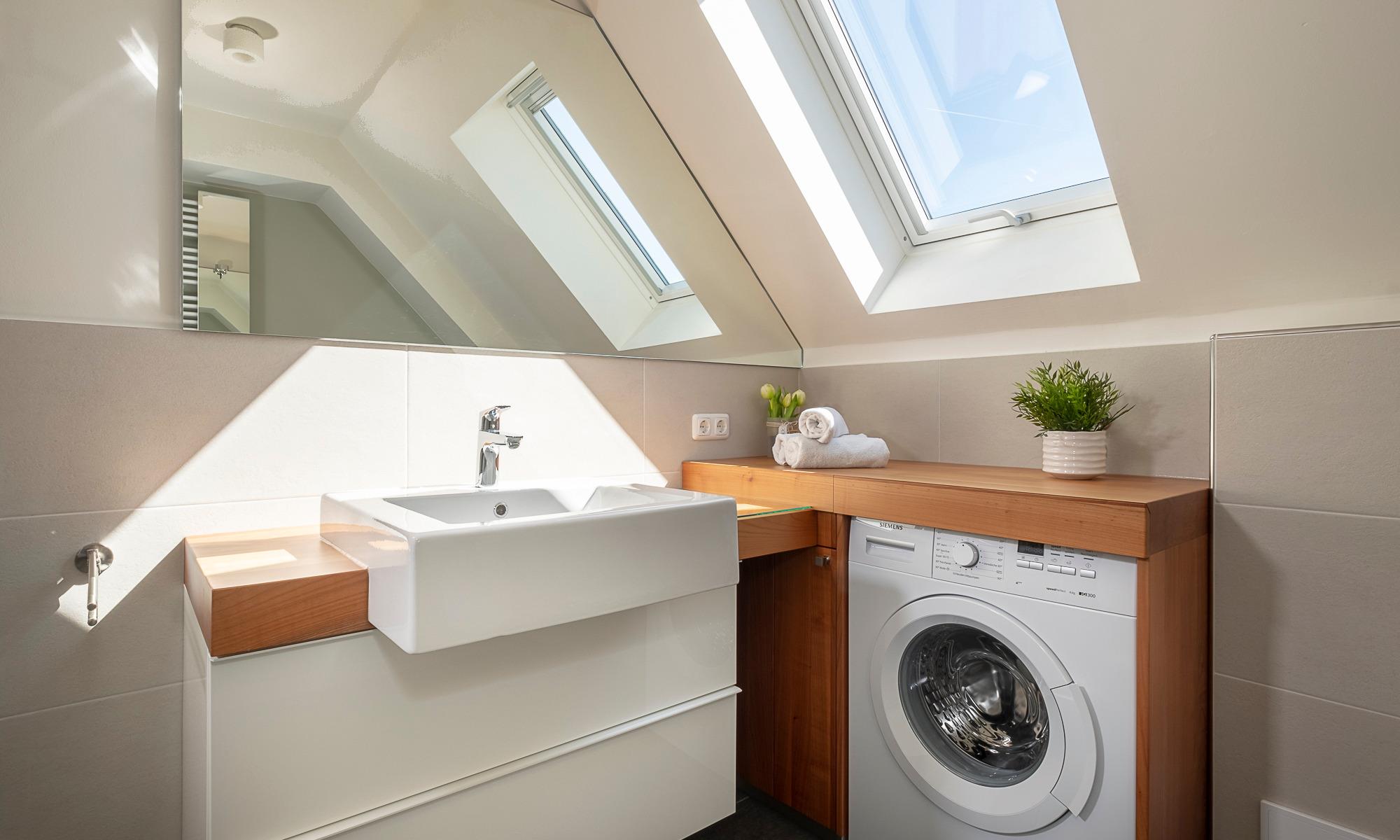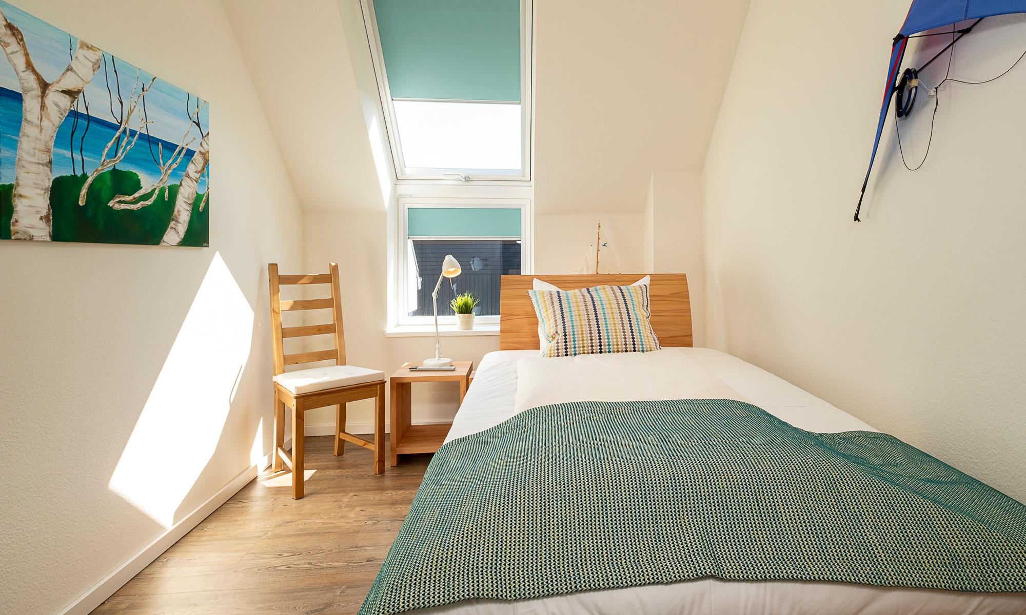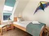 Das Tageslichtduschbad verfügt über eine bodentiefe Dusche und einen großen Waschtisch sowie eine Waschmaschine. Neben der Fußbodenheizung ist hier ein Handtuchheizkörper angebracht. Über eine bequeme Treppe erreichen Sie das Obergeschoss. Hier stehen Ihnen zwei Schlafzimmer zur Verfügung. Das eine Schlafzimmer (mit Ostseeblick) hat ein großes Doppelbett (1,80 x 2,00 m, Einzelmatratzen) mit Komforthöhe, eine große Kommode sowie einen Design-Garderobenständer/Kleideraufhängung und einen Flach-TV. Das zweite Schlafzimmer ist mit einem breiten Bett (1,20 x 2,00m) mit Komforthöhe sowie einem Kleiderschrank und Flachbild-TV ausgestattet. Hier befindet sich auch das großzügige Tageslicht-Gäste-WC mit einem Waschtisch.