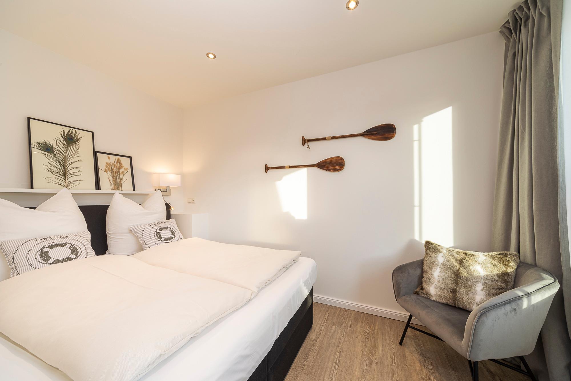 Flurbereich mit einem Einbauschrank. Großes Badezimmer mit begehbarer Dusche (1,80 x 0,90m), Kopf-/Regendusche sowie einer Sauna (bis 80 Grad), für bis zu drei Personen (canadisches Hemlocktannenholz, große Glasfront). Die sehr ansprechende Einbauküche lässt keine Wünsche offen: Spülmaschine, Nespresso-Maschine, Kaffeefiltermaschine, Toaster, Airfryer, Mixer, Pürierstab und vieles mehr sind vorhanden. Der gemütliche Essbereich ist für bis zu vier Personen geeignet. Hier finden Sie auch Platz für gesellige Spieleabende (Spielesammlung und Puzzle sind vorhanden). Der feine Wohnbereich ist mit einem bequemen Sofa ausgestattet, das in wenigen Handgriffen zu einem Schlafsofa/ Bettsofa (Liegefläche 1,60 x 2,00m, Federholzrahmen incl. Lattenrost und Matratze) umfunktioniert werden kann. Flach-TV 42", Radio mit Bluetooth-Lautsprecher und WLAN sind vorhanden. Vom Wohnzimmer aus gelangen Sie auf den Südbalkon. Hier warten ein Strandkorb sowie ein Tisch mit vier Stühlen auf Sie. Eine elektrische Markise spendet hier Schatten. Träumen mit Blick auf die Ostsee … im Strandkorb … liegt ihr Lieblingsbuch schon bereit? Das Schlafzimmer ist mit einem Boxspringbett ausgestattet. Zum Verdunkeln befinden sich Verdunklungsvorhänge an den Fenstern.
