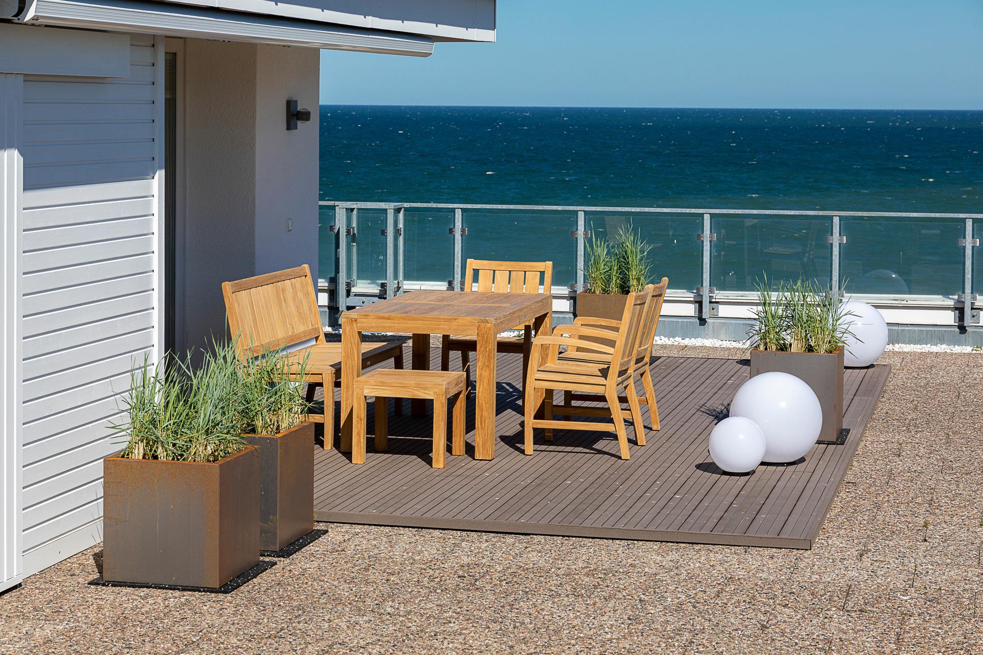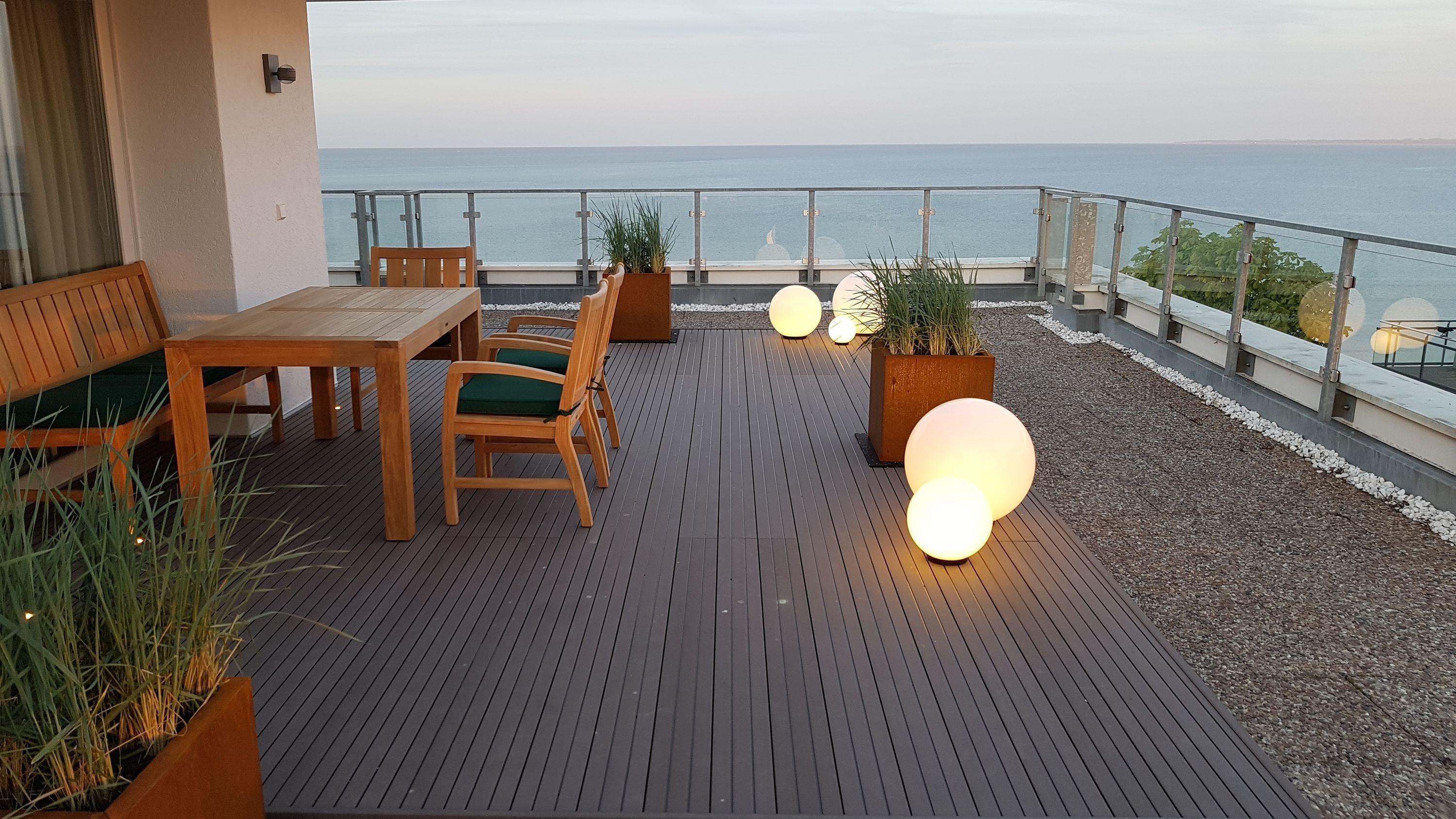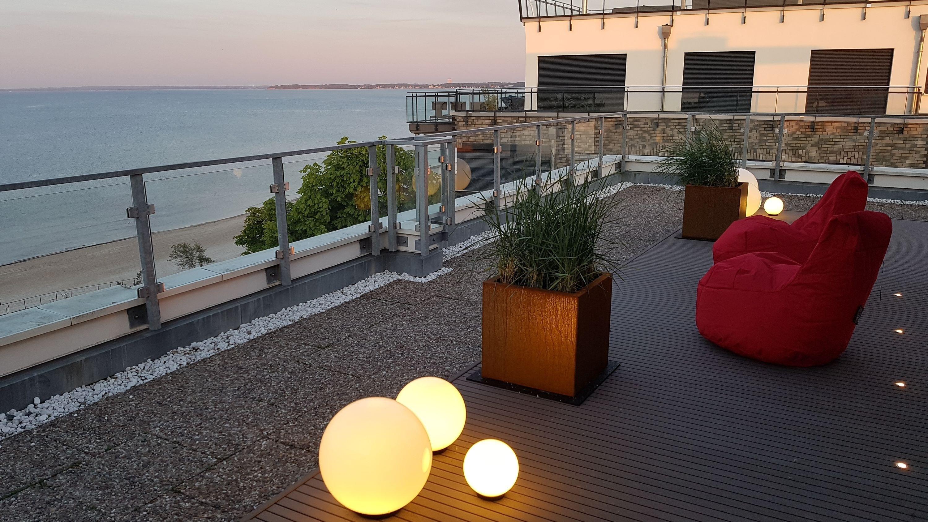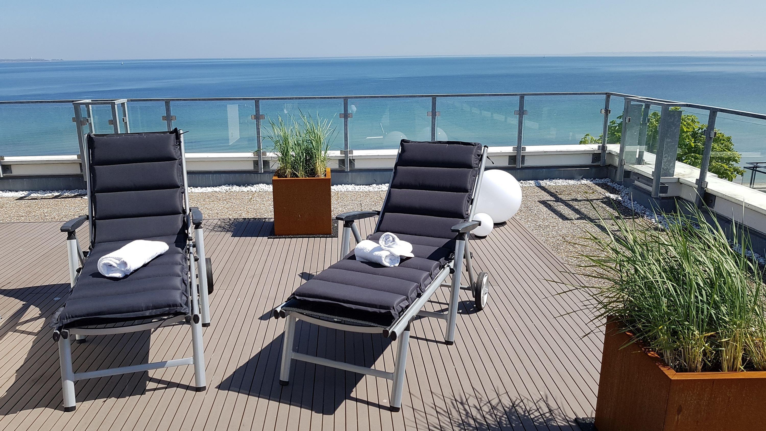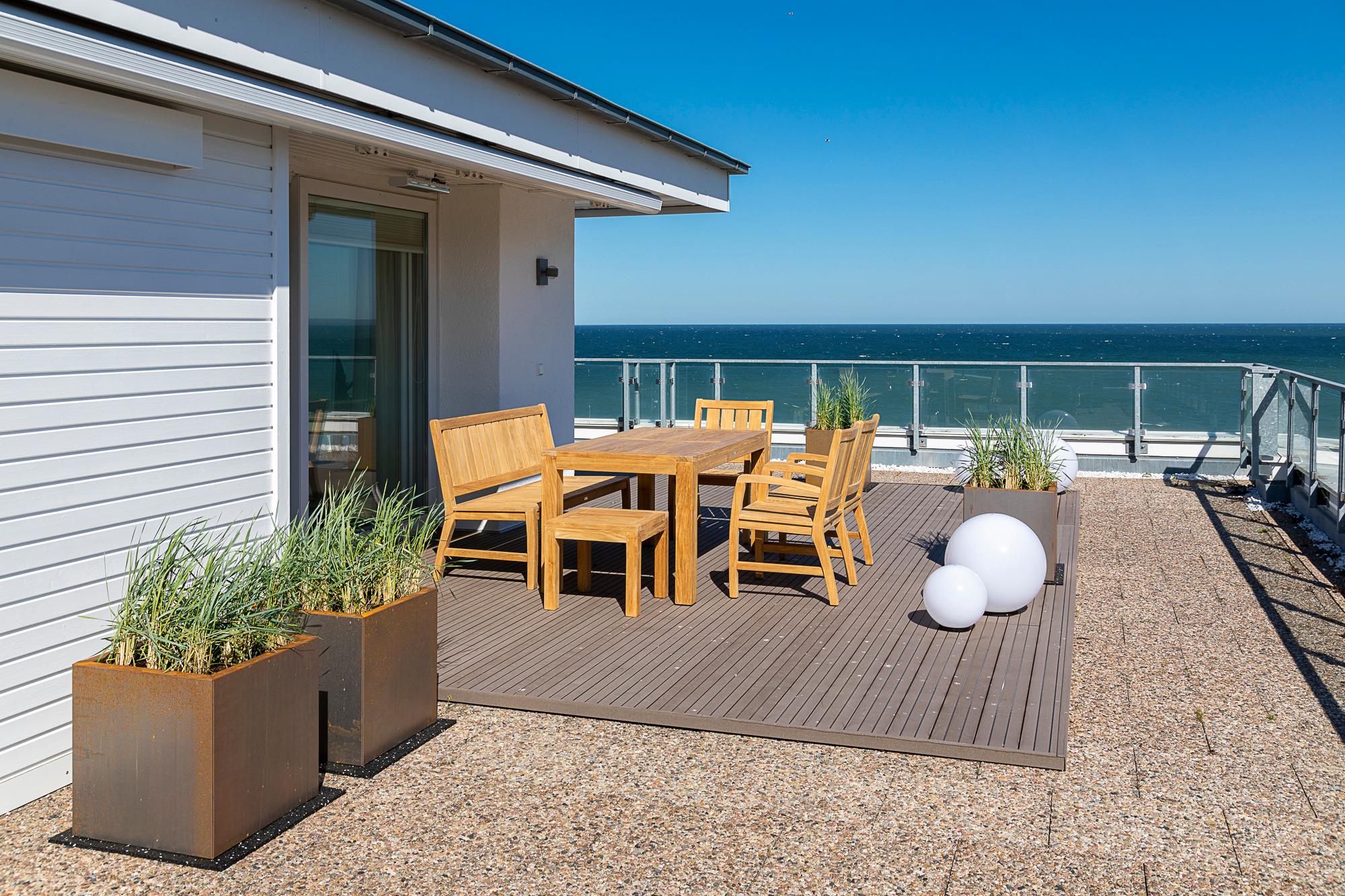 Mit dieser Penthousewohnung bieten wir unseren Gästen eine Wohlfühlwohnung der Oberklasse. Ein herrlicher Blick über die Lübecker Bucht empfängt Sie beim Eintreten ins Wohnzimmer. Die große Dachterrasse rund um das Apartment lädt zum Verweilen und Entspannen ein. Hier finden Sie garantiert Ihren Lieblingsort - im Ess- oder Sitzbereich mit Ostseeblick und Meeresrauschen, auf den Sonnenliegen zum Relaxen oder auf den gemütlichen Sitzsäcken, mit Blick in den Sonnenuntergang. In der Wohnung sind der Wohn- und Essbereich geschmackvoll eingerichtet und verfügen über ein bequemes Sofa sowie einen Esstisch mit einer Bank und Stühlen für 5 Personen. Selbstverständlich alles mit Ostseeblick. Auch beim Kochen in der komplett ausgestatteten Einbauküche bleibt Ihnen der Blick auf die Ostsee nicht verwehrt.
