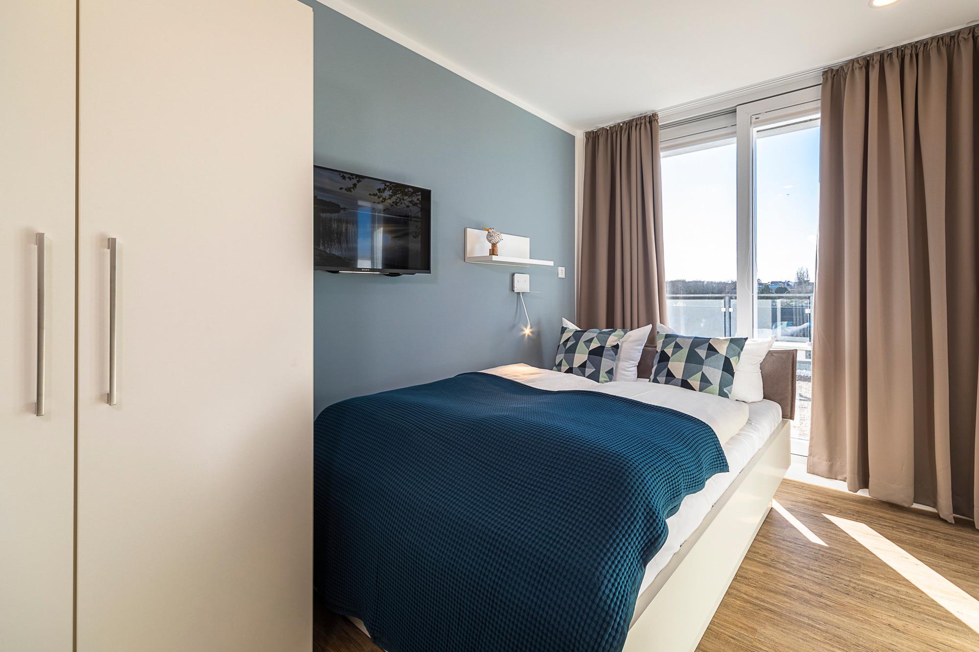 Das große Schlafzimmer ist mit einem Boxspringbett (180 x 200 cm) ausgestattet. Die weiteren zwei Schlafzimmer besitzen Betten mit verstellbaren Lattenrosten in den Größen 140 x 200 cm und 90 x 200 cm. Alle Schlafzimmer, wie auch das Wohnzimmer, haben direkten Zugang zur Dachterrasse. Die technische Ausstattung dieser Ferienwohnung lässt keine Wünsche offen: 4 moderne Flachbildfernseher; 1 Onkyo-Netzwerk-CD-Receiver mit Einbau-Hifi-Boxen und Subwoofer sowie kostenloses WLAN in allen Räumen und auf der Dachterrasse.