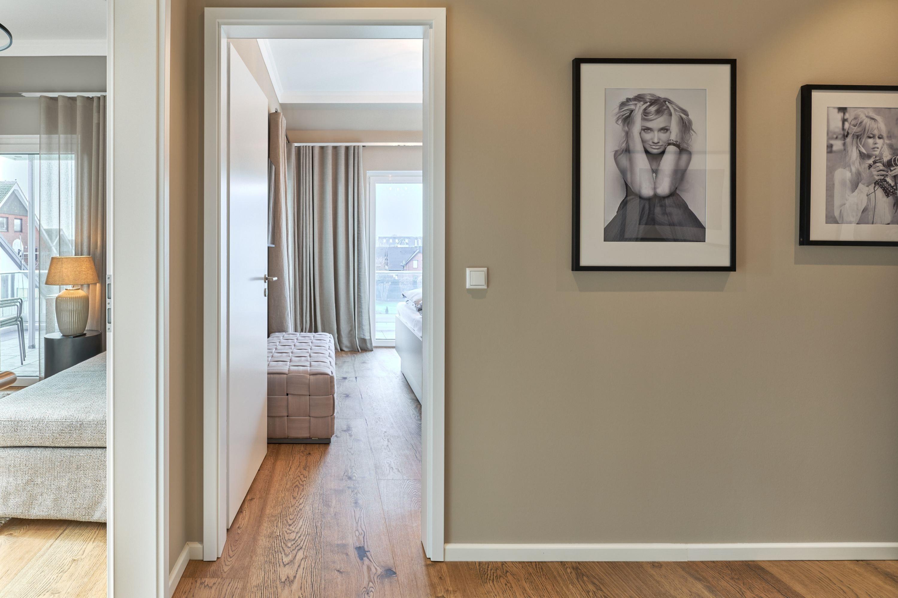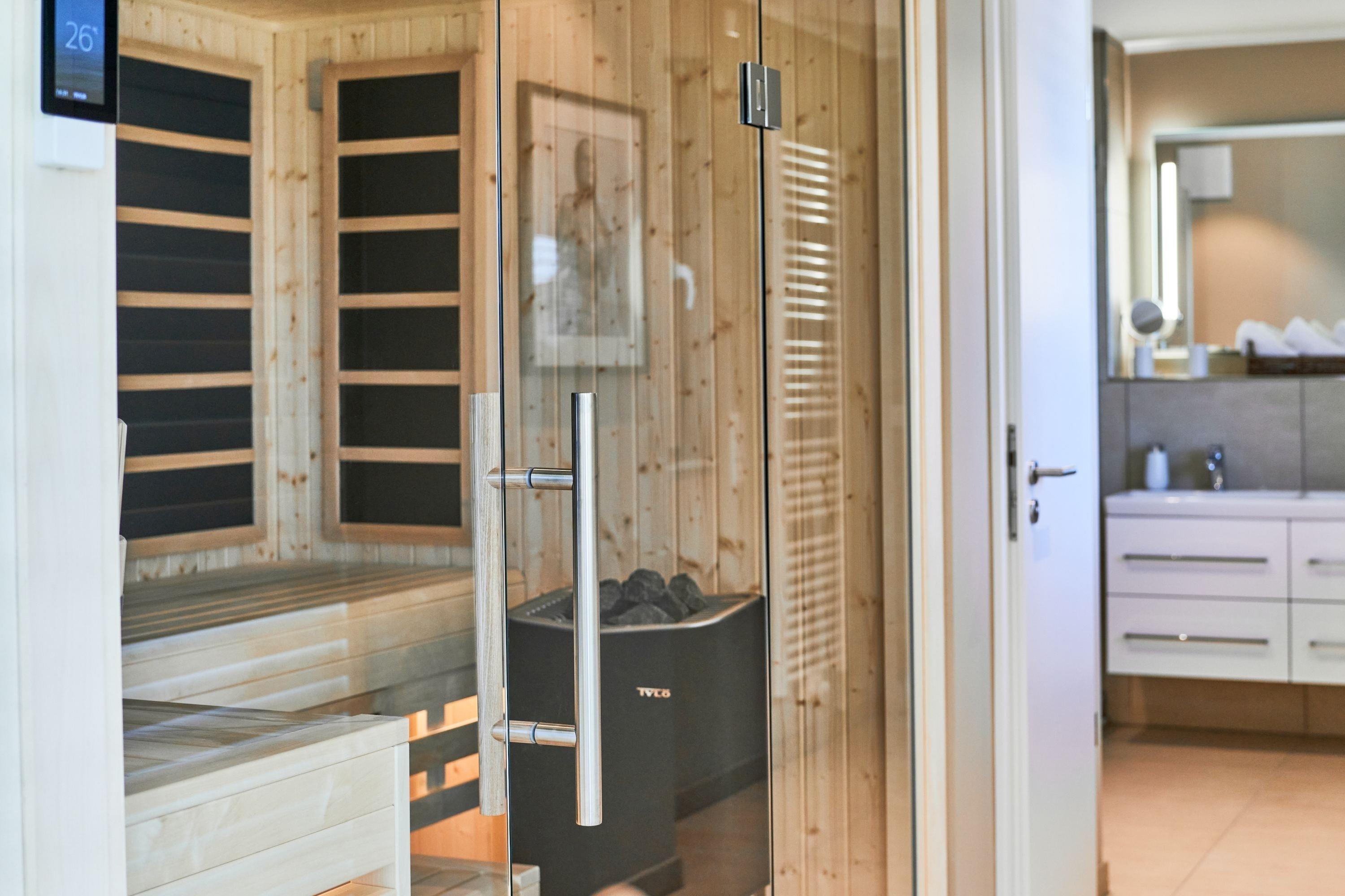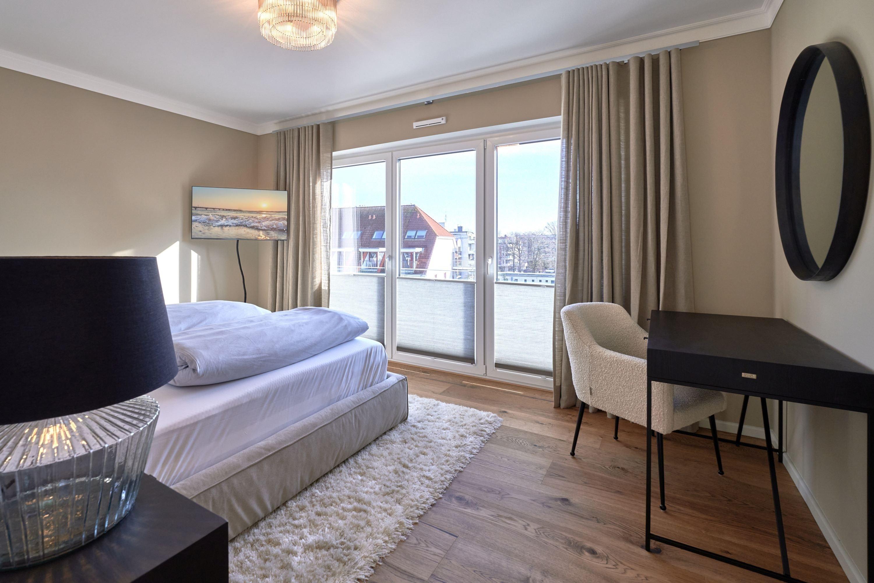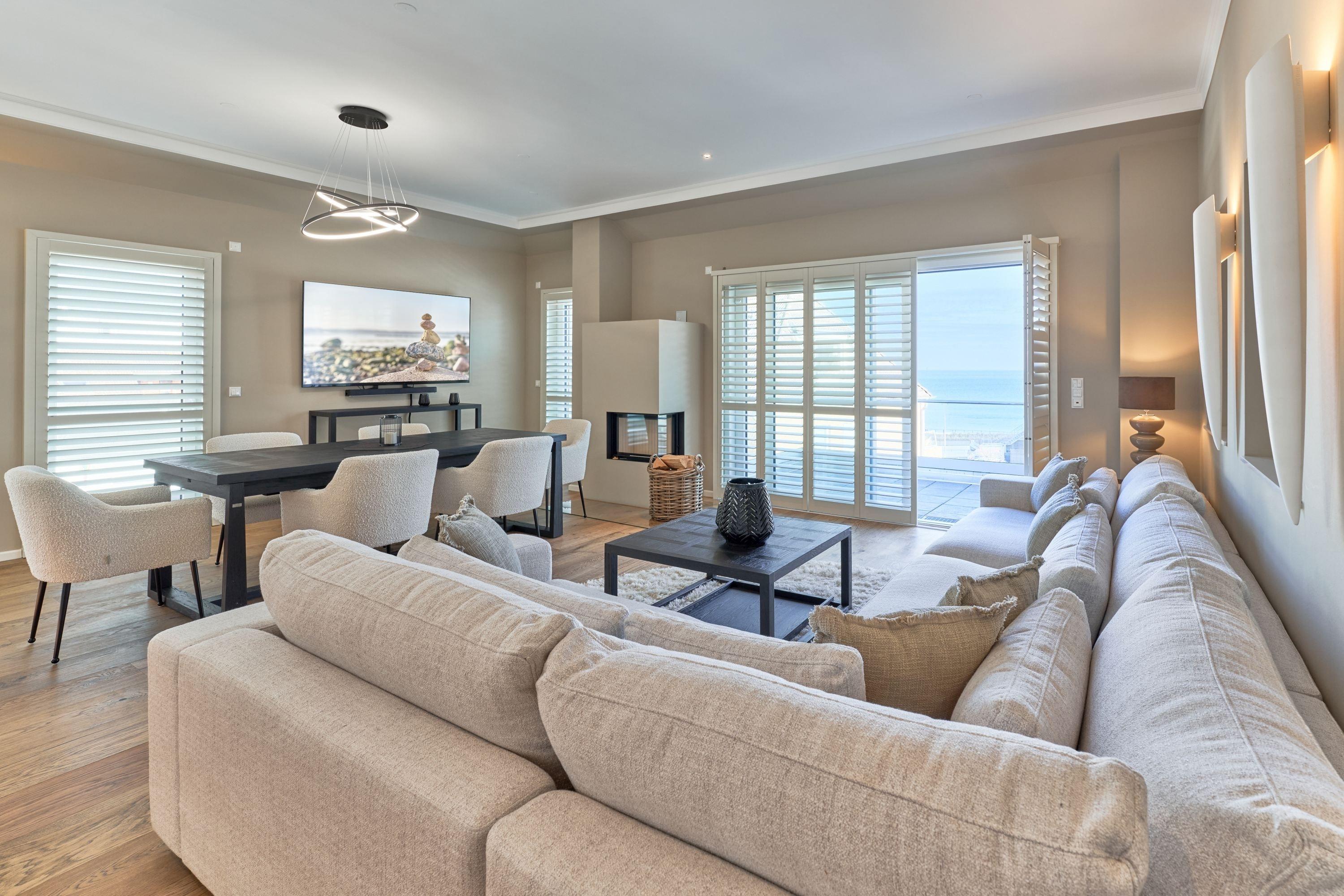 Der Wohn-Essbereich bietet Ihnen bei der Größe von ca. 50m² ein angenehmes Flair. Es erwartet Sie eine voll ausgestattete Küche. Die Kochinsel lädt Sie und Ihre Lieben herzlich zum gemeinsamen Kochen ein. Ein Weinklimaschrank sorgt für die ideale Temperatur Ihres Lieblingsweins. Alle weiteren Annehmlichkeiten wie Spülmaschine, Mikrowelle, Induktionsherd, Backofen, Gefrierschrank, Kaffee- und Nespresso-Maschine und vieles mehr sind für Sie in der Wohnung vorhanden. Der Esstisch bietet Ihnen genügend Platz, auch für fröhliche Spieleabende. Sitzen oder liegen Sie gerne auf der feinen Sofalandschaft? Hier dürfen Sie beides in voller Gemütlichkeit genießen. Kuscheln Sie sich in weiche Decken und verbringen Sie Ihre Abende vor dem wärmenden Kamin. Kuschelfaktor pur! Für das Technische ist selbstverständlich auch gesorgt.[nbsp][nbsp]Der 75-Zoll-Smart-TV, W-LAN, 100 MBit sowie ein Soundbar-System, welches per Bluetooth gesteuert werden kann. Die vier Schlafzimmer sind je mit einem Smart-TV(43 bis 55 Zoll) ausgestattet. Die Wohnung hat einen Büroraum, hier steht ein PC-Bildschirm zum Andocken bereit. Die Tageslichtbäder sind je mit einer bodentiefen Regendusche sowie mit einem Handtuchheizkörper ausgestattet, auch Waschmaschine und Trockner stehen bereit. Des Weiteren befinden sich noch zwei Gästetoiletten in der Wohnung. Wünschen Sie Wellness, ohne Ihren Wohlfühlort zu verlassen? Bitte sehr – auch hier haben die Eigentümer keine Wünsche offen gelassen. Sauna, Dampfdusche, Infrarotkabine, Badewanne und Relax-Bereich. Genießen Sie einen Blick auf die Ostsee!