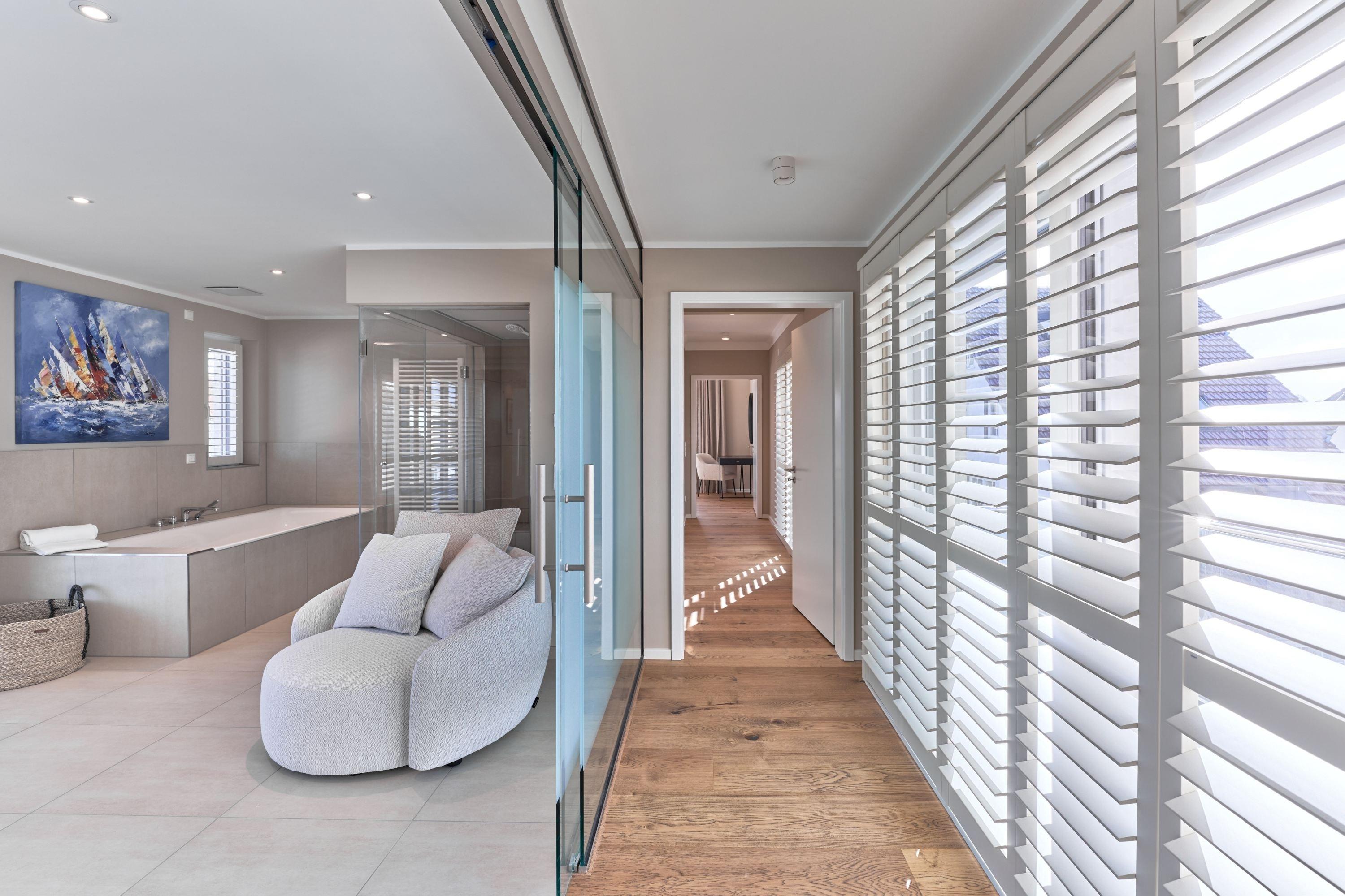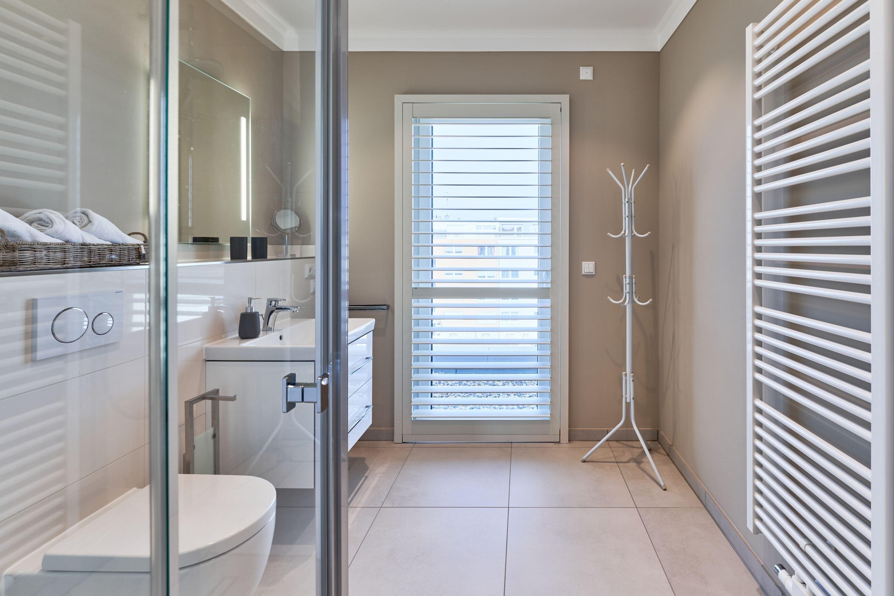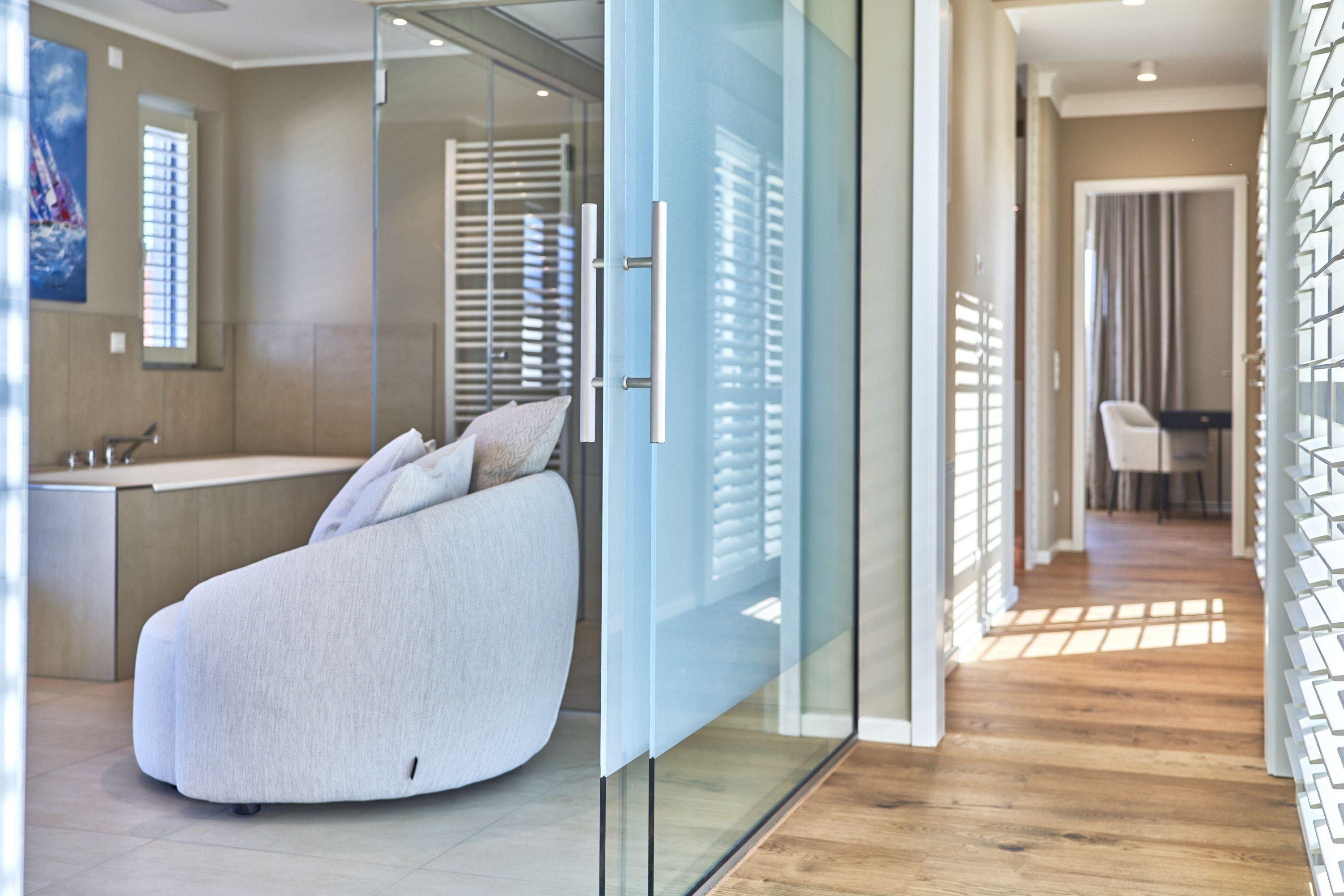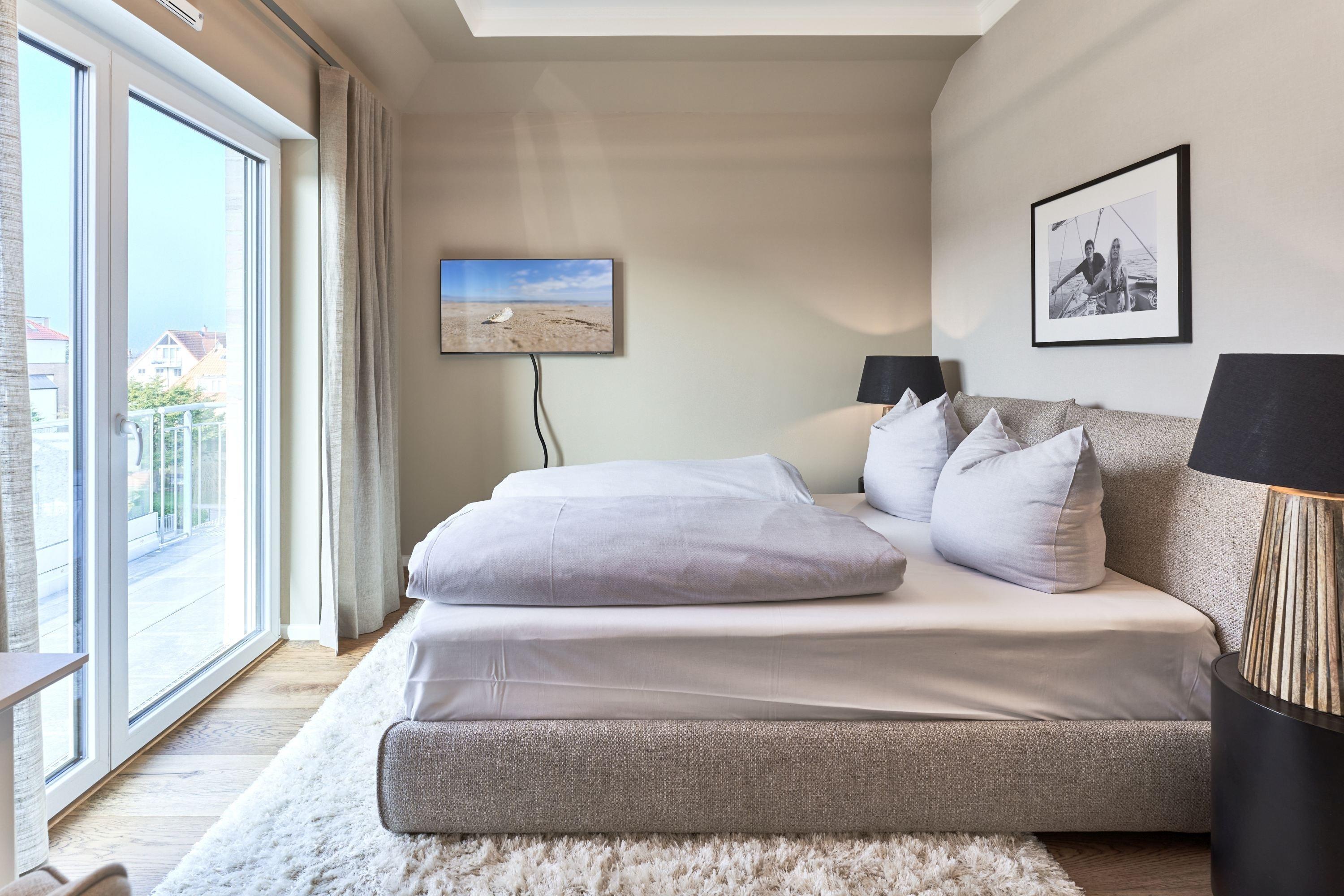 Der Wohn-Essbereich bietet Ihnen bei der Größe von ca. 50m² ein angenehmes Flair. Es erwartet Sie eine voll ausgestattete Küche. Die Kochinsel lädt Sie und Ihre Lieben herzlich zum gemeinsamen Kochen ein. Ein Weinklimaschrank sorgt für die ideale Temperatur Ihres Lieblingsweins. Alle weiteren Annehmlichkeiten wie Spülmaschine, Mikrowelle, Induktionsherd, Backofen, Gefrierschrank, Kaffee- und Nespresso-Maschine und vieles mehr sind für Sie in der Wohnung vorhanden. Der Esstisch bietet Ihnen genügend Platz, auch für fröhliche Spieleabende. Sitzen oder liegen Sie gerne auf der feinen Sofalandschaft? Hier dürfen Sie beides in voller Gemütlichkeit genießen. Kuscheln Sie sich in weiche Decken und verbringen Sie Ihre Abende vor dem wärmenden Kamin. Kuschelfaktor pur! Für das Technische ist selbstverständlich auch gesorgt.[nbsp][nbsp]Der 75-Zoll-Smart-TV, W-LAN, 100 MBit sowie ein Soundbar-System, welches per Bluetooth gesteuert werden kann. Die vier Schlafzimmer sind je mit einem Smart-TV(43 bis 55 Zoll) ausgestattet. Die Wohnung hat einen Büroraum, hier steht ein PC-Bildschirm zum Andocken bereit. Die Tageslichtbäder sind je mit einer bodentiefen Regendusche sowie mit einem Handtuchheizkörper ausgestattet, auch Waschmaschine und Trockner stehen bereit. Des Weiteren befinden sich noch zwei Gästetoiletten in der Wohnung. Wünschen Sie Wellness, ohne Ihren Wohlfühlort zu verlassen? Bitte sehr – auch hier haben die Eigentümer keine Wünsche offen gelassen. Sauna, Dampfdusche, Infrarotkabine, Badewanne und Relax-Bereich. Genießen Sie einen Blick auf die Ostsee!