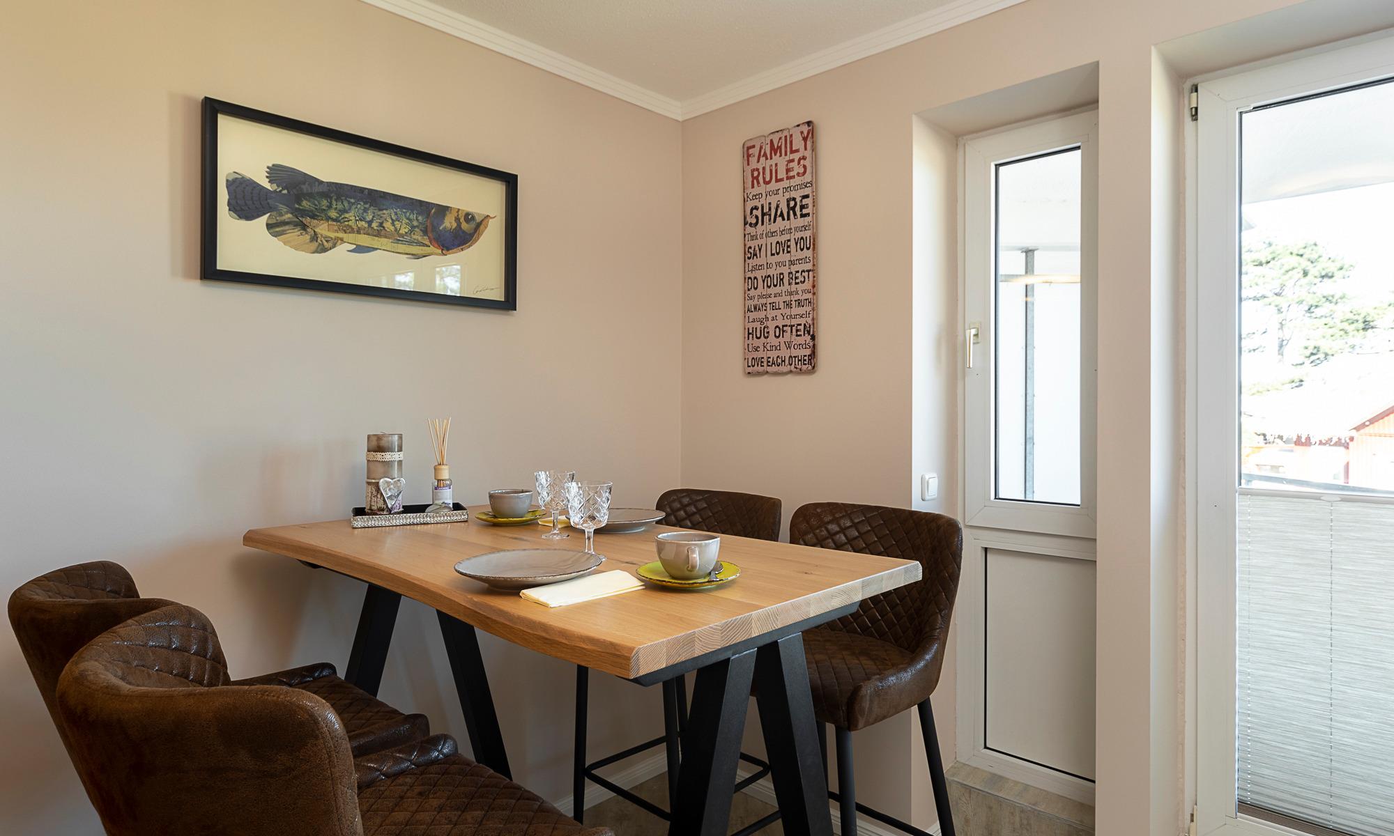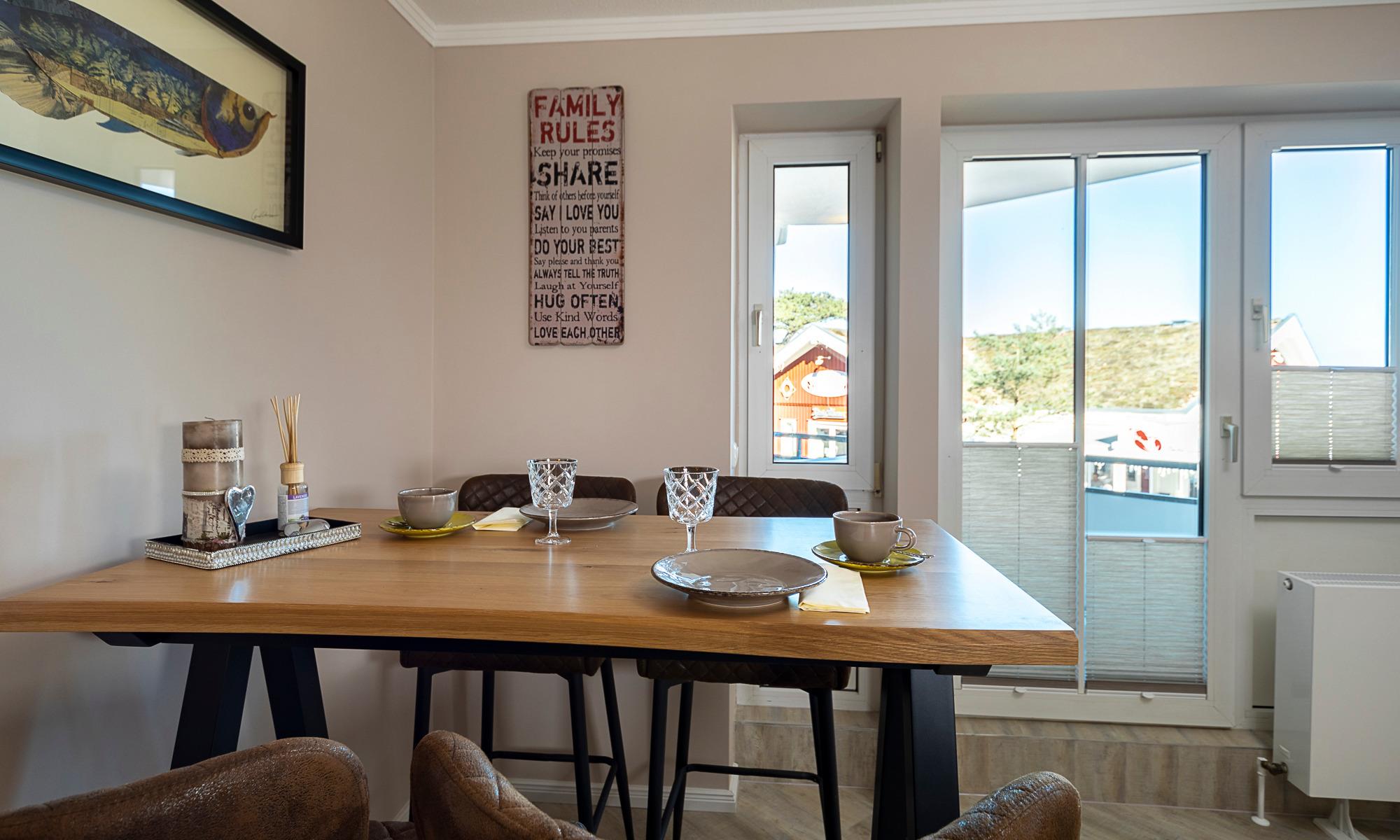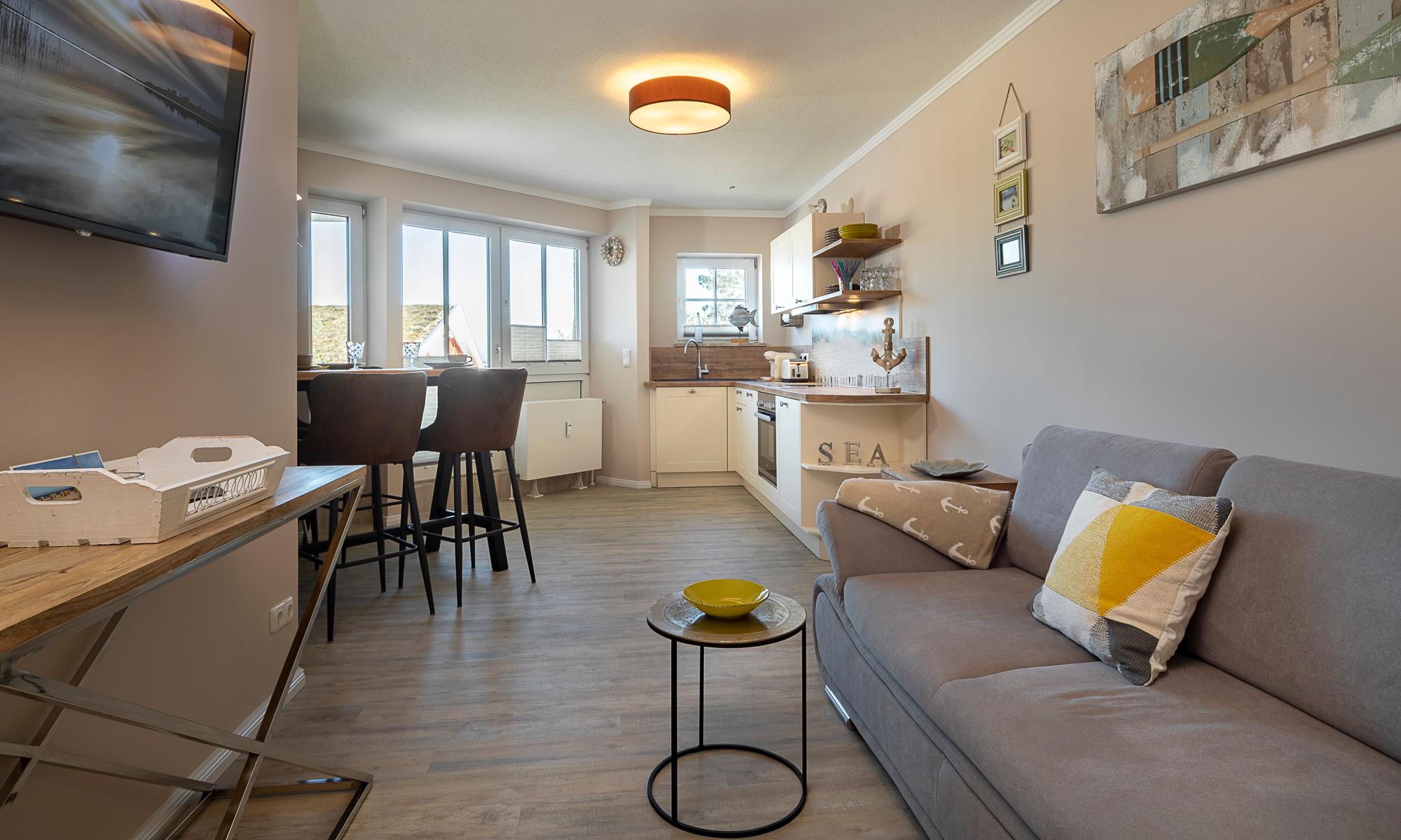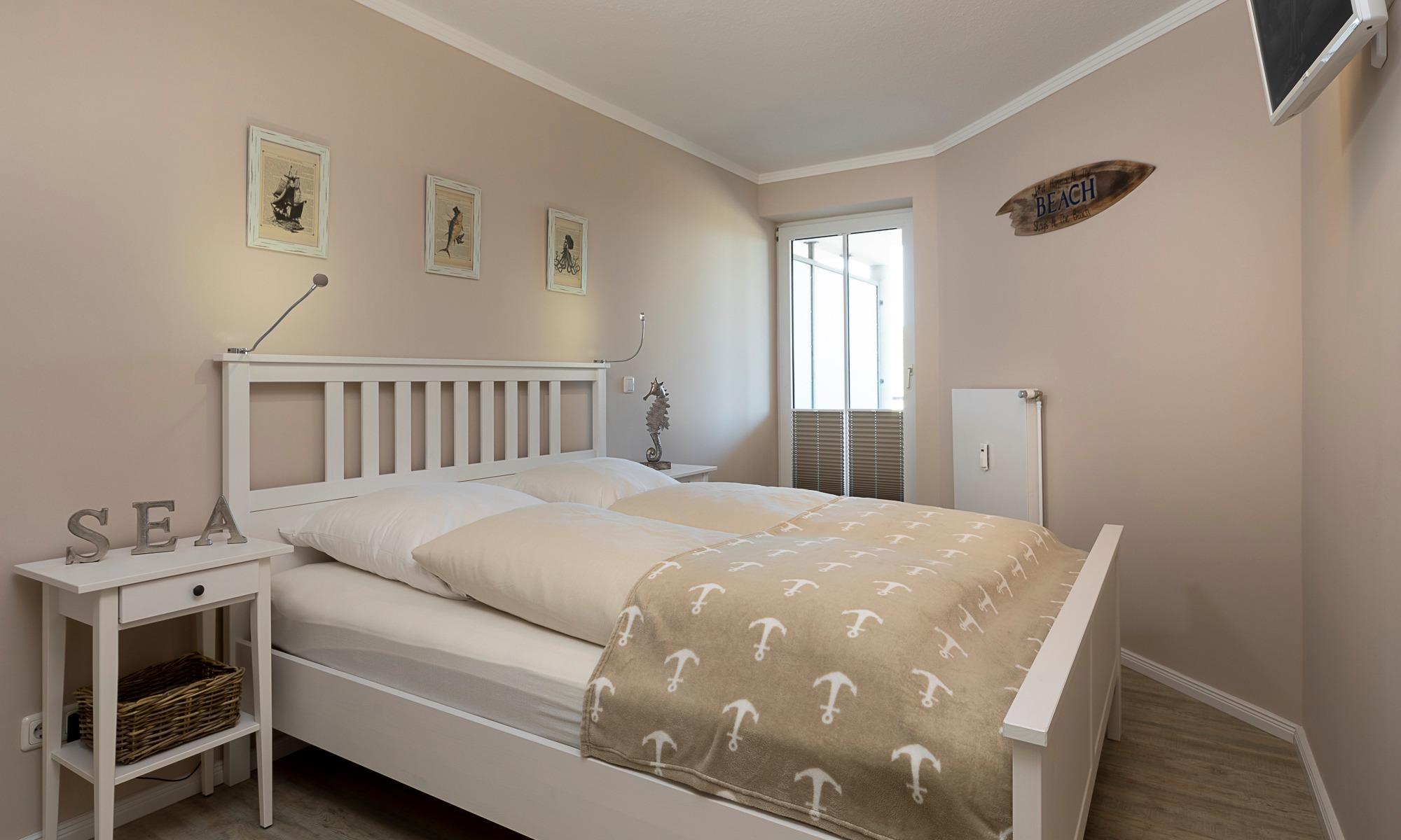 Der Wohn-Essbereich ist mit einer bequemen Couch (welche schnell in ein komfortables Schlafsofa umgebaut werden kann), einem Sessel sowie Beistelltischchen eingerichtet. Neben dem Flachbildfernseher steht Ihnen selbstverständlich kostenloses WLAN zur Verfügung. Die helle Küche mit angrenzendem Esstisch ist komplett ausgestattet. Schöne überdachte Loggia mit Morgensonne und Blick auf die Ostsee. Hier stehen Ihnen Tisch und Stühle zur Verfügung. Das Schlafzimmer ist mit einem Doppelbett (1,60 x 2,00m) und einem geräumigen Kleiderschrank sowie einem Flachbildfernseher ausgestattet. Auch von hier aus haben Sie einen Ostseeblick und Zugang zur Loggia. Das Badezimmer verfügt über eine bodentiefe Dusche und einen Handtuchheizkörper. Eine sehr angenehme Lösung in dieser Wohnung ist das separate WC.