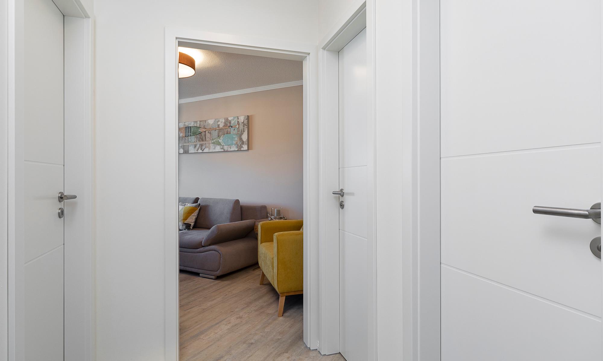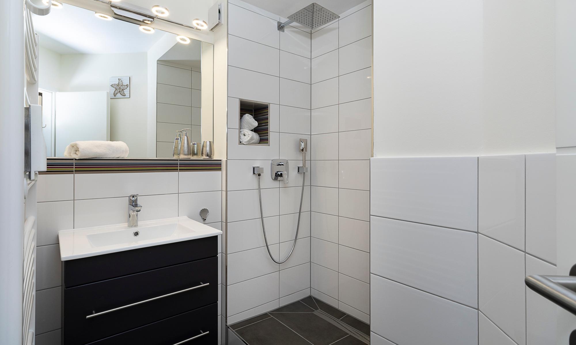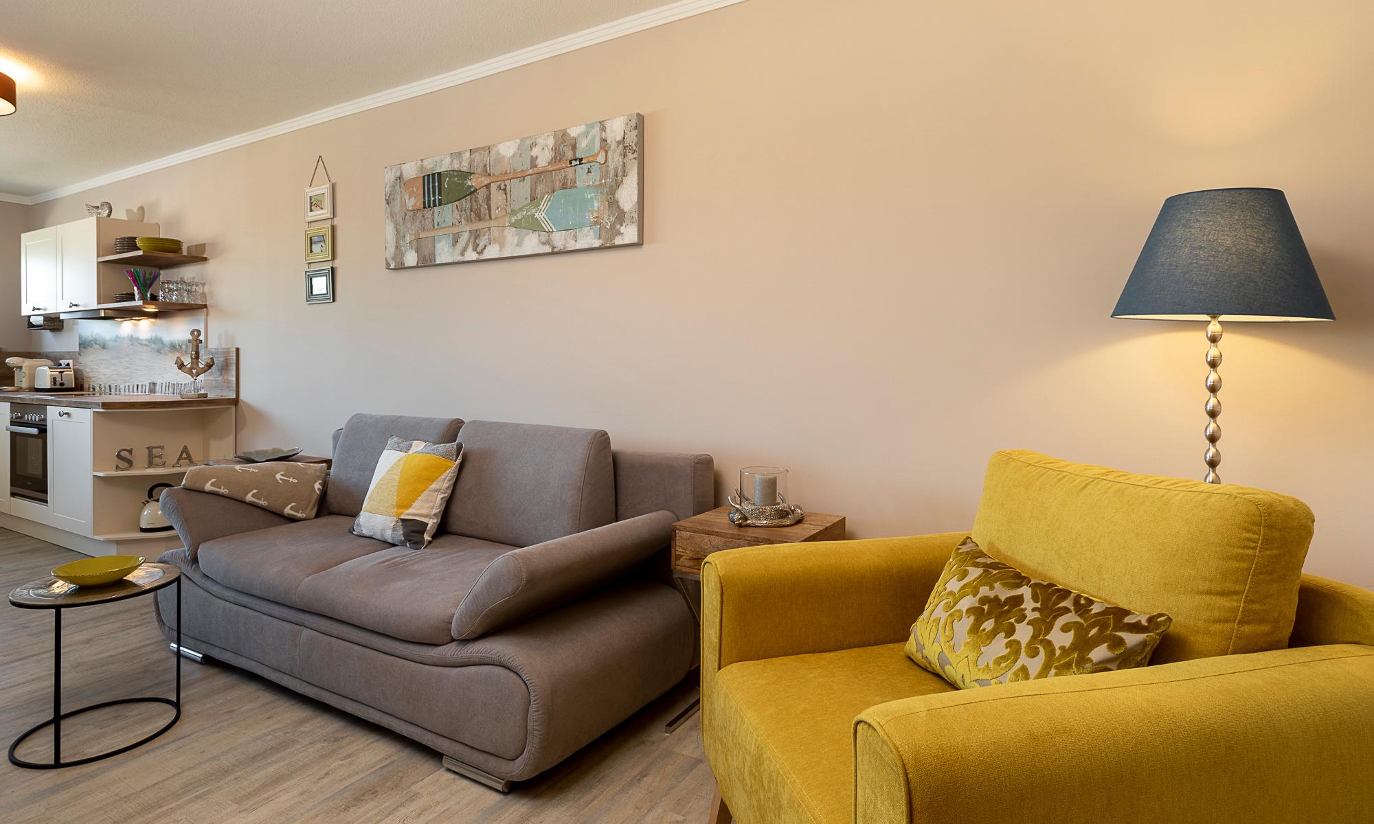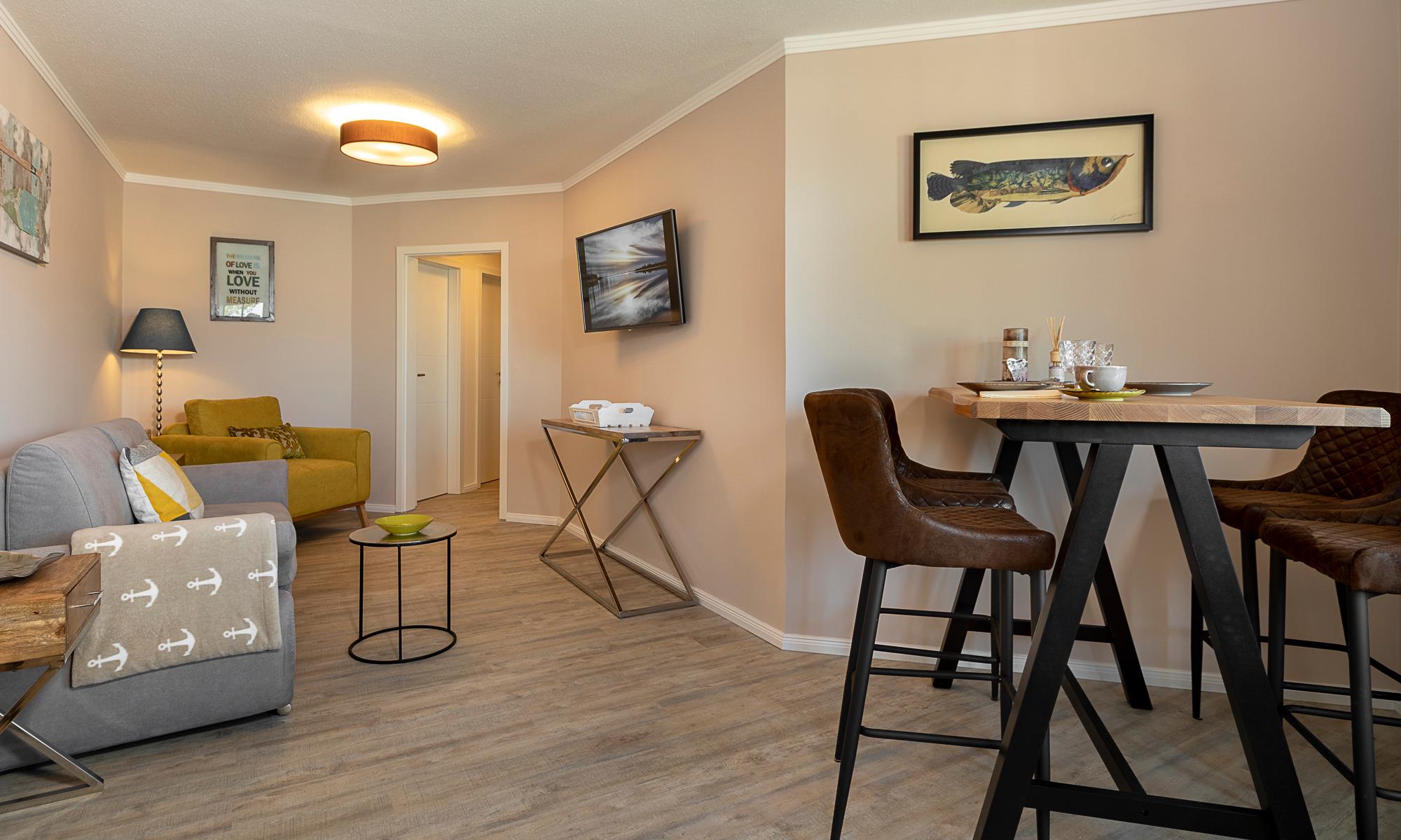 Der Wohn-Essbereich ist mit einer bequemen Couch (welche schnell in ein komfortables Schlafsofa umgebaut werden kann), einem Sessel sowie Beistelltischchen eingerichtet. Neben dem Flachbildfernseher steht Ihnen selbstverständlich kostenloses WLAN zur Verfügung. Die helle Küche mit angrenzendem Esstisch ist komplett ausgestattet. Schöne überdachte Loggia mit Morgensonne und Blick auf die Ostsee. Hier stehen Ihnen Tisch und Stühle zur Verfügung. Das Schlafzimmer ist mit einem Doppelbett (1,60 x 2,00m) und einem geräumigen Kleiderschrank sowie einem Flachbildfernseher ausgestattet. Auch von hier aus haben Sie einen Ostseeblick und Zugang zur Loggia. Das Badezimmer verfügt über eine bodentiefe Dusche und einen Handtuchheizkörper. Eine sehr angenehme Lösung in dieser Wohnung ist das separate WC.