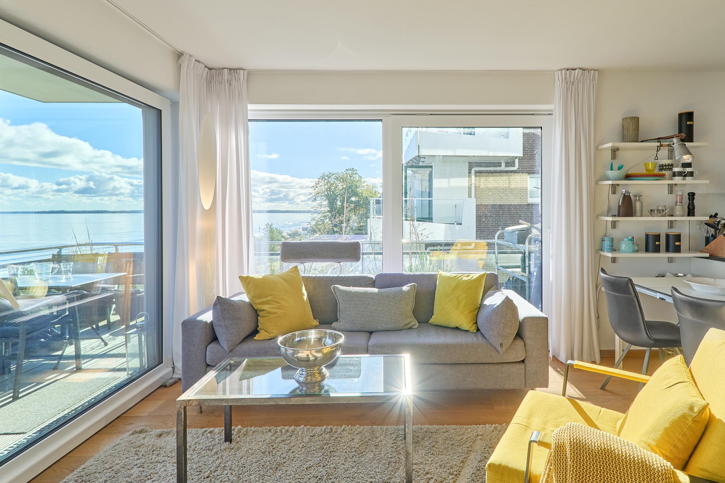 Bereits im Flur können Sie schon auf die Ostsee blicken und weiter … Aus allen Räumen haben Sie Ostseeblick! In dieser traumhaften Wohnung werden Sie sich gleich wohlfühlen.[nbsp] Das Sofa bietet Ihnen einen besonderen Sitzkomfort. Ihr Heimkinosystem bietet Ihnen Blu-ray, TV in 55 Zoll und ein 3-D-Soundsystem. Der Essbereich hat genügend Platz für vier Personen. Die anspruchsvolle Küche ist mit hochwertigen Elektrogeräten ausgestattet. Geschirrspülmaschine, Induktionsherd, Mikrowelle, Backofen, Wasserkocher, Kaffeemaschine, Pad-Kaffeemaschine und vieles mehr. Der halbumlaufende Balkon ist mit Loungemöbeln ausgestattet – träumen Sie schon?