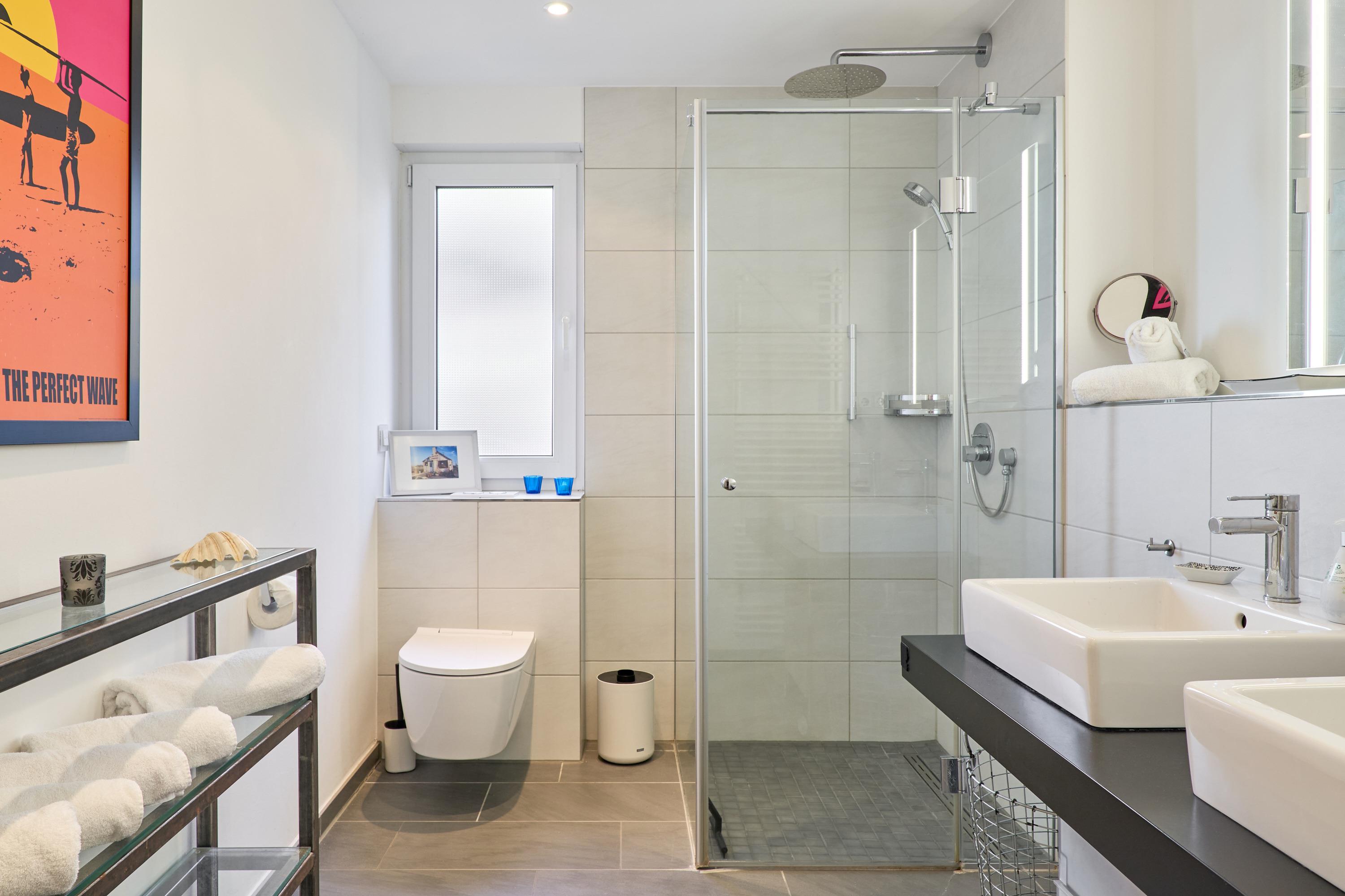 Das große Schlafzimmer ist mit einem Doppelbett (180 x 200m) und einem geräumigen Kleiderschrank ausgestattet. Das zweite Schlafzimmer verfügt über ein französisches Doppelbett (160 x 200m), einen Flach-TV und einen Kleiderschrank. Die beiden Tageslichtbäder haben jeweils eine ebenerdige Duschkabine. In dem zweiten Badezimmer befindet sich eine Waschmaschine mit Trocknerfunktion.
