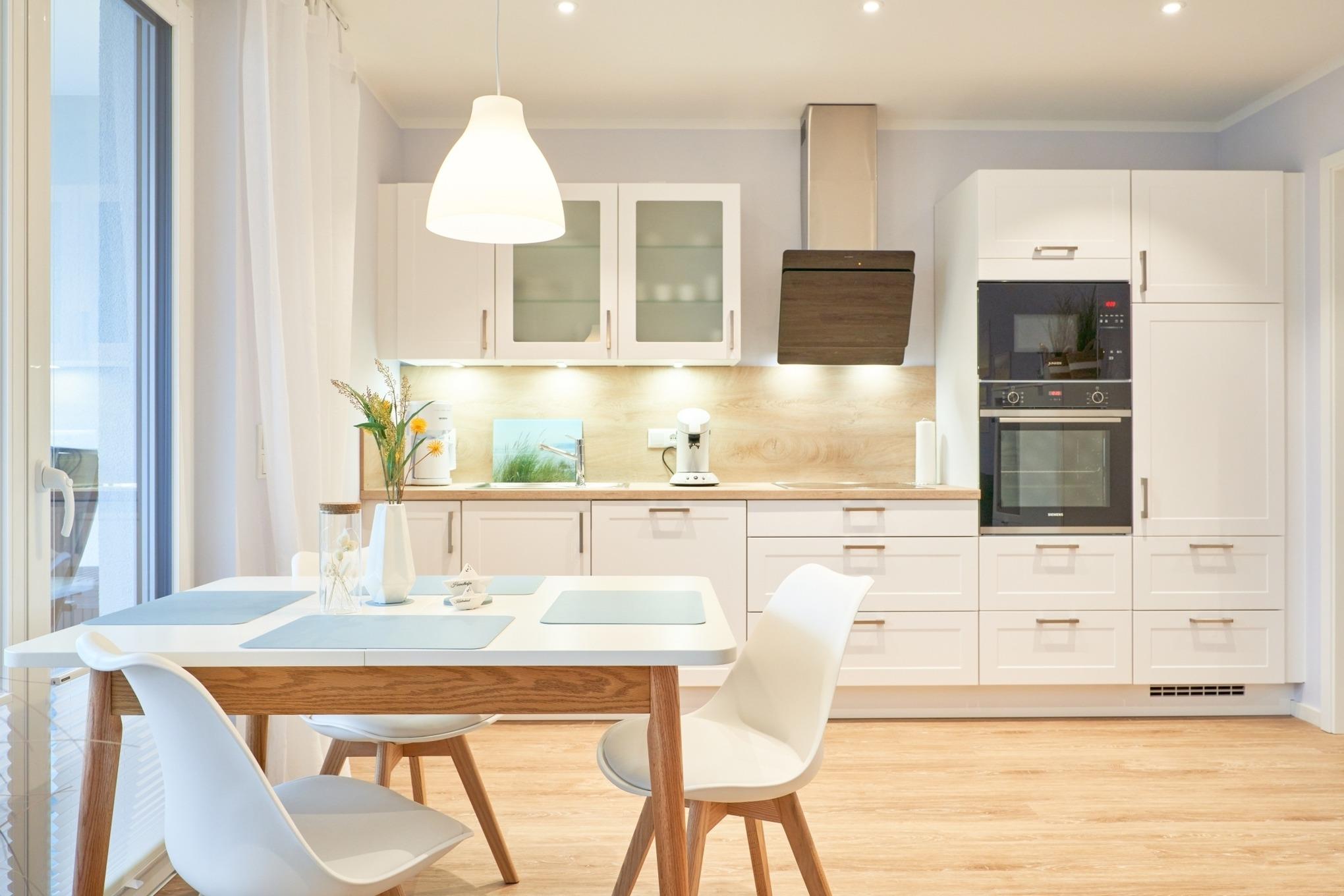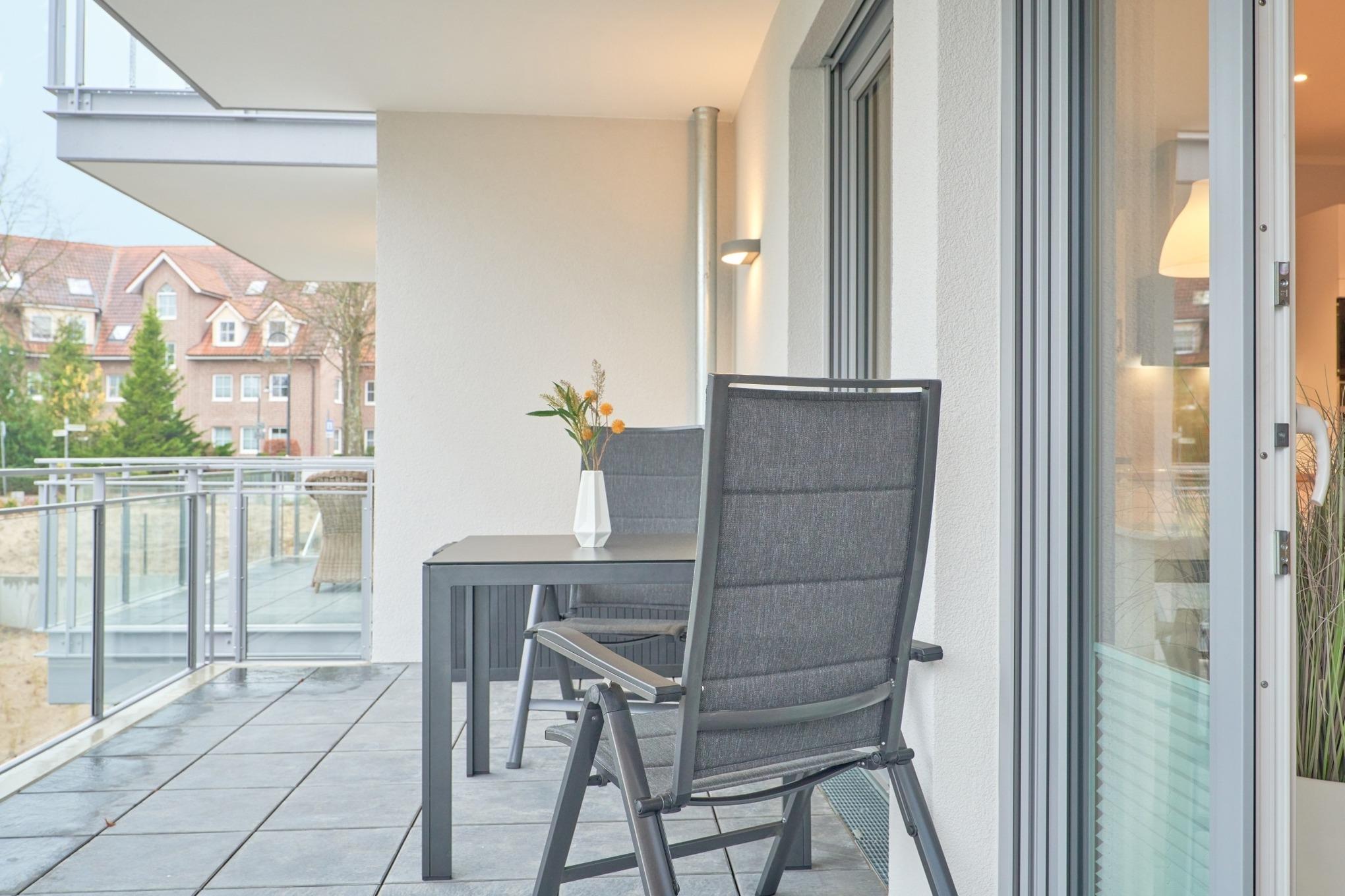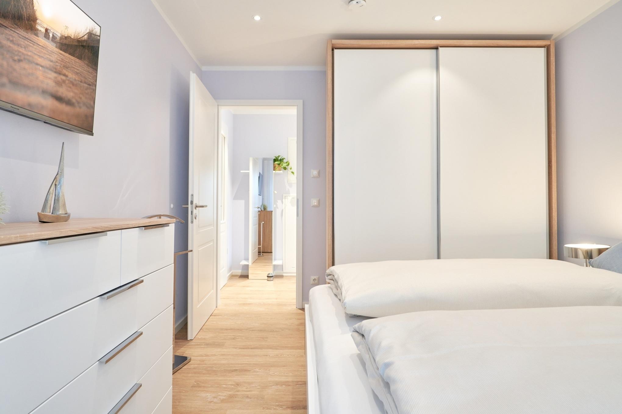 Die 2-Zimmer-Ferienwohnung ist mit bodentiefen Fenstern ausgestattet. An allen Fenstern befinden sich Licht- und Sichtschutz sowie Außenrollläden. Die hochwertige Nobilia-Einbauküche im Wohn-Essbereich ist komplett ausgestattet und lässt keine Wünsche offen; Küchenzeile mit erhöhtem Backofen, Ceran-Kochfeld, Mikrowelle, Geschirrspüler, Kühlschrank mit Gefrierfach, Filterkaffeemaschine mit Thermoskanne, Senseo-Kaffeemaschine, Senseo-Milchaufschäumer, Eierkocher, Mixer, Toaster und Wasserkocher. Der Wohnbereich ist mit einem hochwertigen Sofa, einem Wohnzimmertisch, einem schwenkbaren Smart-TV sowie einem Essbereich ausgestattet. Aus dem Wohnbereich gelangen Sie auf den herrlichen, überdachten Süd-Ost-Balkon. Hier stehen Ihnen Tisch und Stühle zur Verfügung. Das Schlafzimmer ist mit einer hochwertigen Nolte-Bettanlage, Bettengröße 1,80mx2,00m, einzelnen Schlaraffia-Matratzen in H2 und H3 ausgestattet. Kleiderschrank, 2 Nachttische sowie ein Wand-TV. Sind Sie es gewohnt, im Dunkeln zu schlafen? Kein Problem, denn es stehen Ihnen elektrische Außenrollläden zur Verfügung. Das Duschbad in heller Optik mit bodengleicher Dusche / Regendusche, mit separater Handbrause, Handtuchheizkörper, Fön, Kosmetikspiegel, Bad-WLAN-Radio. Die gesamte Wohnung ist mit einer Fußbodenheizung ausgestattet.