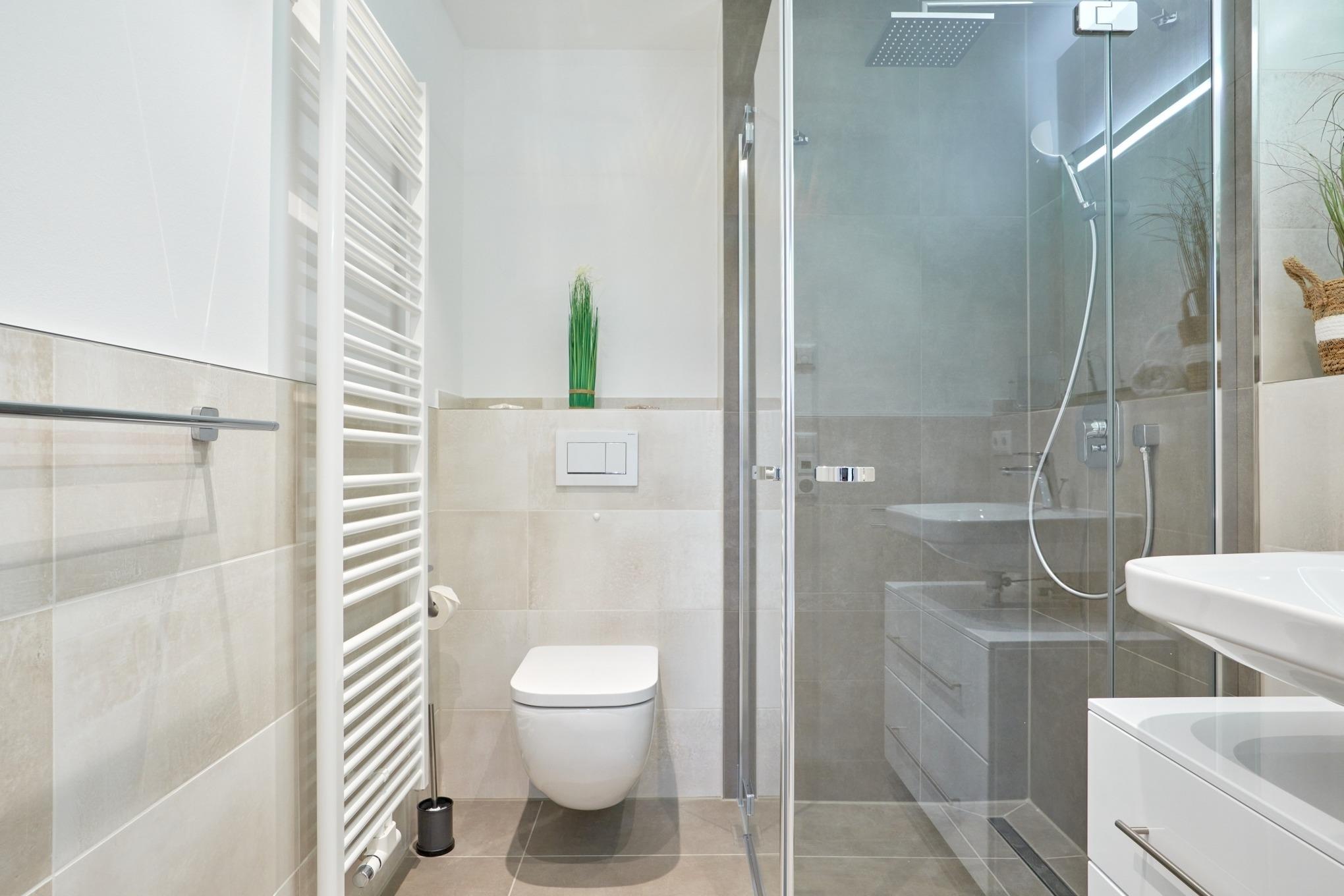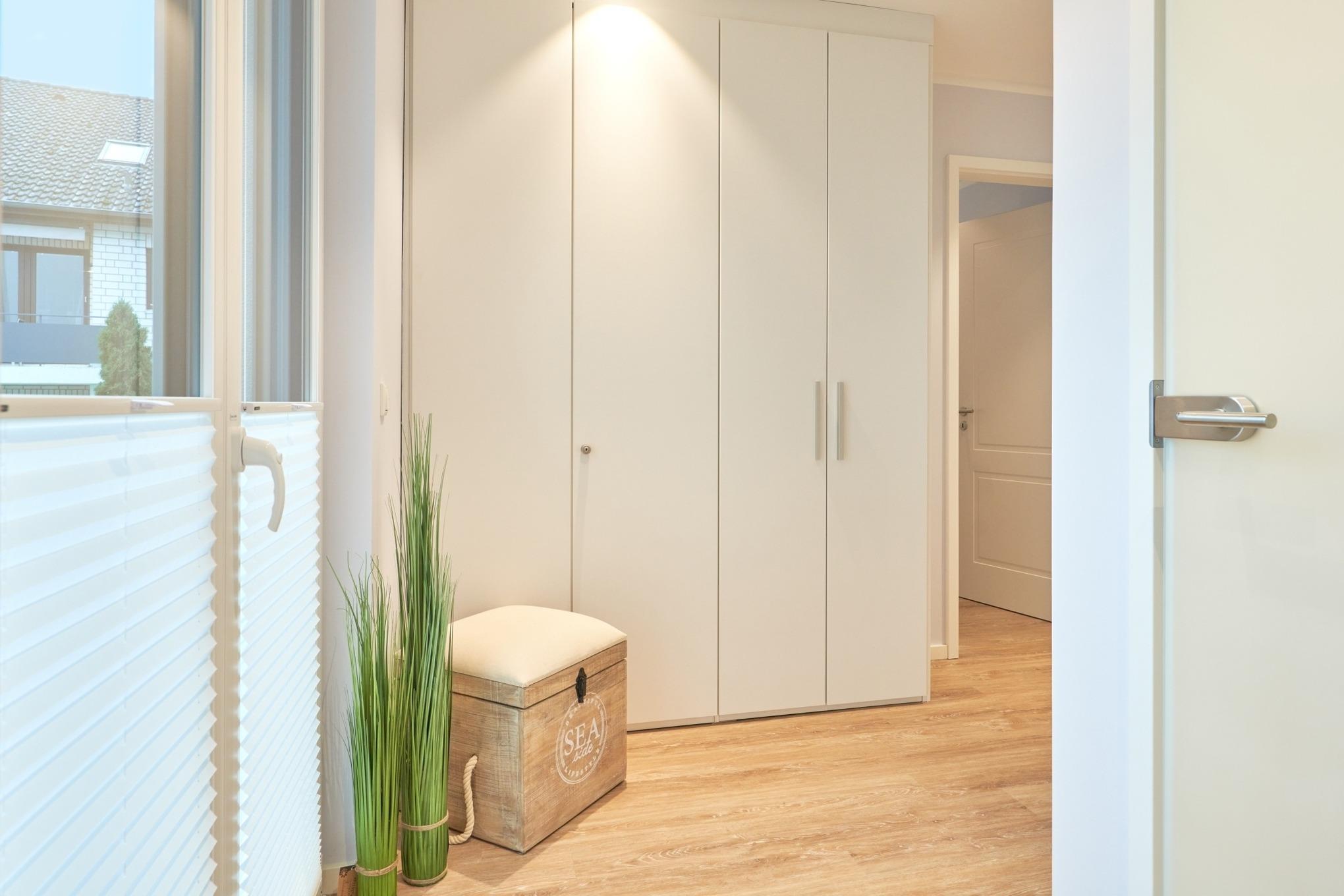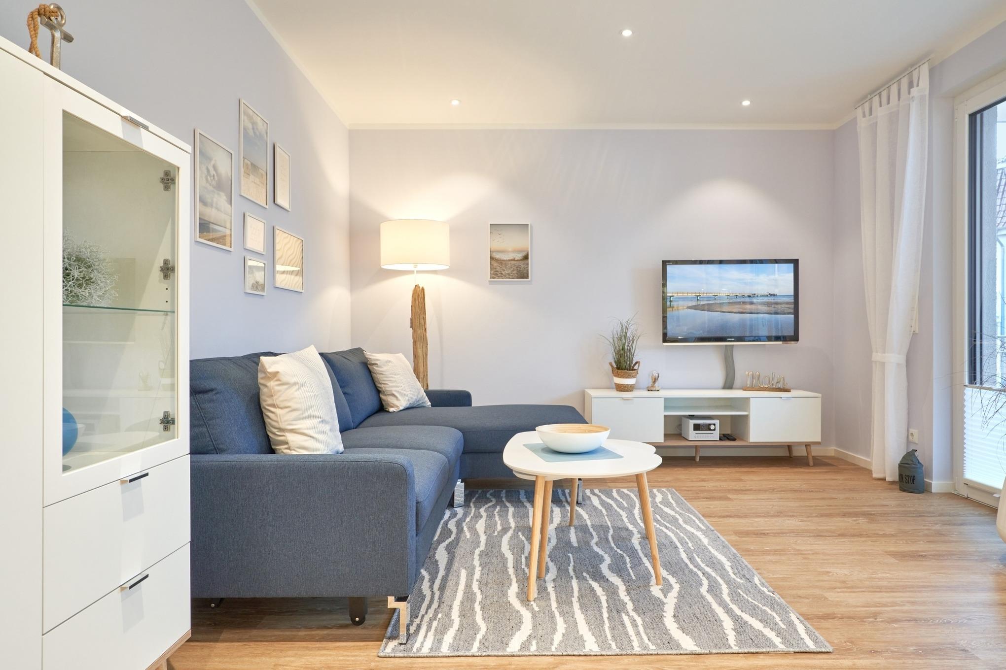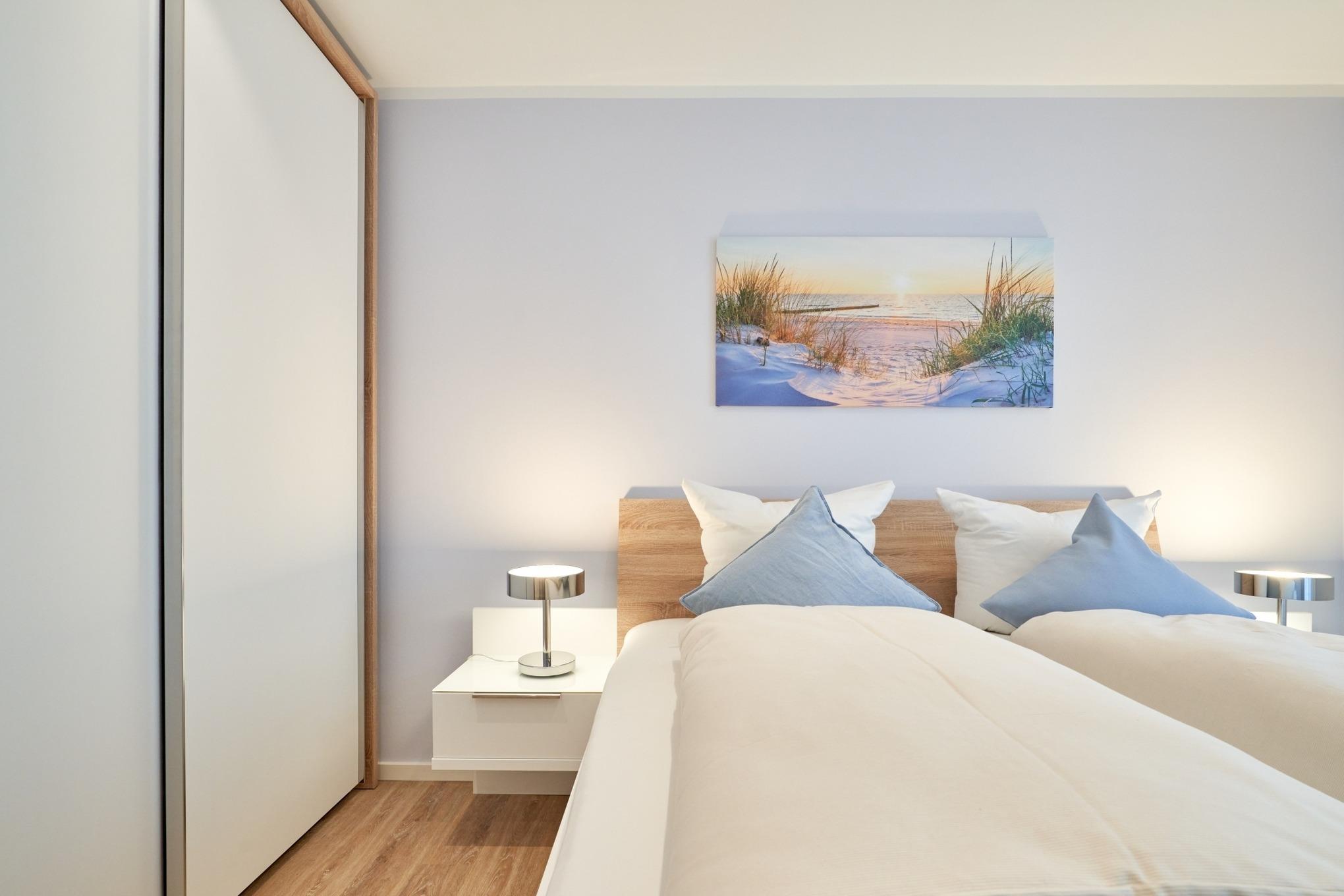 Die 2-Zimmer-Ferienwohnung ist mit bodentiefen Fenstern ausgestattet. An allen Fenstern befinden sich Licht- und Sichtschutz sowie Außenrollläden. Die hochwertige Nobilia-Einbauküche im Wohn-Essbereich ist komplett ausgestattet und lässt keine Wünsche offen; Küchenzeile mit erhöhtem Backofen, Ceran-Kochfeld, Mikrowelle, Geschirrspüler, Kühlschrank mit Gefrierfach, Filterkaffeemaschine mit Thermoskanne, Senseo-Kaffeemaschine, Senseo-Milchaufschäumer, Eierkocher, Mixer, Toaster und Wasserkocher. Der Wohnbereich ist mit einem hochwertigen Sofa, einem Wohnzimmertisch, einem schwenkbaren Smart-TV sowie einem Essbereich ausgestattet. Aus dem Wohnbereich gelangen Sie auf den herrlichen, überdachten Süd-Ost-Balkon. Hier stehen Ihnen Tisch und Stühle zur Verfügung. Das Schlafzimmer ist mit einer hochwertigen Nolte-Bettanlage, Bettengröße 1,80mx2,00m, einzelnen Schlaraffia-Matratzen in H2 und H3 ausgestattet. Kleiderschrank, 2 Nachttische sowie ein Wand-TV. Sind Sie es gewohnt, im Dunkeln zu schlafen? Kein Problem, denn es stehen Ihnen elektrische Außenrollläden zur Verfügung. Das Duschbad in heller Optik mit bodengleicher Dusche / Regendusche, mit separater Handbrause, Handtuchheizkörper, Fön, Kosmetikspiegel, Bad-WLAN-Radio. Die gesamte Wohnung ist mit einer Fußbodenheizung ausgestattet.