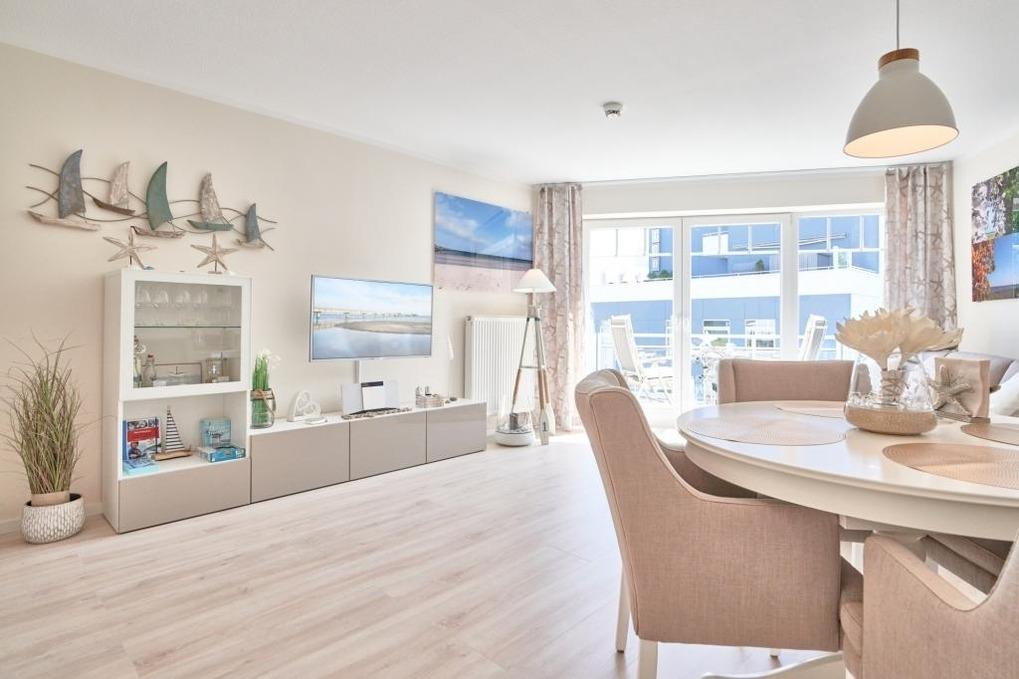 Das Duschbad ist in heller Optik gehalten. Der ansprechende Wohnbereich ist mit einer schönen Küchenzeile, einem Essbereich sowie einem gemütlichen Wohnbereich mit einer Sofaecke (Schlafsofa) ausgestattet. Neben einem Flachbildfernseher steht Ihnen selbstverständlich kostenloses WLAN zur Verfügung. Vom Wohnbereich aus gelangen Sie auf den Balkon. Von hier haben Sie einen schönen Ostseeblick. Die helle Küche lässt keine Wünsche offen. Der Esstisch bietet Ihnen ausreichend Platz für gesellige Stunden.