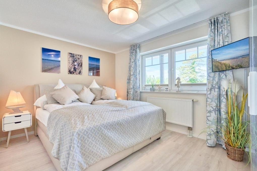 Der Eingangsbereich ist mit einer Garderobe ausgestattet. Das Schlafzimmer hat ein Boxspringbett (180 x 200m), zwei Nachttische sowie einen Kleiderschrank. Verdunkeln lässt sich das Schlafzimmer über ein Verdunklungsrollo sowie einen Verdunklungsvorhang.