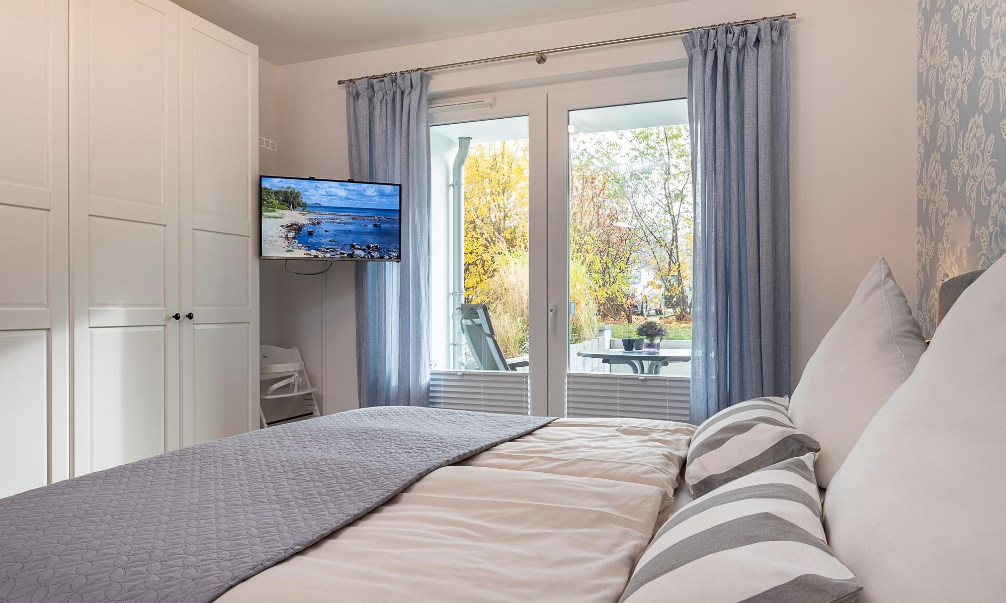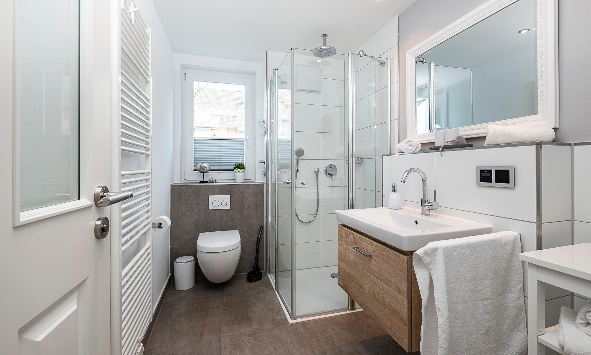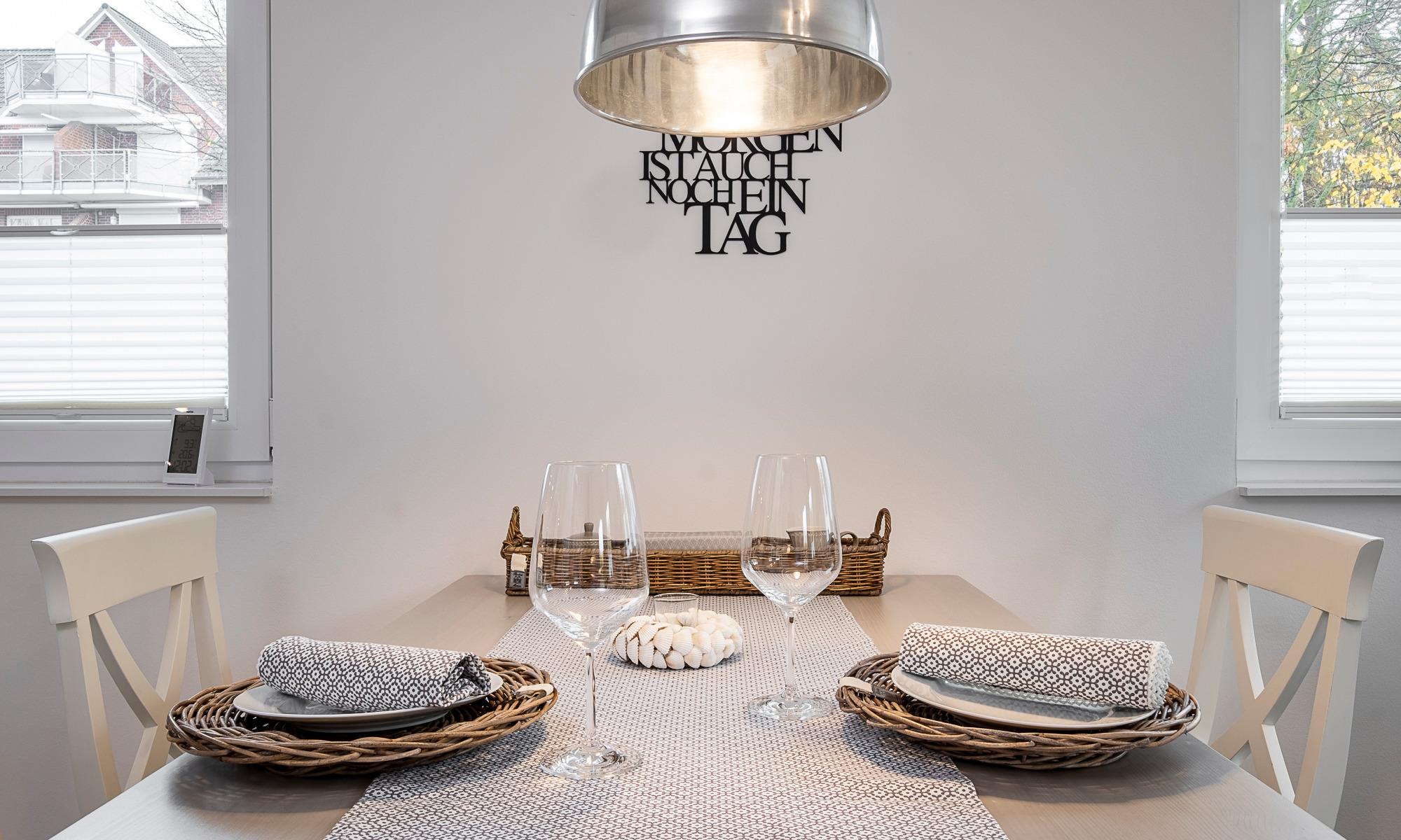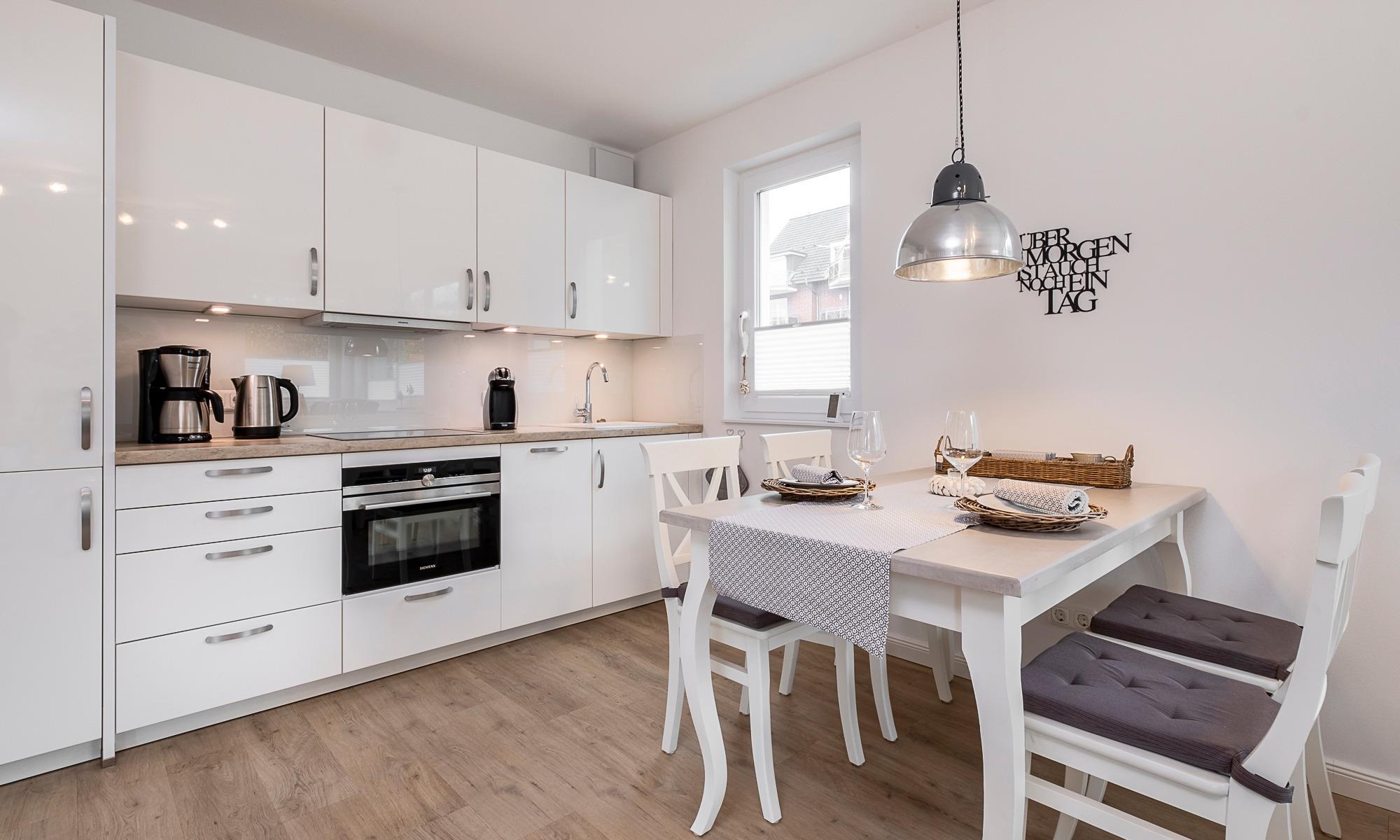 Diese geschmackvoll im Landhausstil eingerichtete Ferienwohnung bietet Ihnen einen gemütlichen Wohnbereich mit Couch und Sessel. Die Couch ist mit wenigen Handgriffen in eine bequeme Schlafcouch umwandelbar. Neben dem Flachbildfernseher und dem Blu-ray-Player steht Ihnen eine Stereoanlage zur Verfügung. Kostenloses WLAN ist selbstverständlich. Die Terrasse Richtung Süden ist mit Tisch und Stühlen ausgestattet. Die moderne Küche ist komplett ausgestattet und der Esstisch lädt zu geselligen Abenden ein. Das Schlafzimmer ist mit einem geräumigen Schrank und einem komfortablen Doppelbett (1,80x2,00m, durchgehender Topper ) und einem Flachbildfernseher ausgestattet. Zur Verdunkelung sind Plissees angebracht. Das helle Tageslichtbad verfügt über eine bodentiefe Dusche und einen großen Spiegel. Neben der Fußbodenheizung ist hier ein zusätzlicher Handtuchheizkörper angebracht.