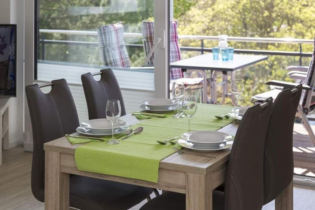 Im Wohn-Essbereich erwartet Sie eine dezente Küchenzeile mit abgetrennter Wand zum Flur und der Abluftführung in den Außenbereich. Ein ausziehbarer Esstisch mit 4 Stühlen, eine gemütliche Couch mit Couchtisch sowie ein TV-Flachbildschirm und W-LAN vervollständigen die Ausstattung. Alle Zimmer haben elektrische Außenrollläden. Der umlaufende Balkon lädt zum Entspannen ein und bietet einen Teilmeerblick.
